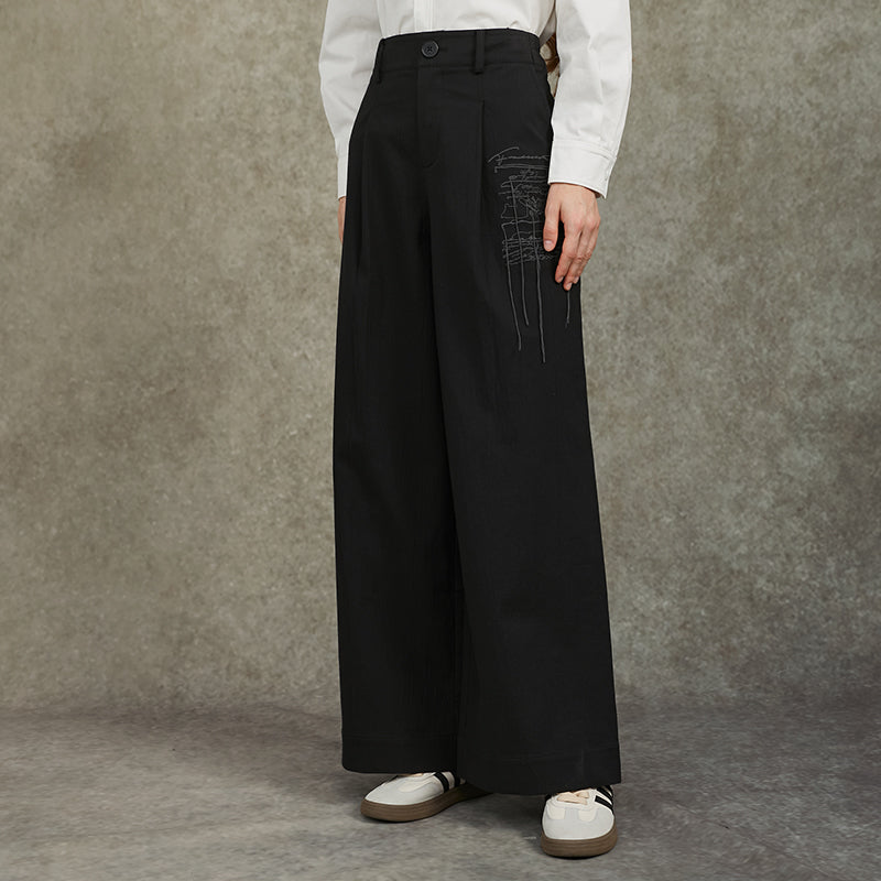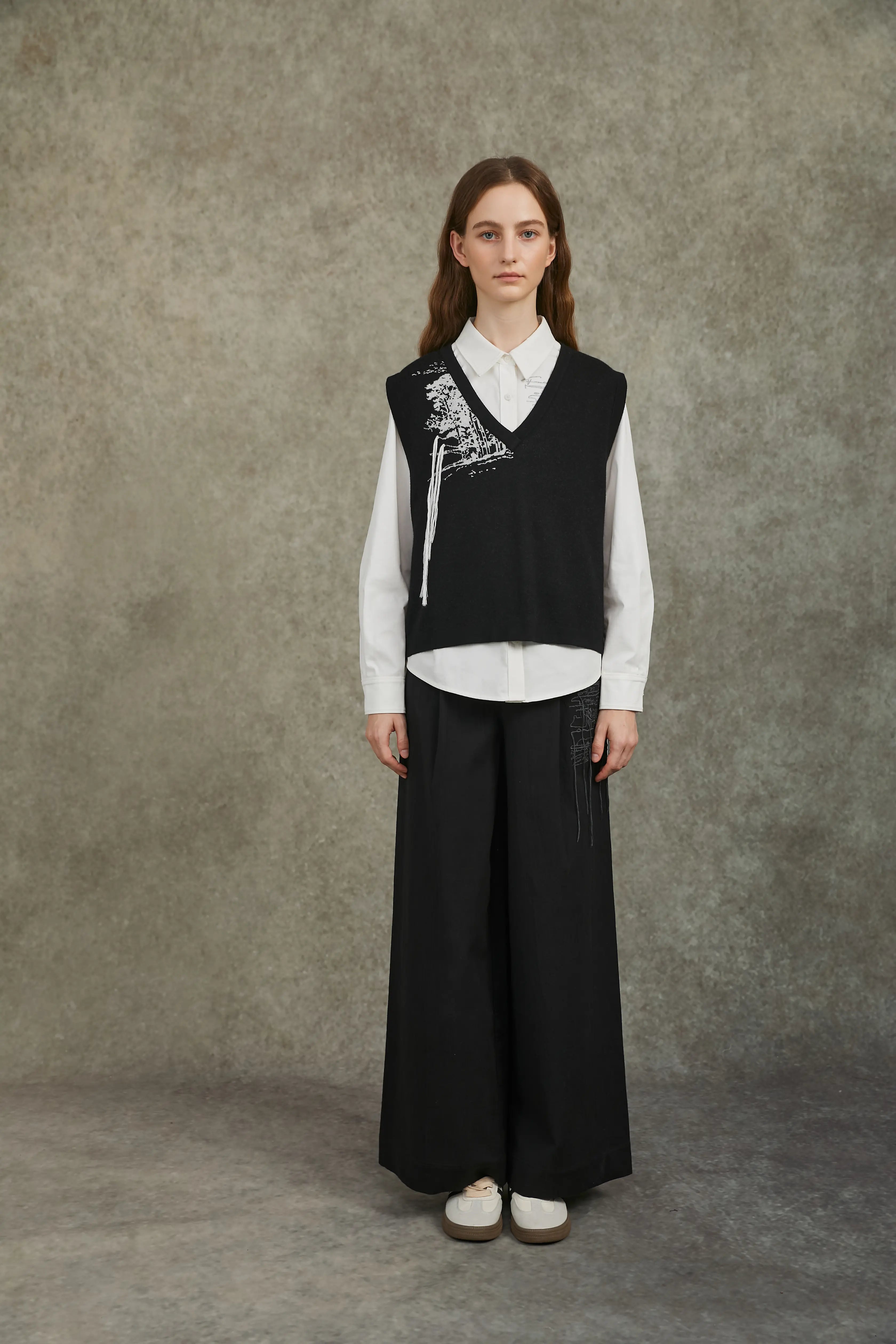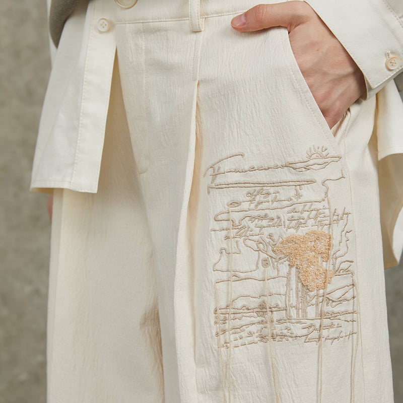 Wide‑leg trousers with a high waist and subtle embroidery detail. Crafted with a cotton‑rich blend for breathable comfort and layered texture, they balance minimalist tailoring with an artistic touch.