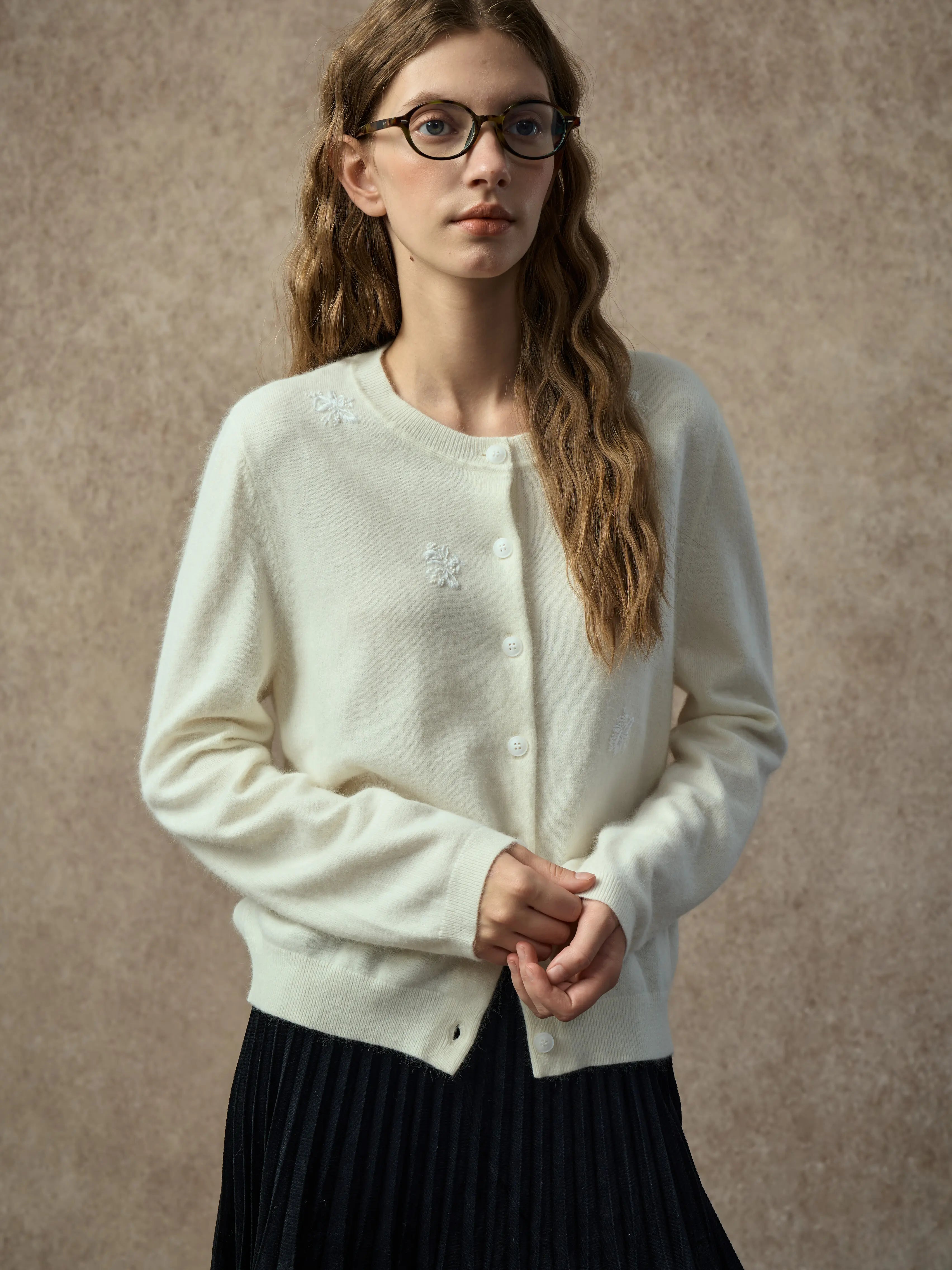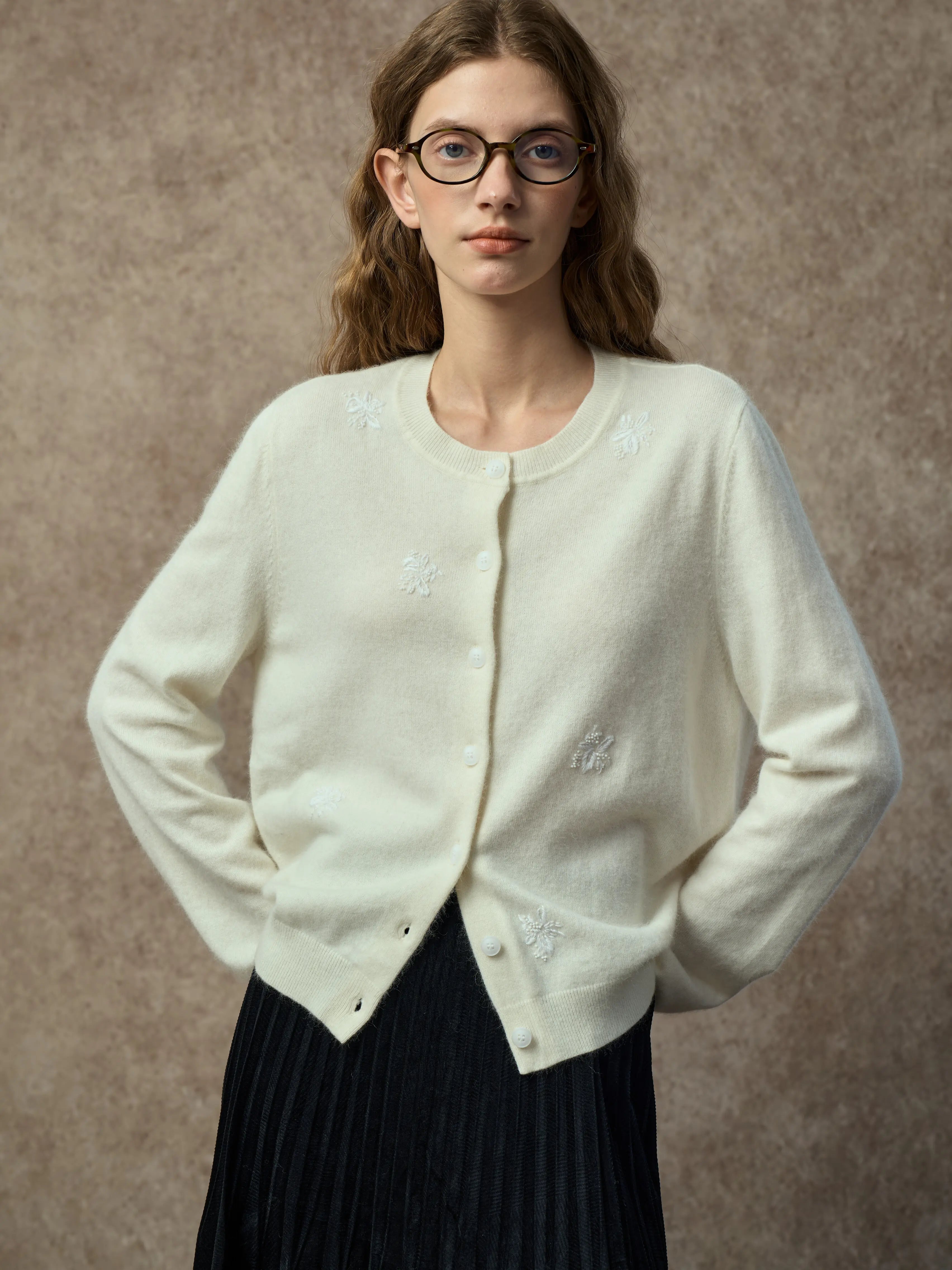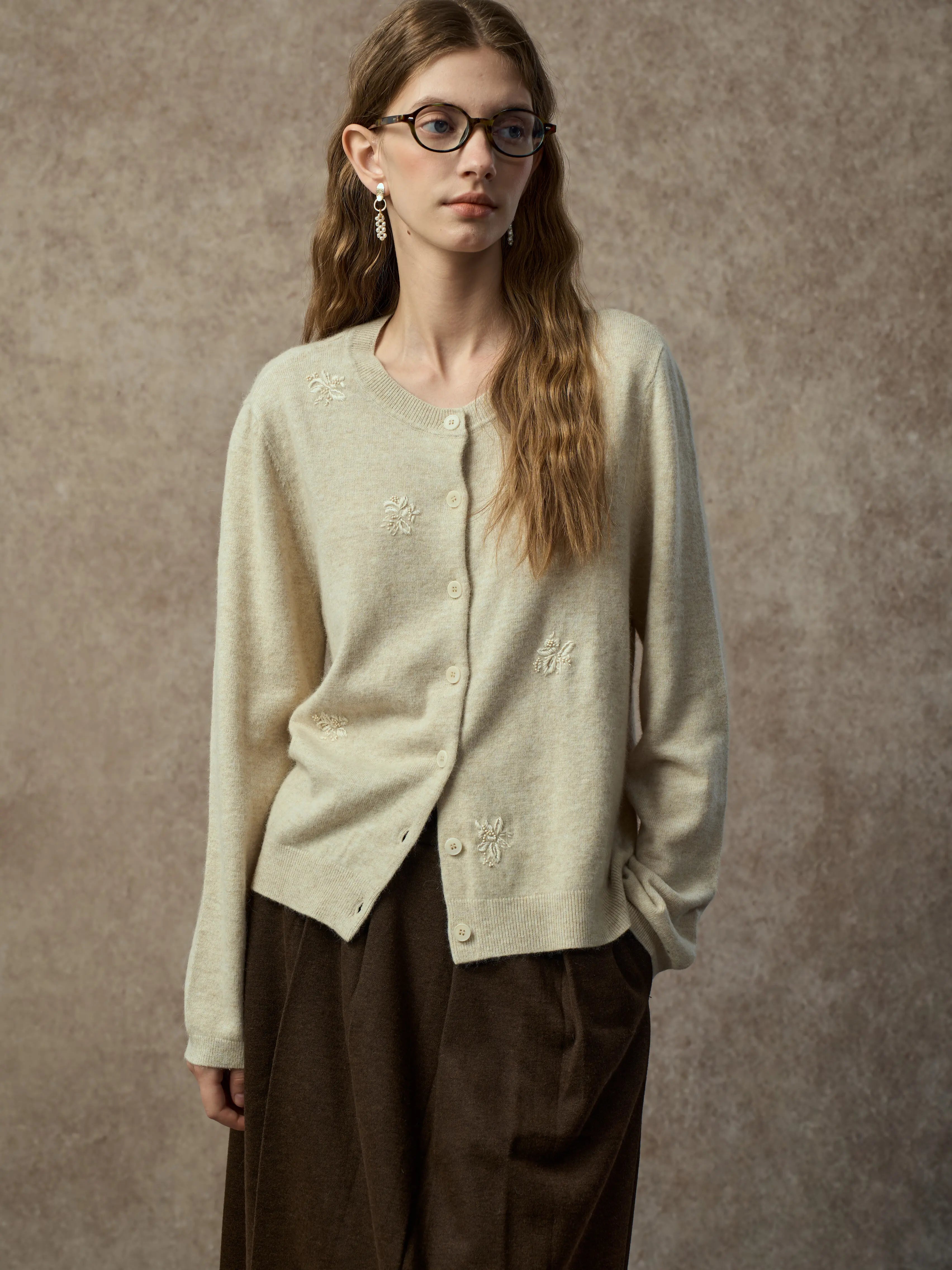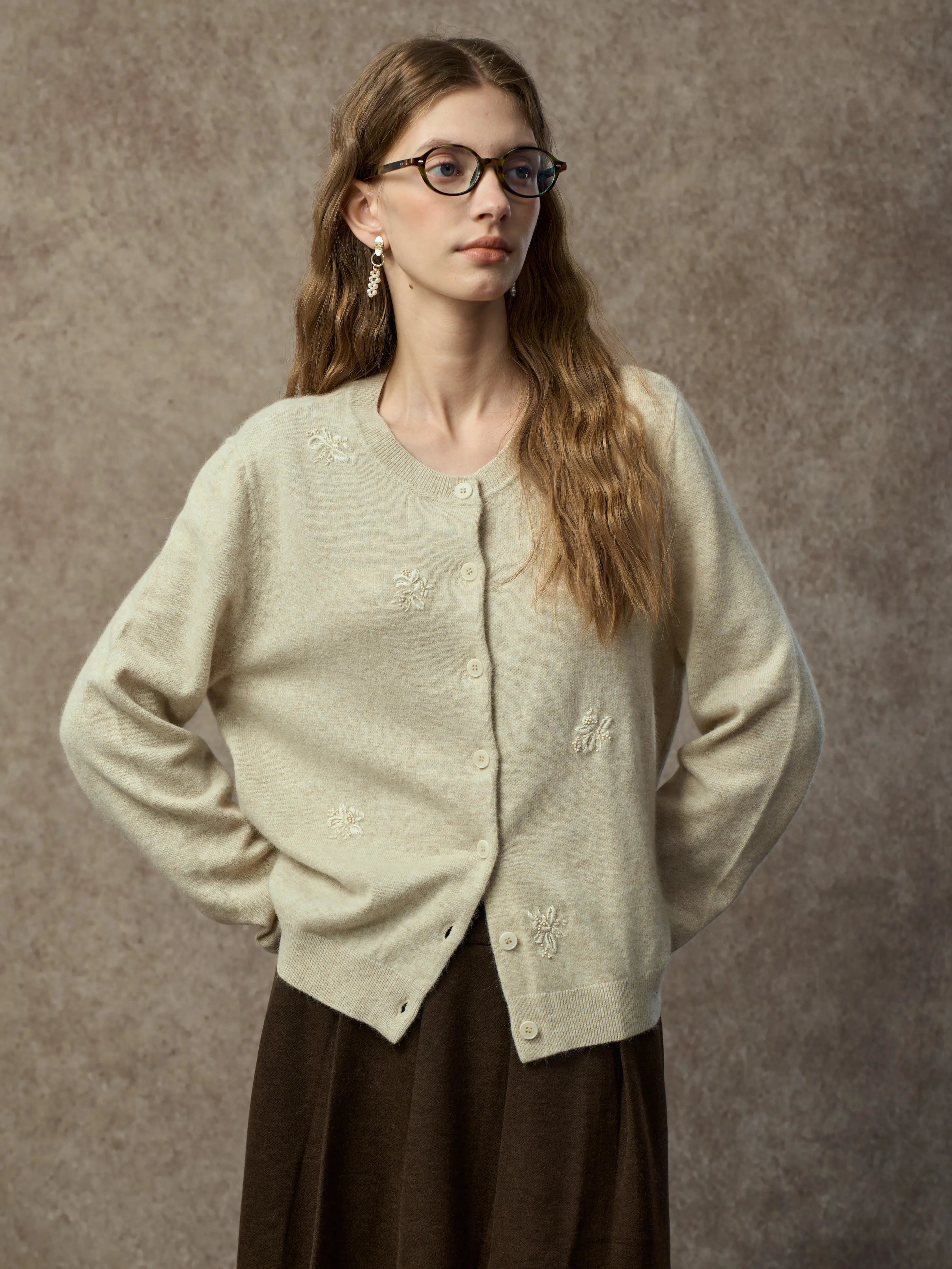 A soft wool-blend cardigan with delicate hand-beaded embroidery for an elegant touch. Features a classic crew neck and relaxed H-shape fit, making it easy to layer and flattering on all figures.