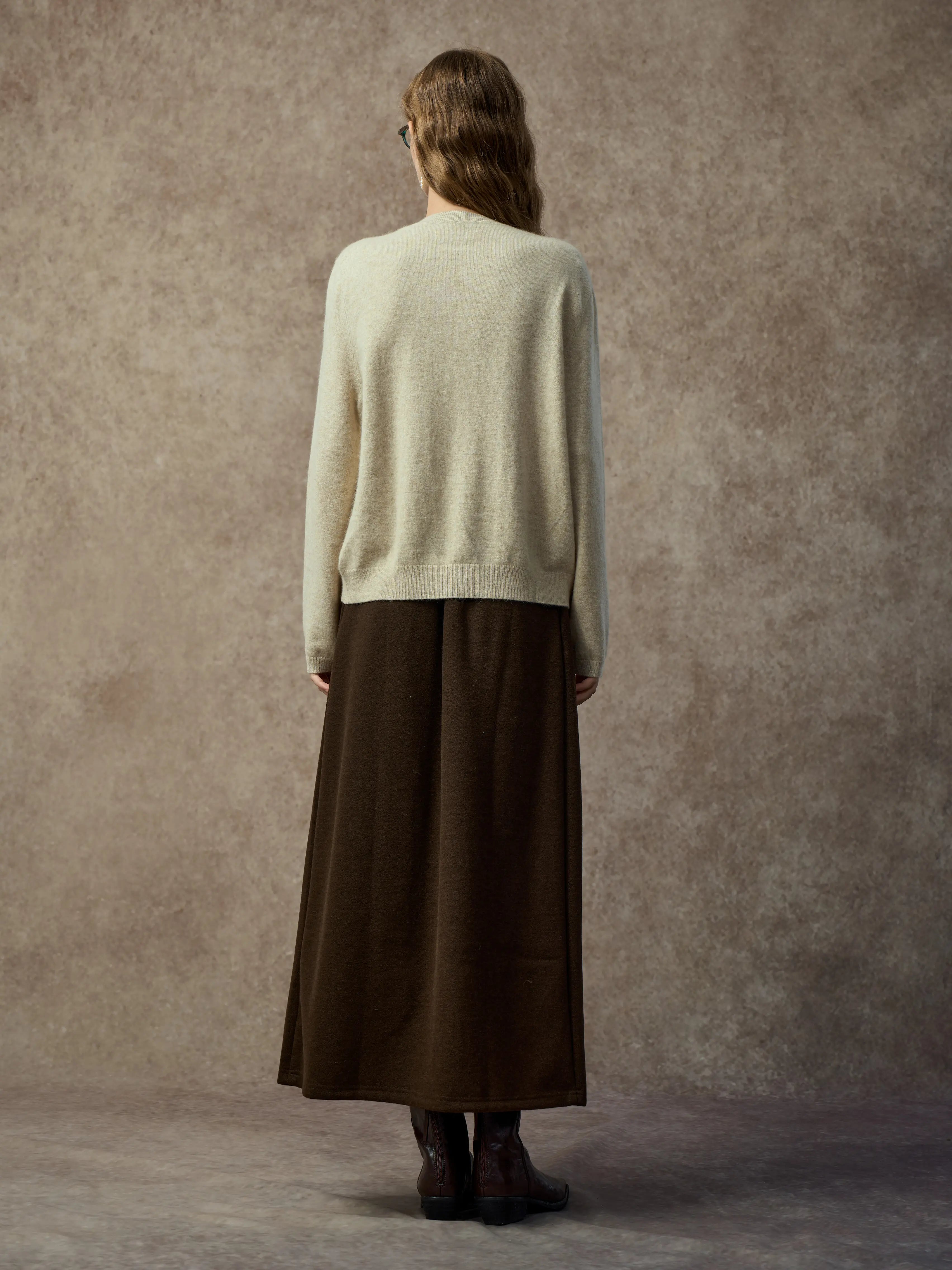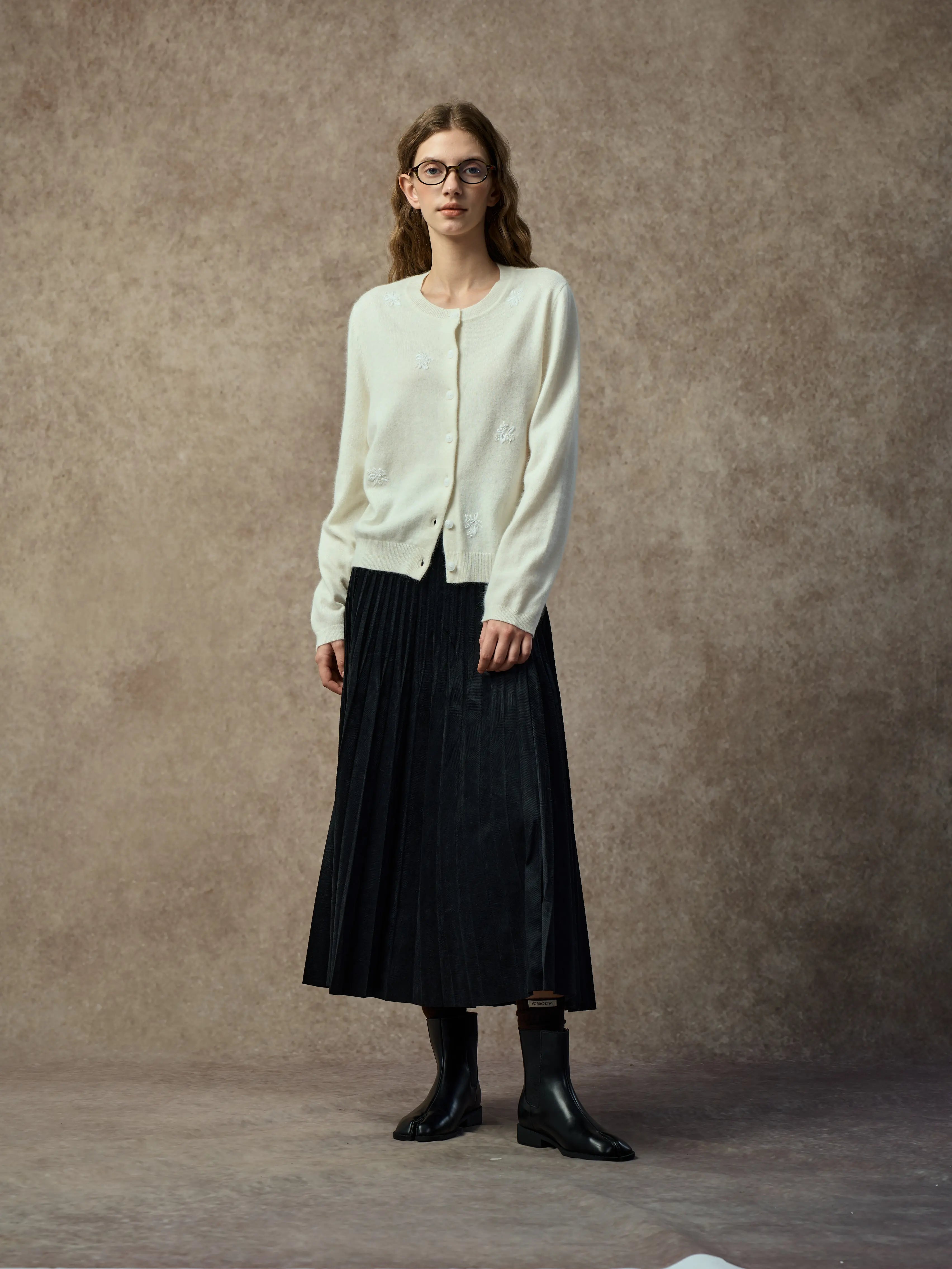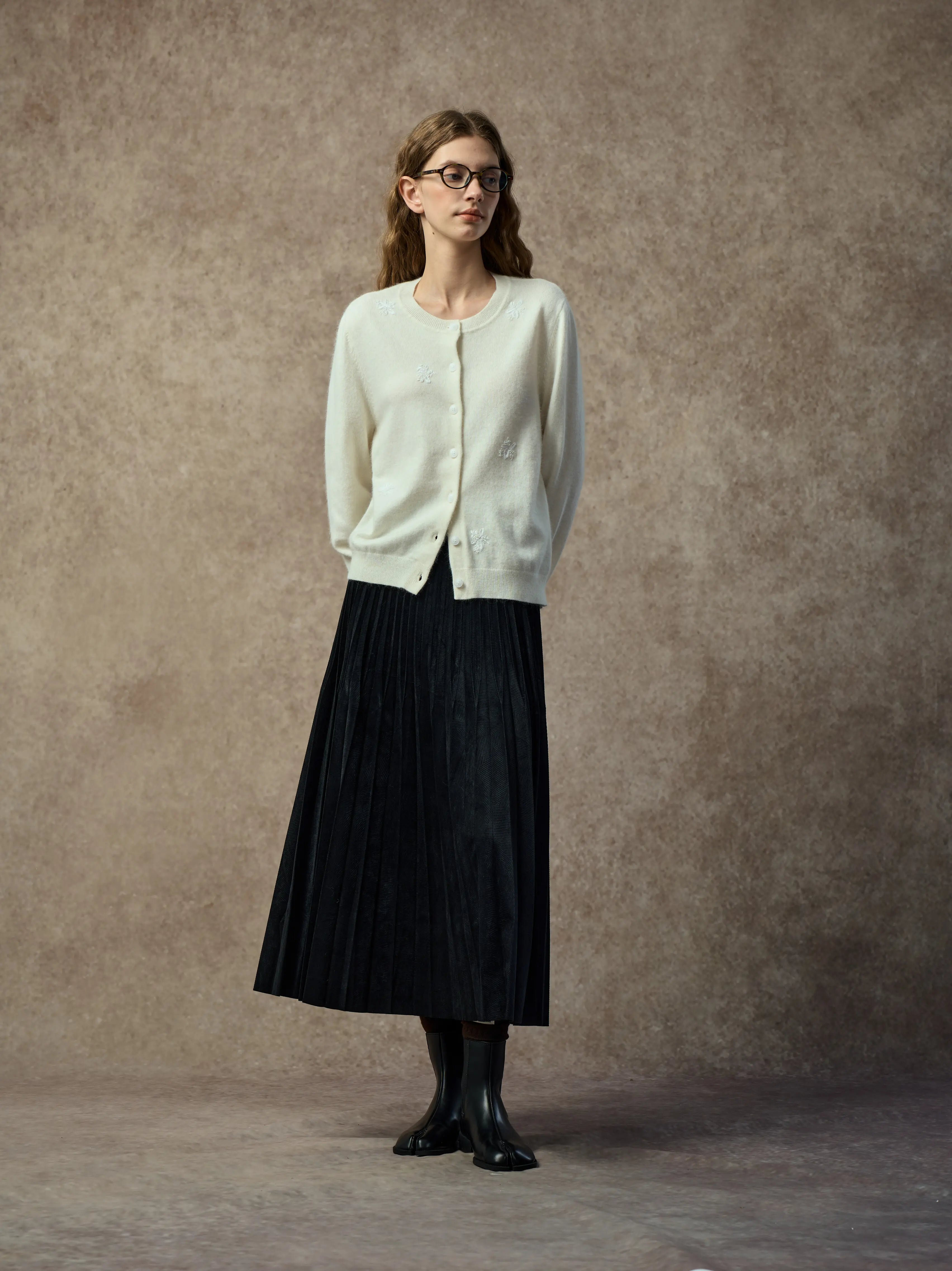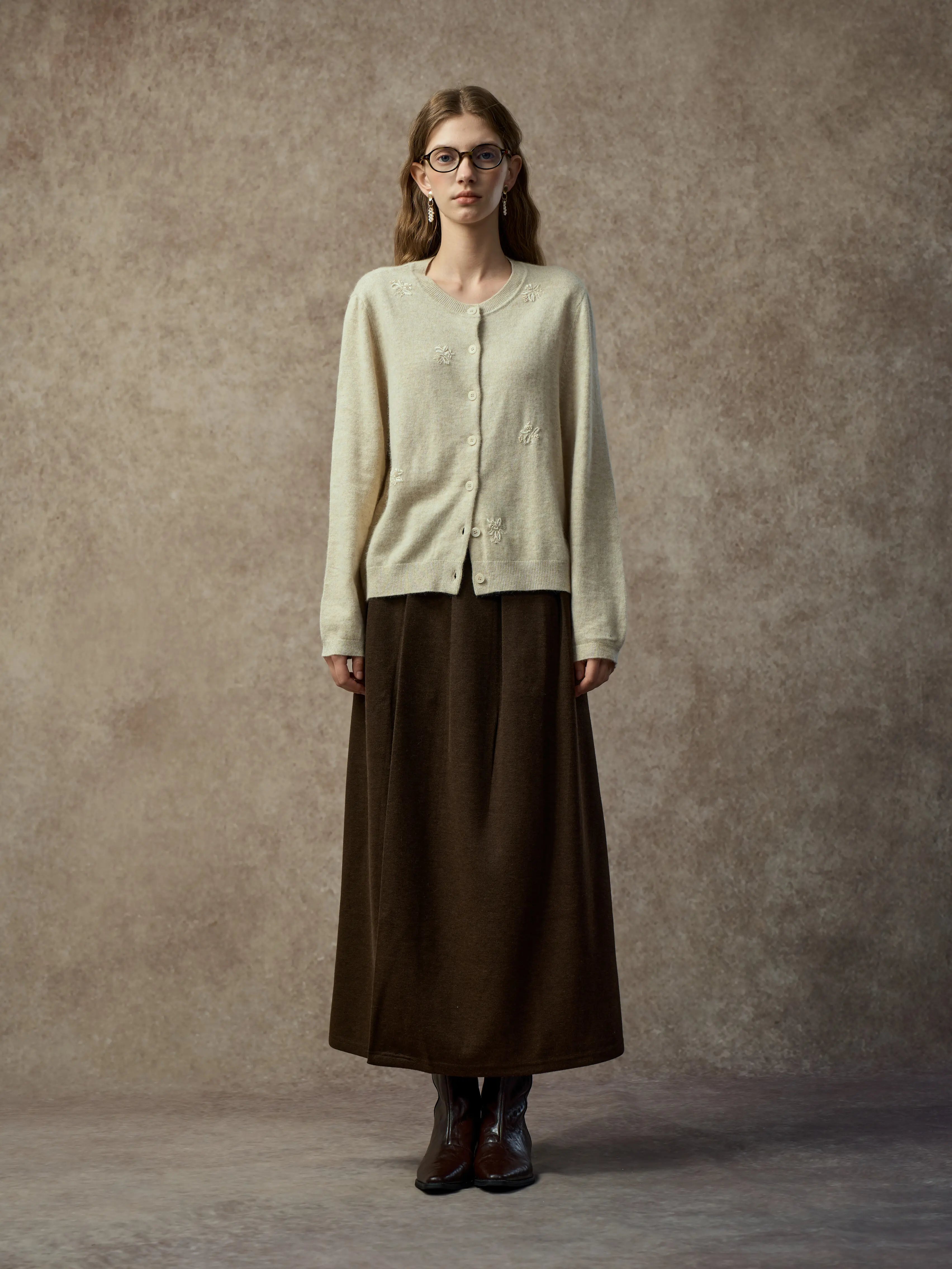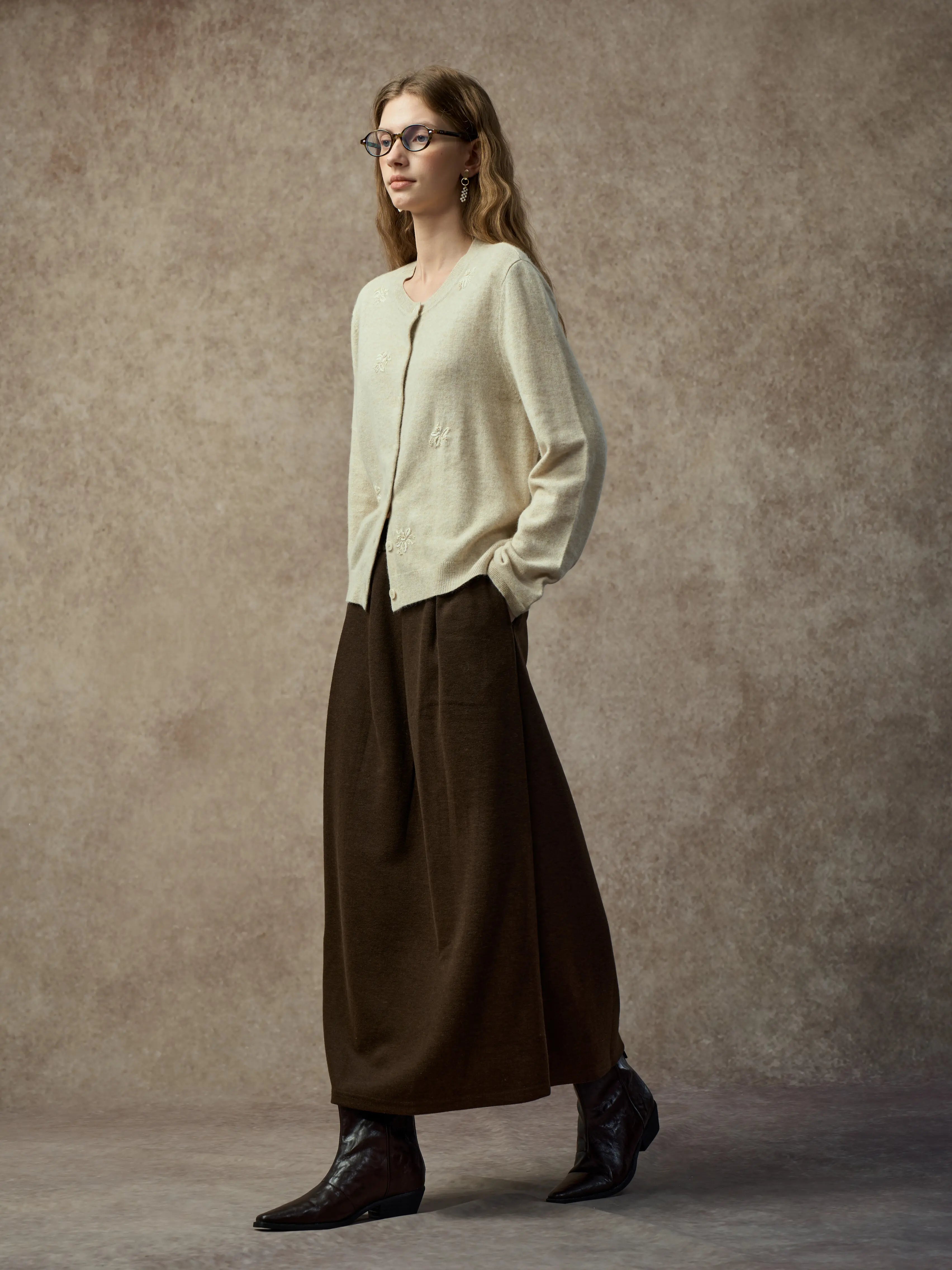 A soft wool-blend cardigan with delicate hand-beaded embroidery for an elegant touch. Features a classic crew neck and relaxed H-shape fit, making it easy to layer and flattering on all figures.