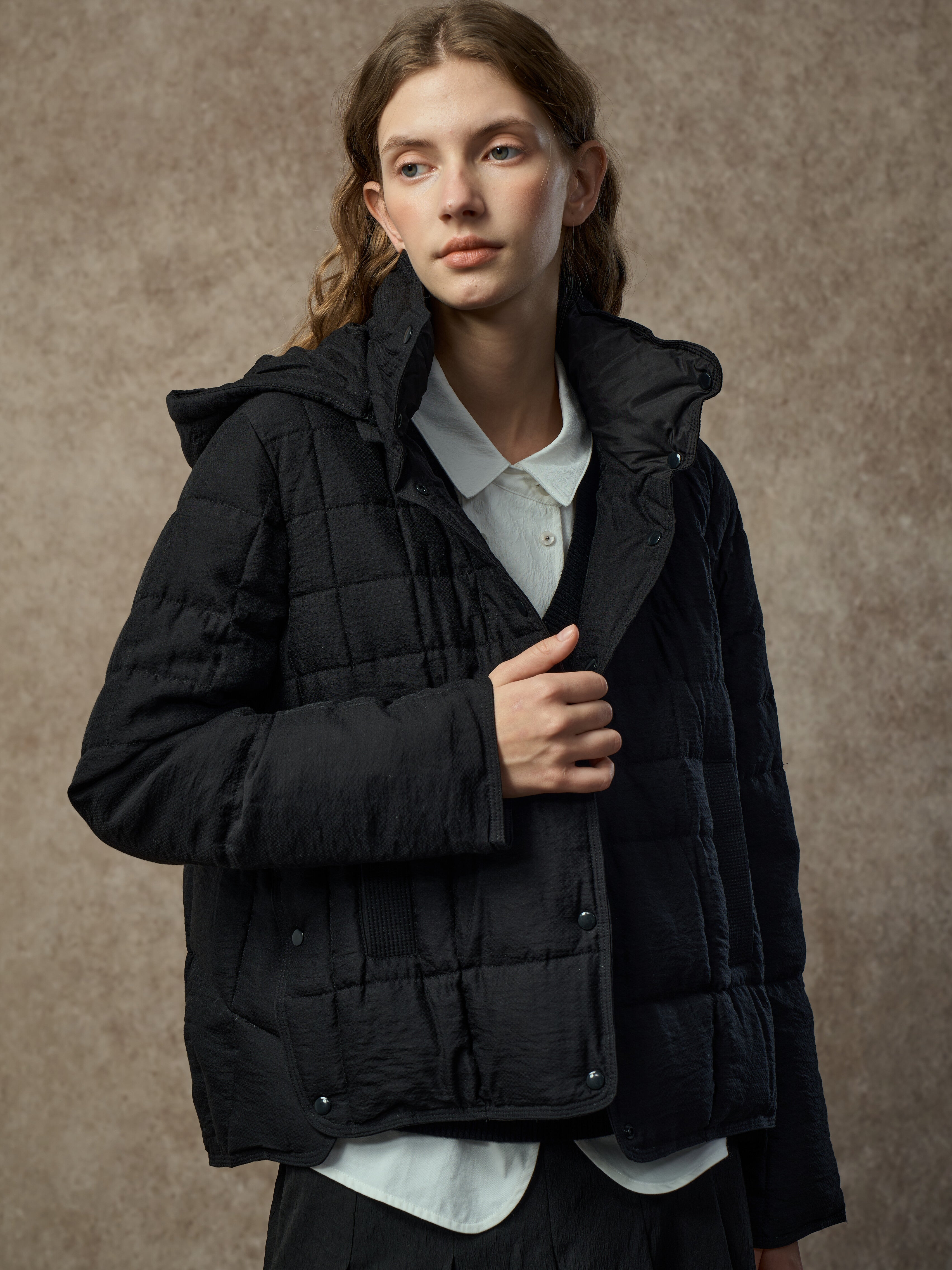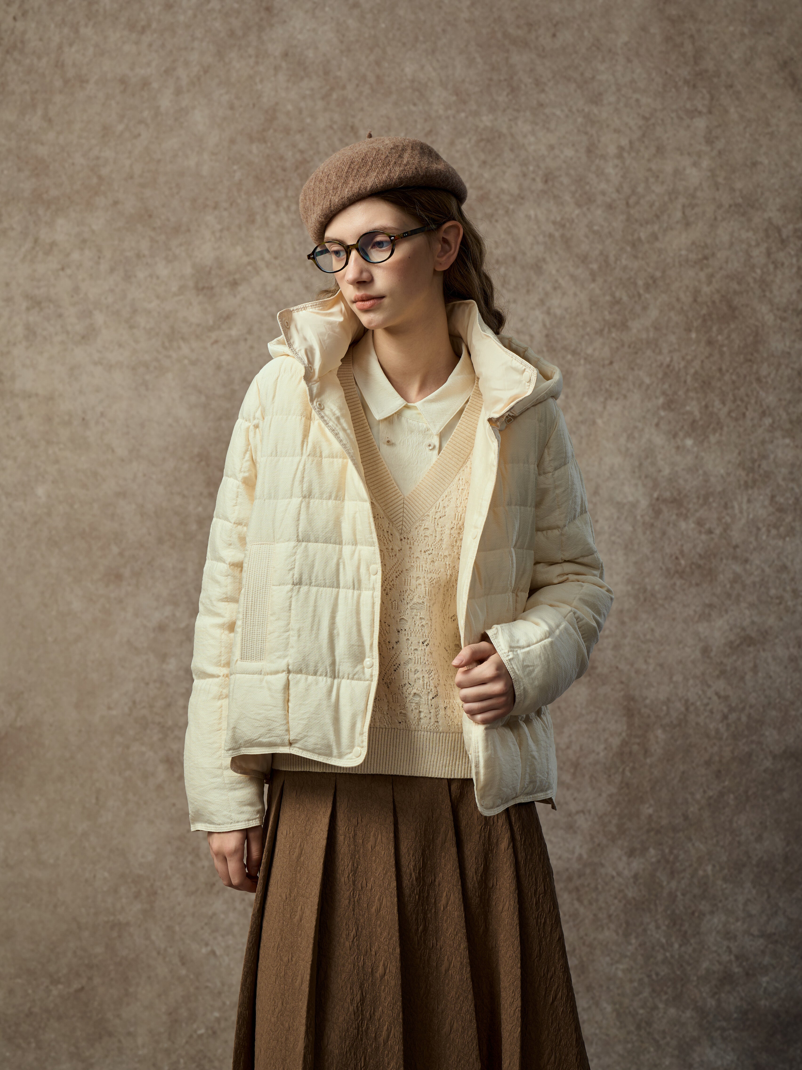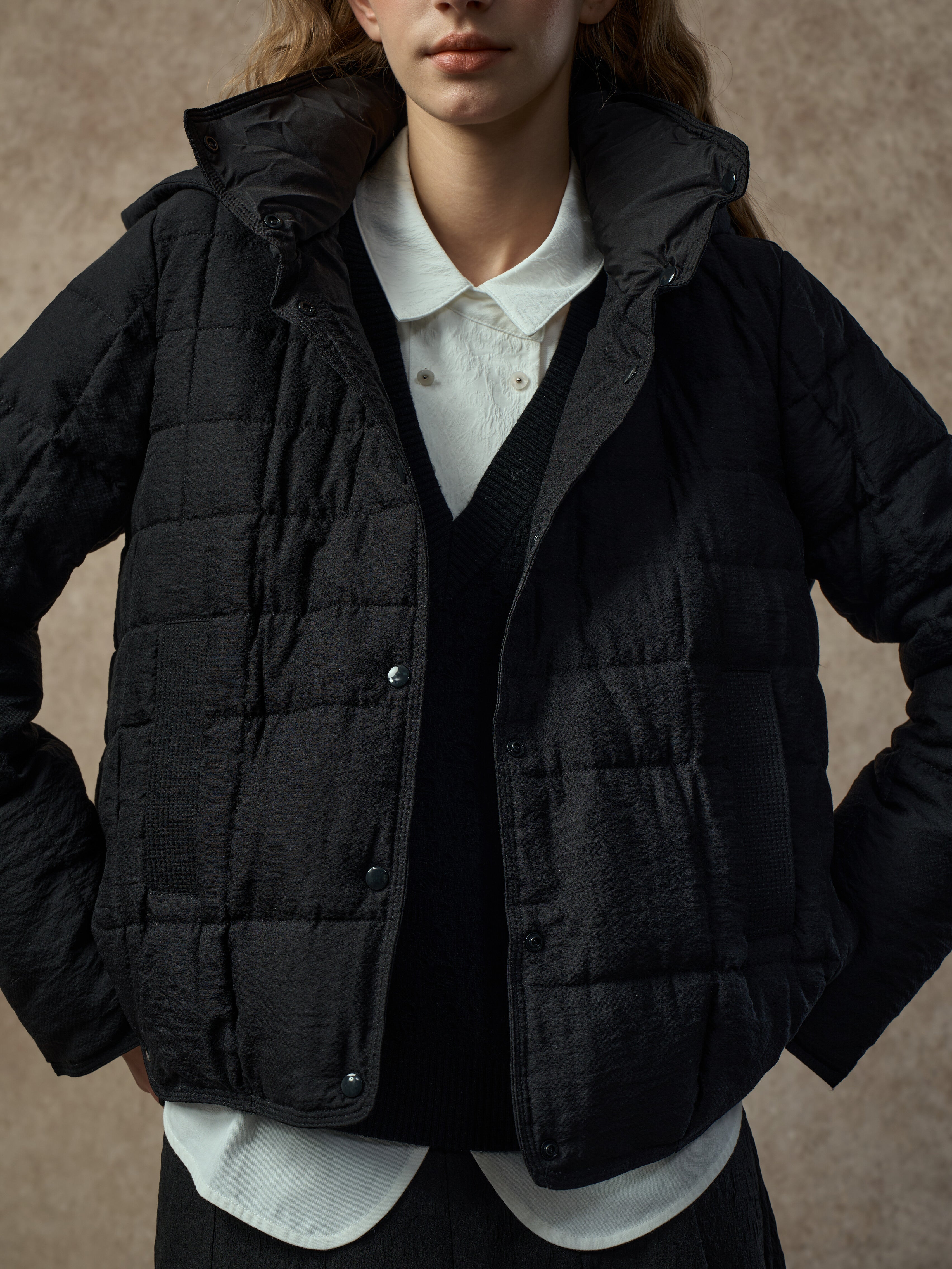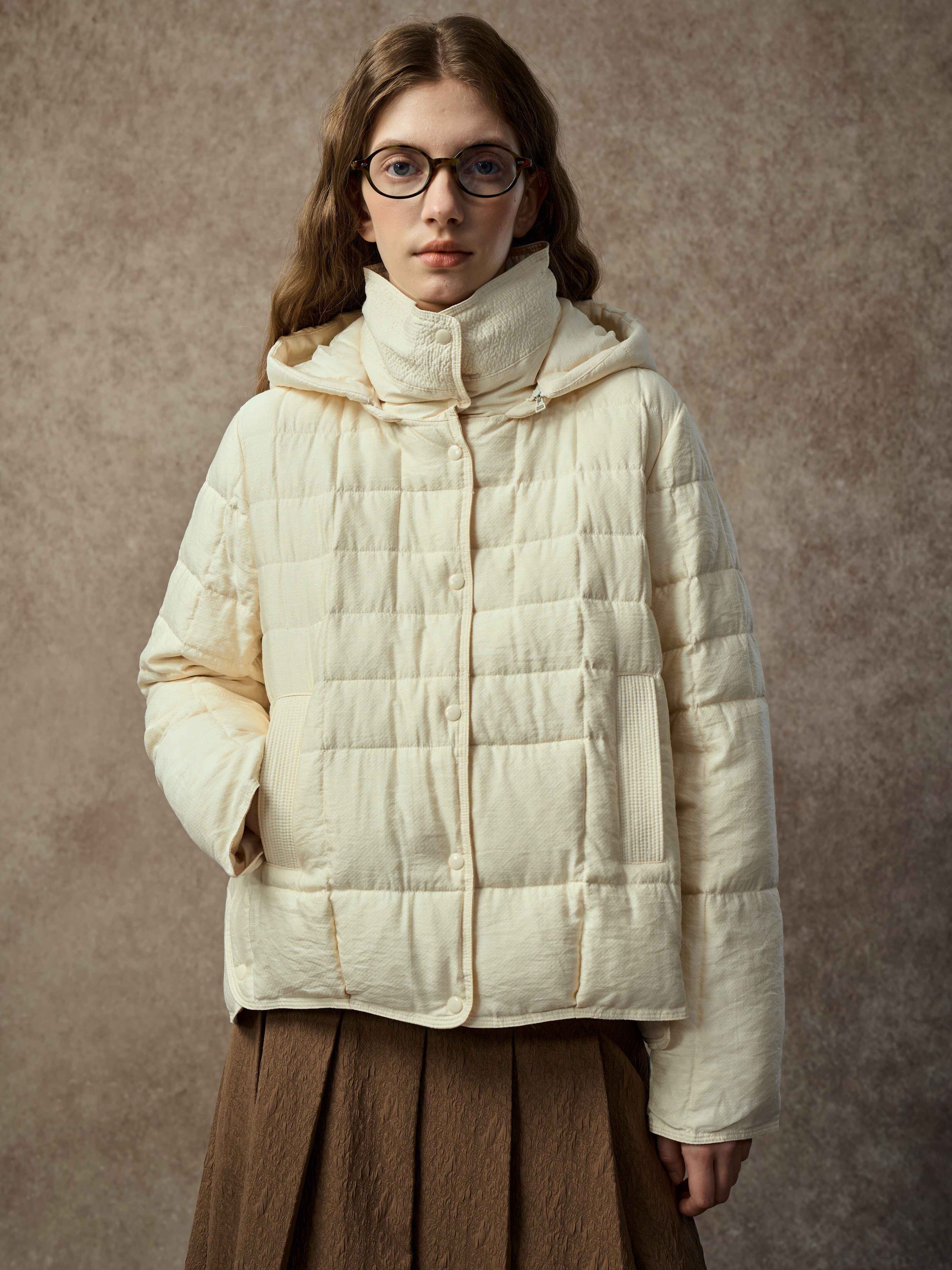 A short down jacket with a soft silk‑blend shell and playful quilted pattern. Filled with 90% white duck down, it’s warm yet lightweight. The H‑line cut and stand collar give a flattering, comfortable fit for everyday winter wear.