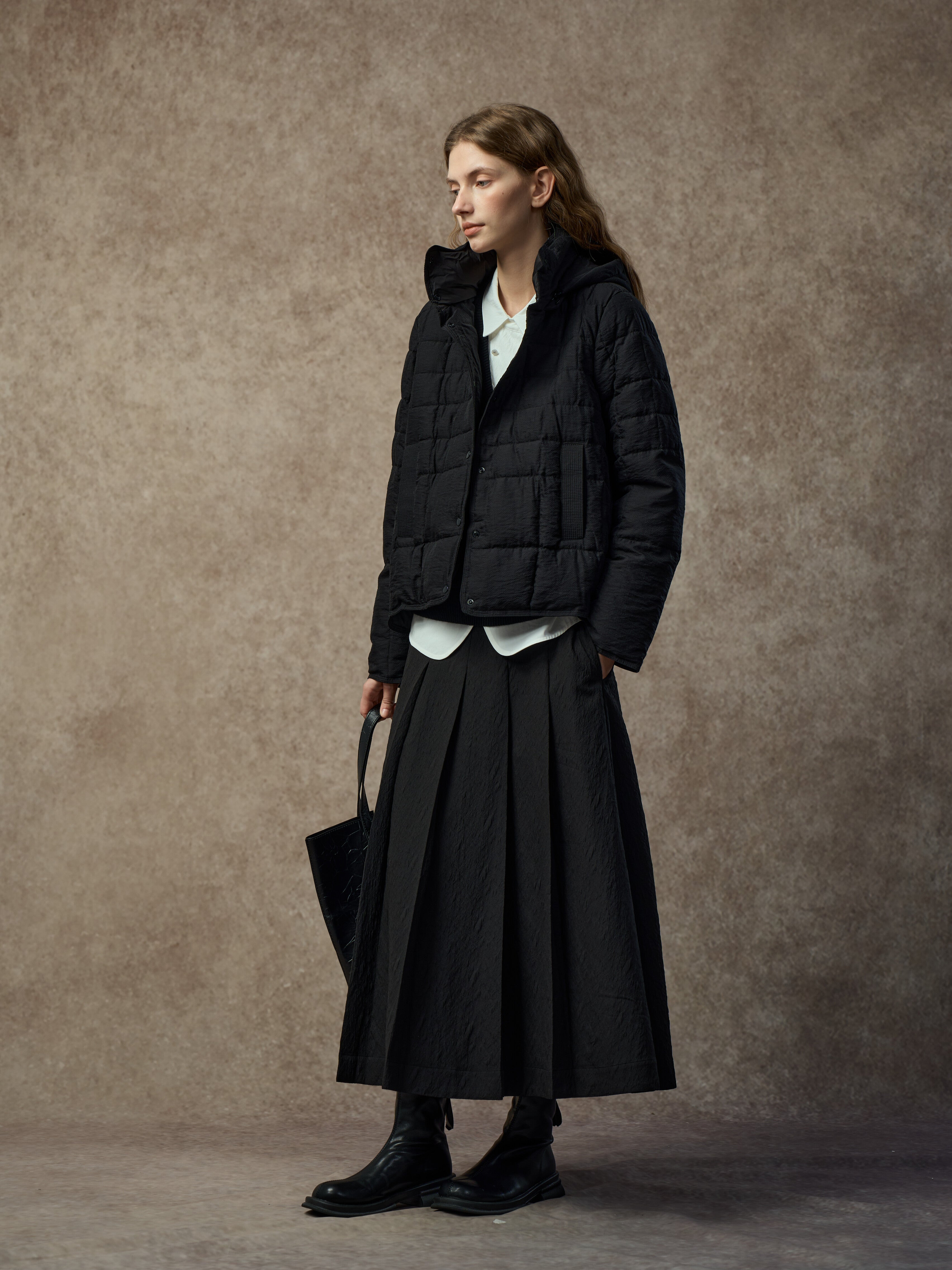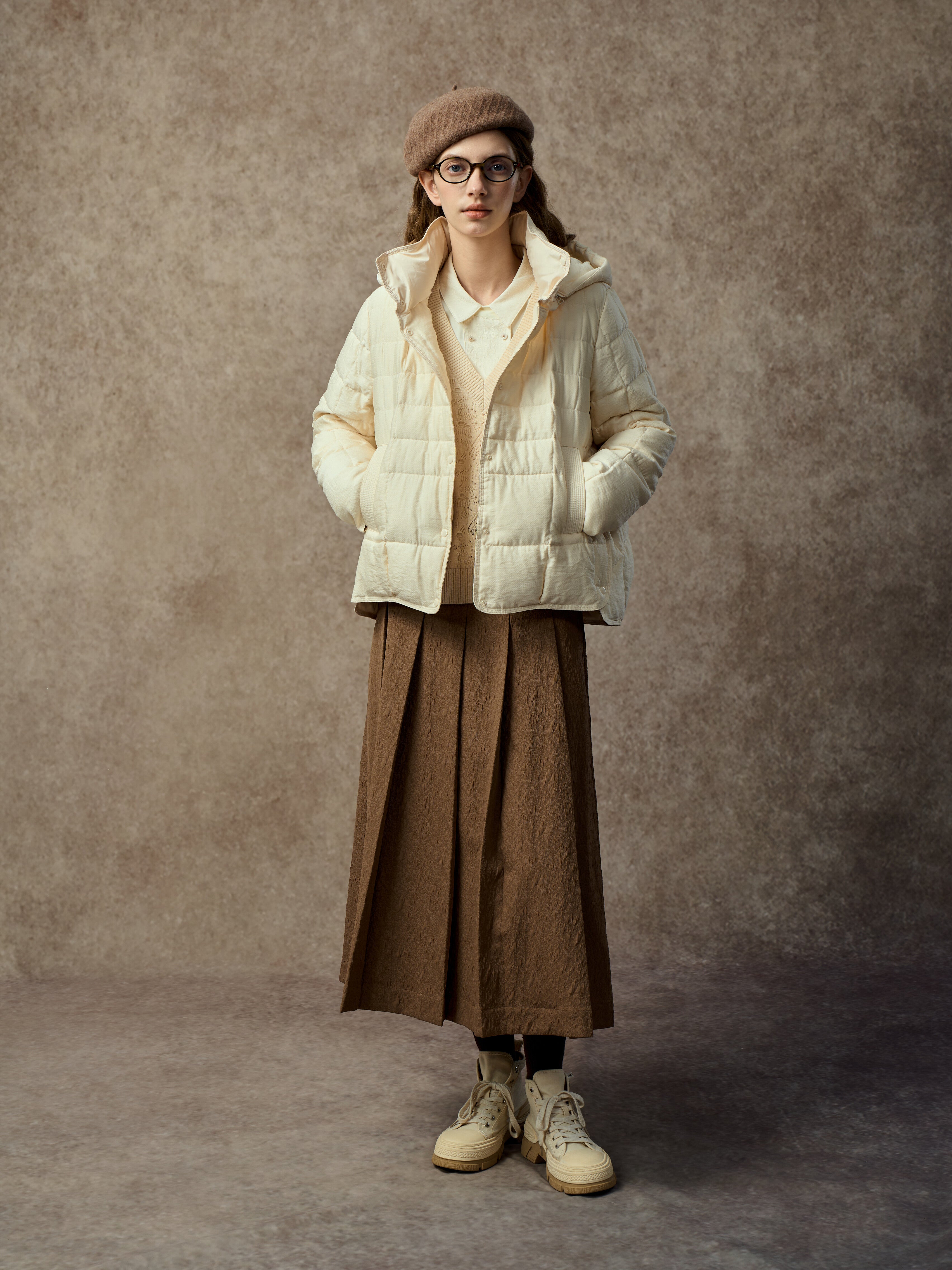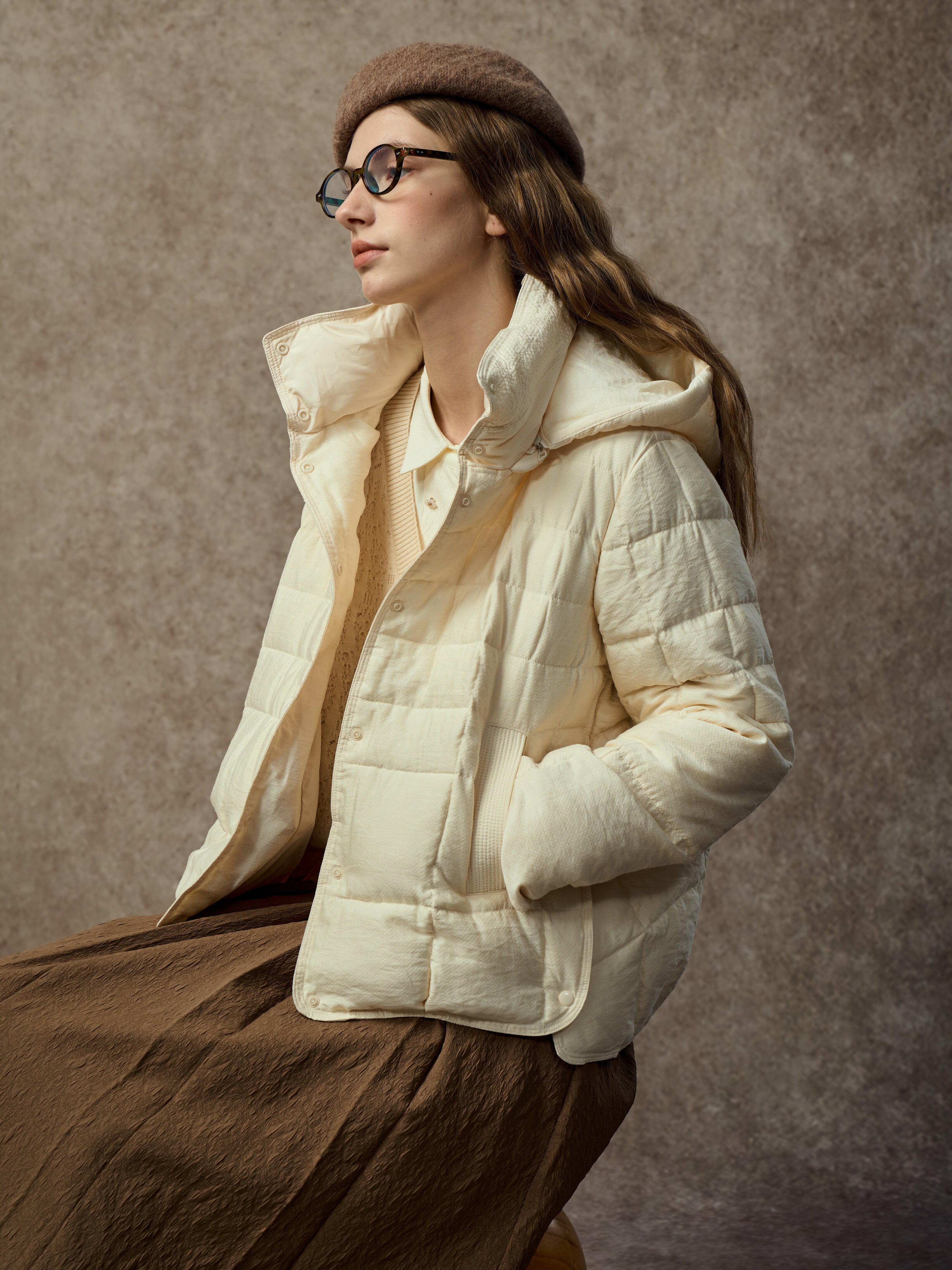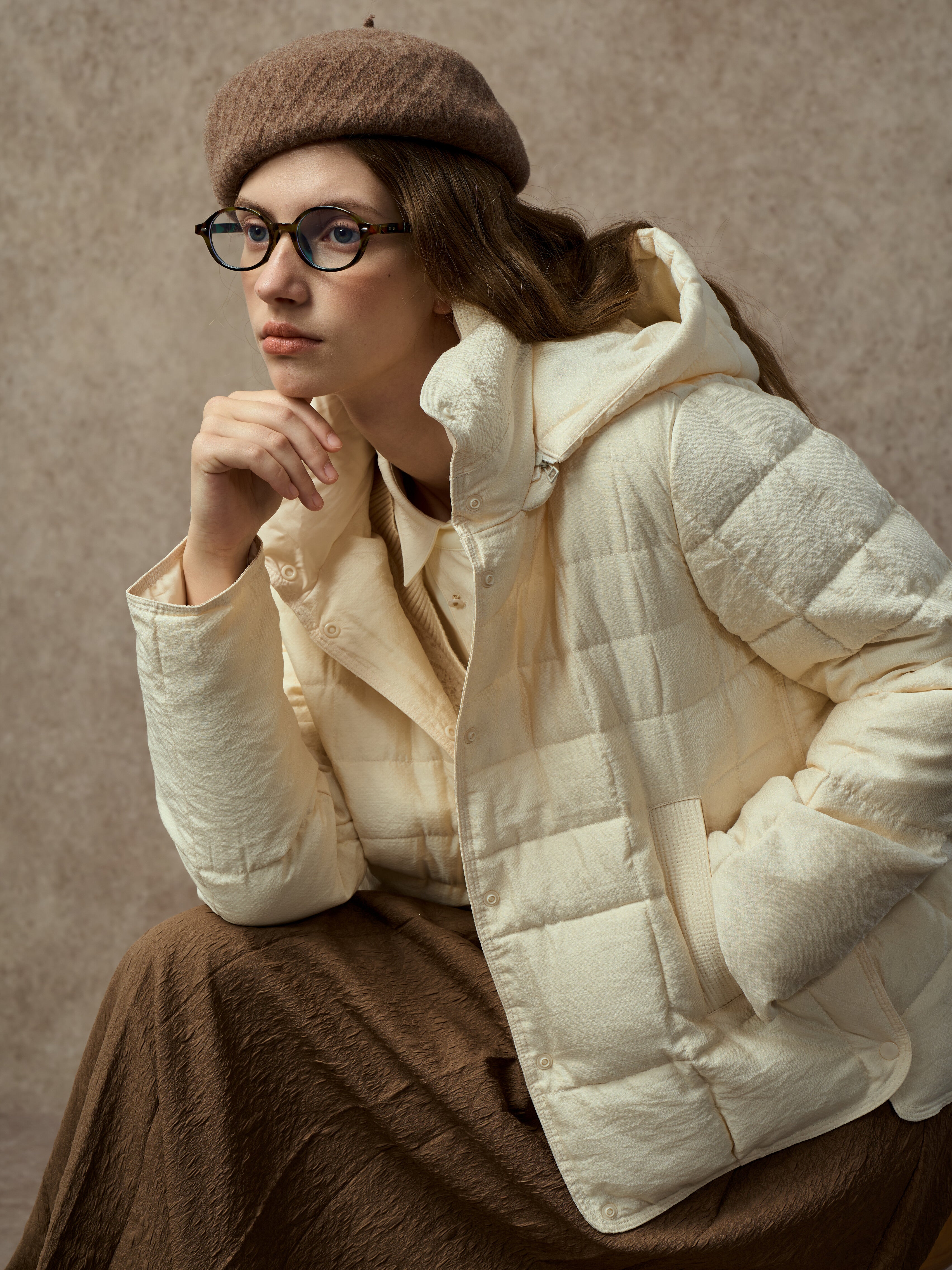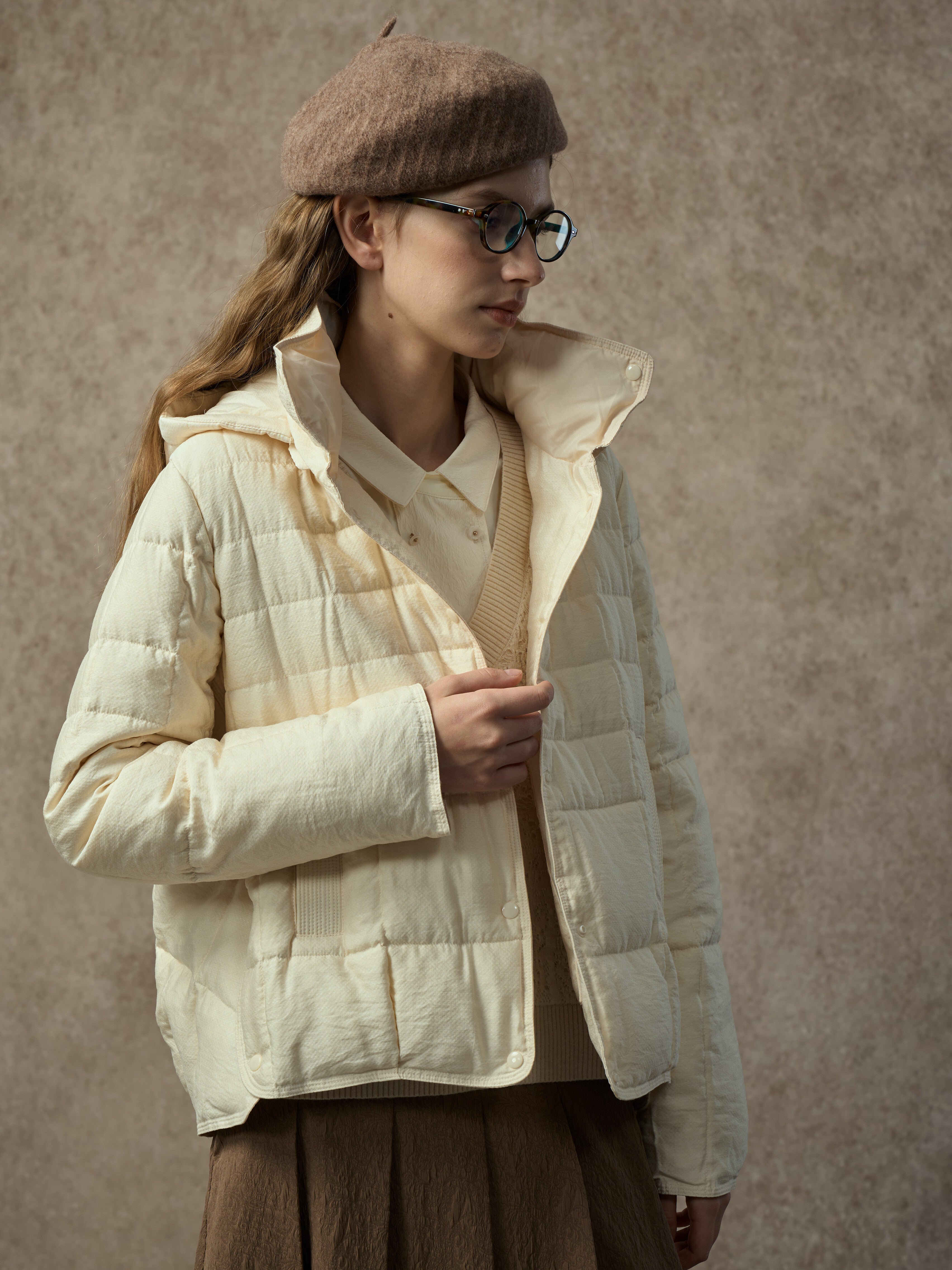 A short down jacket with a soft silk‑blend shell and playful quilted pattern. Filled with 90% white duck down, it’s warm yet lightweight. The H‑line cut and stand collar give a flattering, comfortable fit for everyday winter wear.
