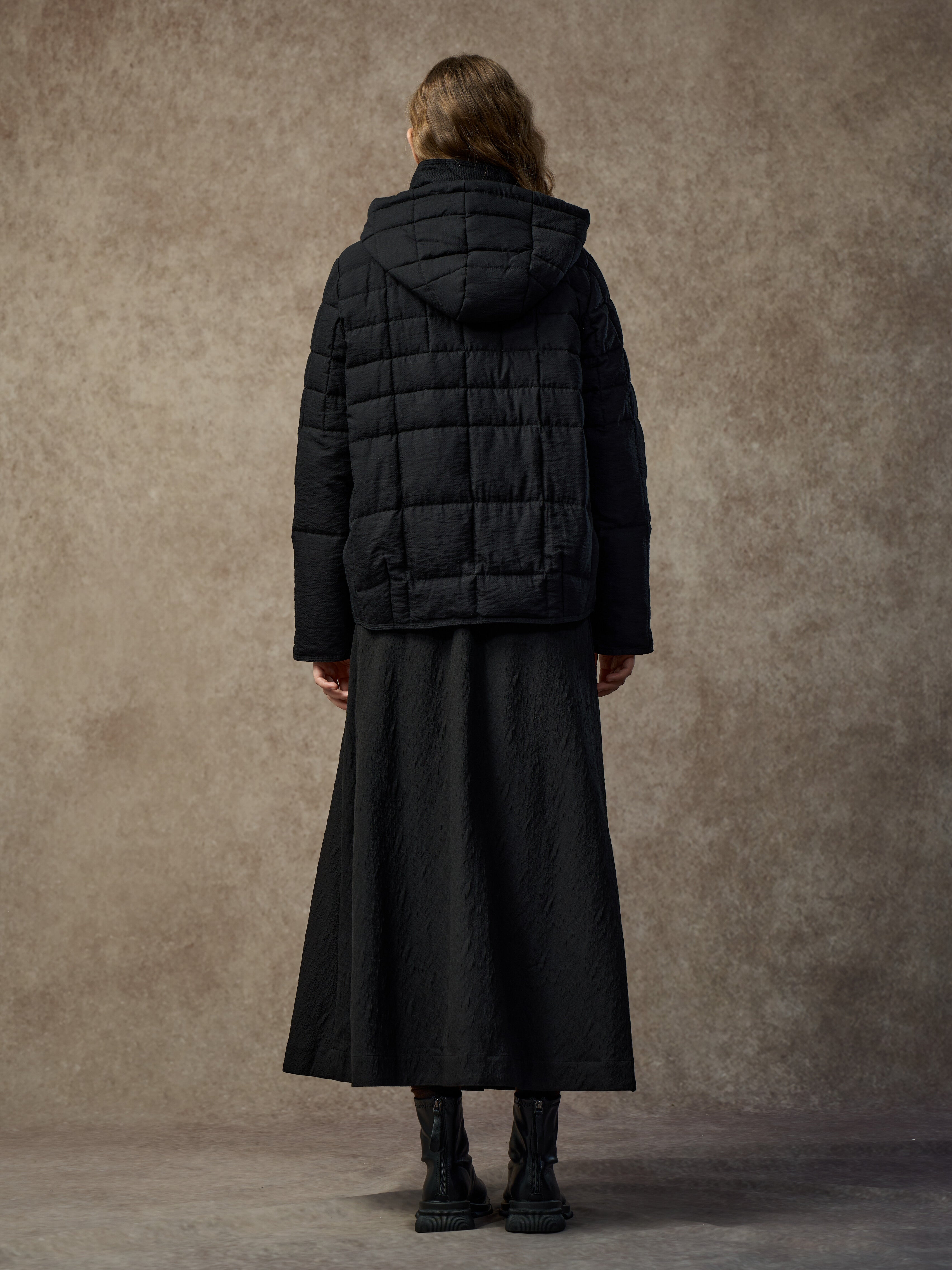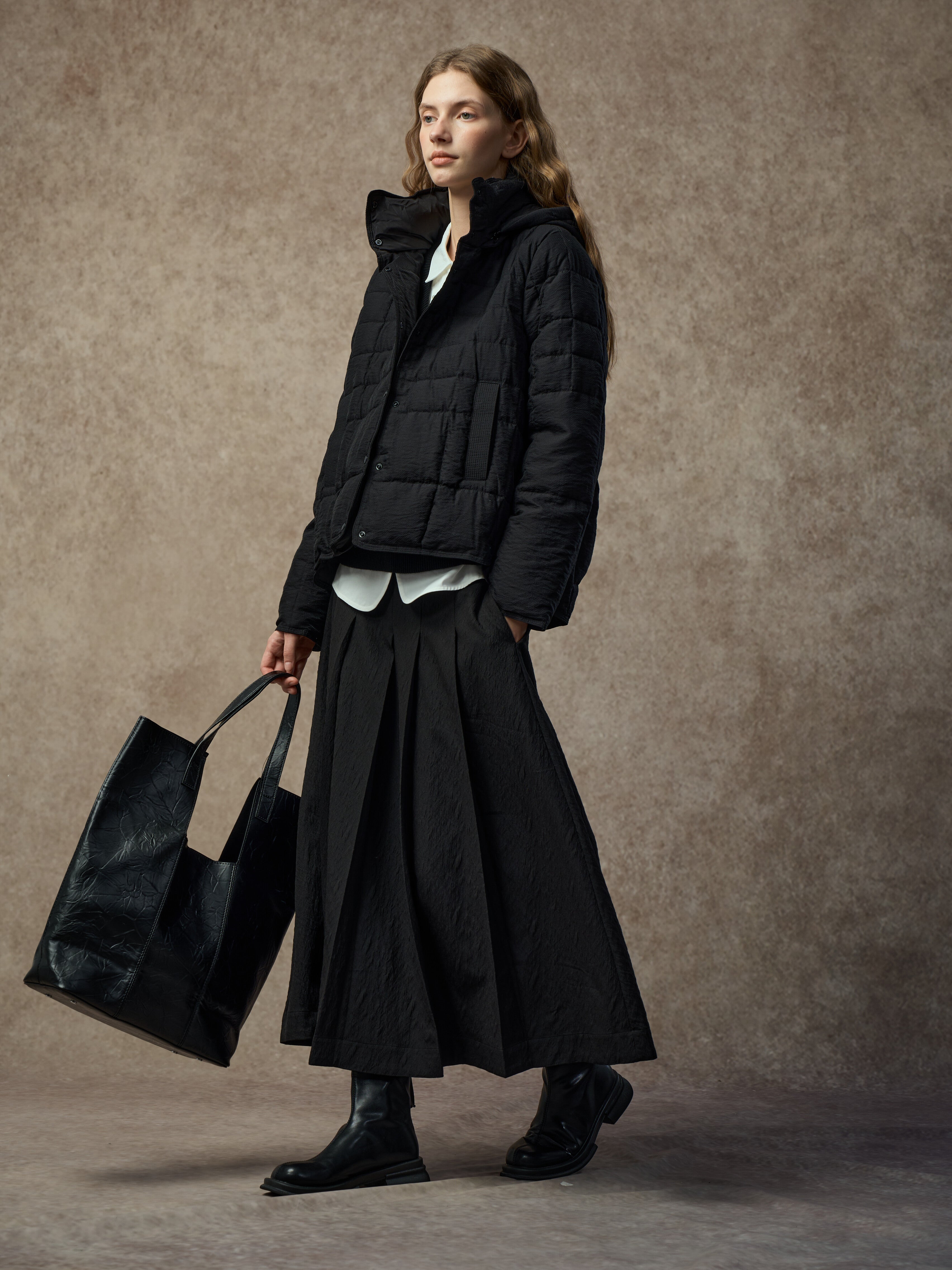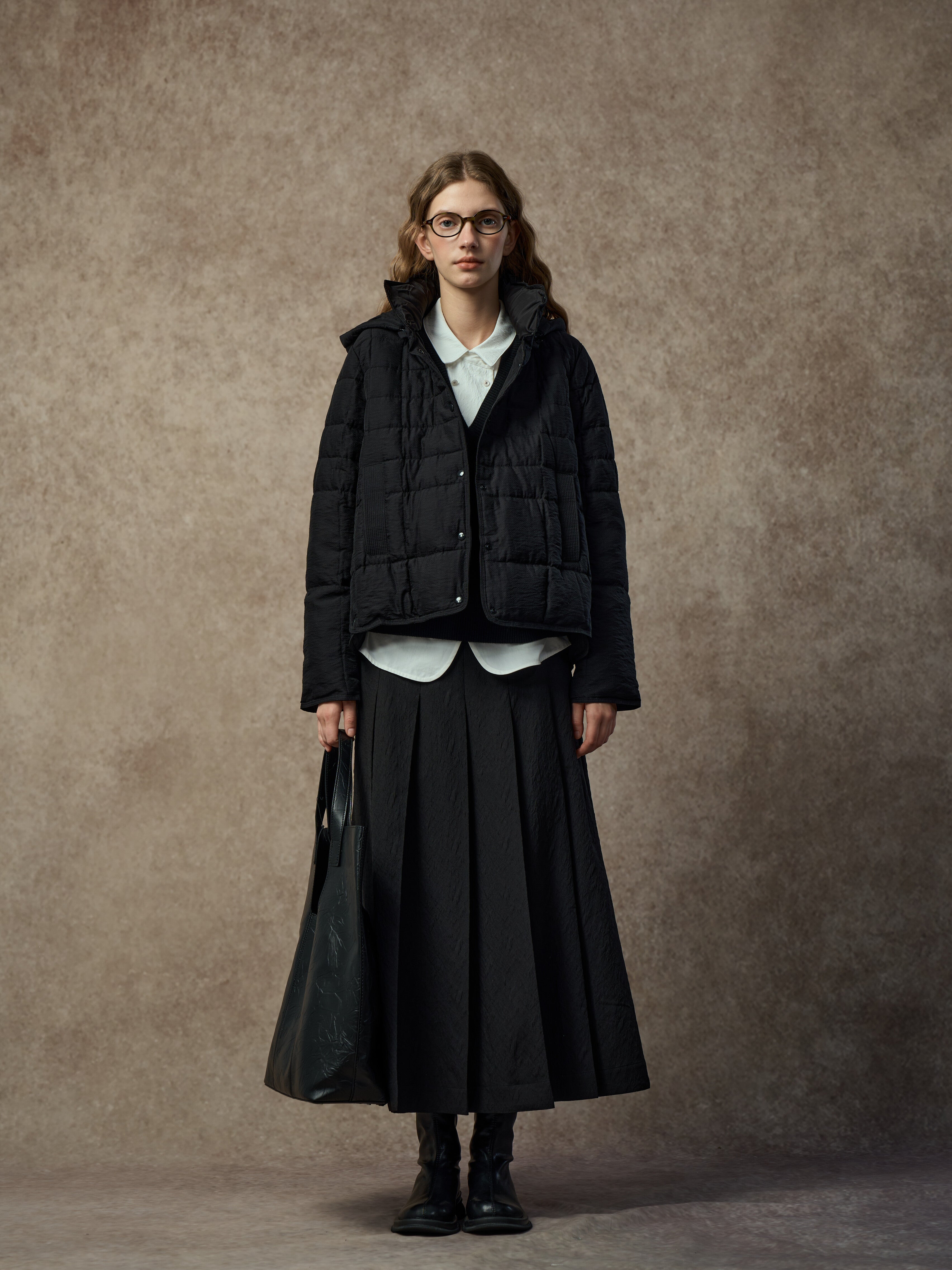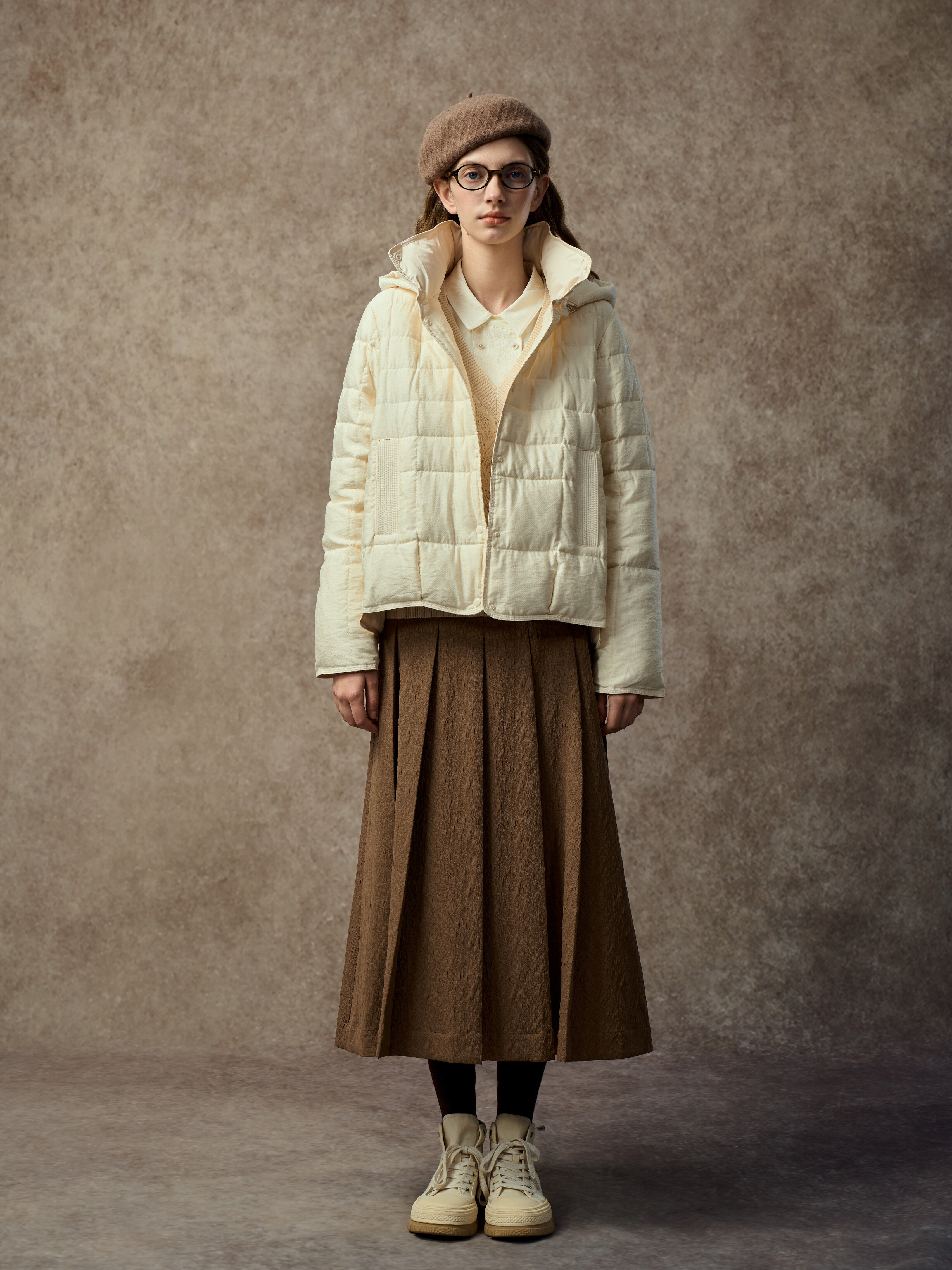 A short down jacket with a soft silk‑blend shell and playful quilted pattern. Filled with 90% white duck down, it’s warm yet lightweight. The H‑line cut and stand collar give a flattering, comfortable fit for everyday winter wear.