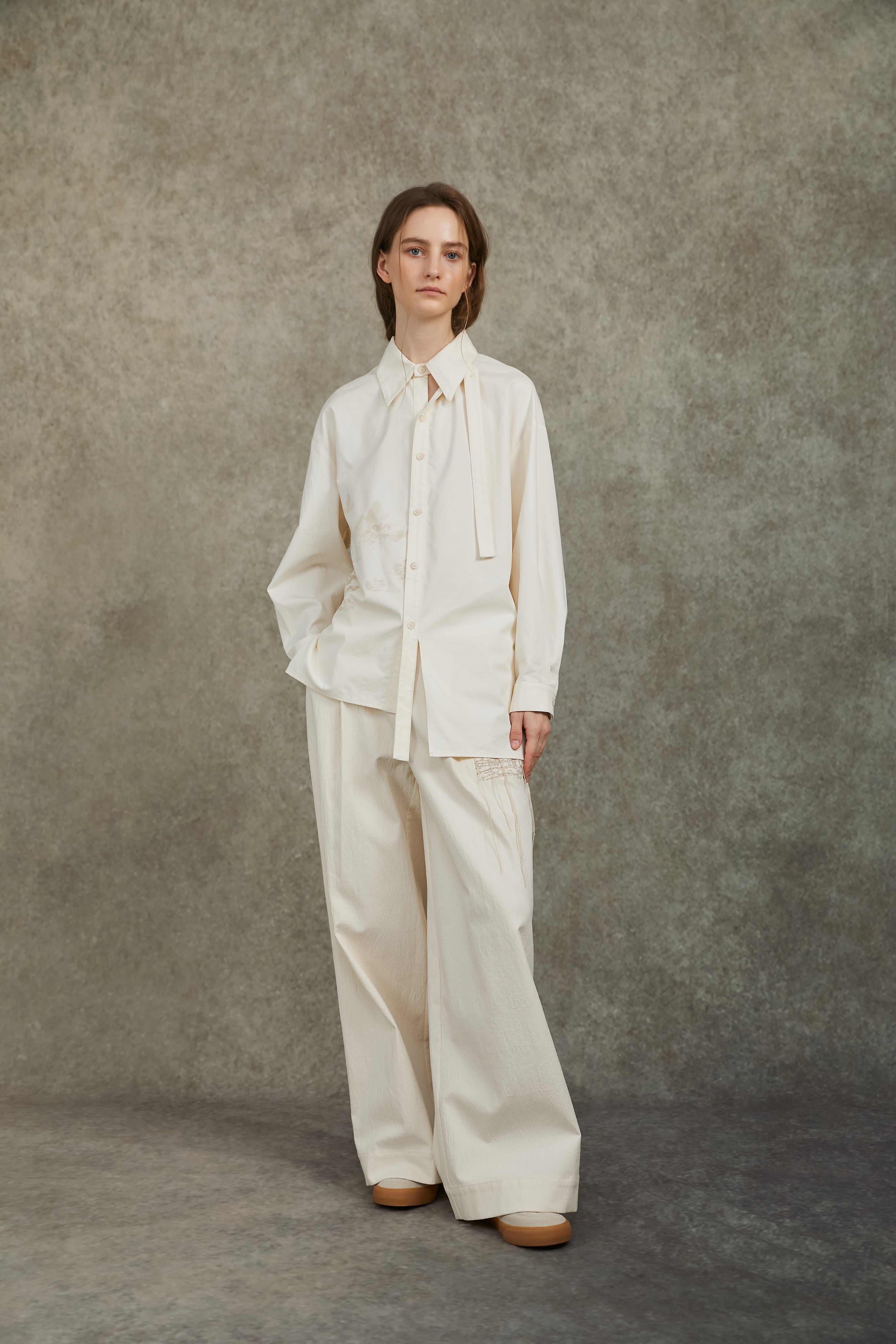 Wide‑leg trousers with a high waist and subtle embroidery detail. Crafted with a cotton‑rich blend for breathable comfort and layered texture, they balance minimalist tailoring with an artistic touch.