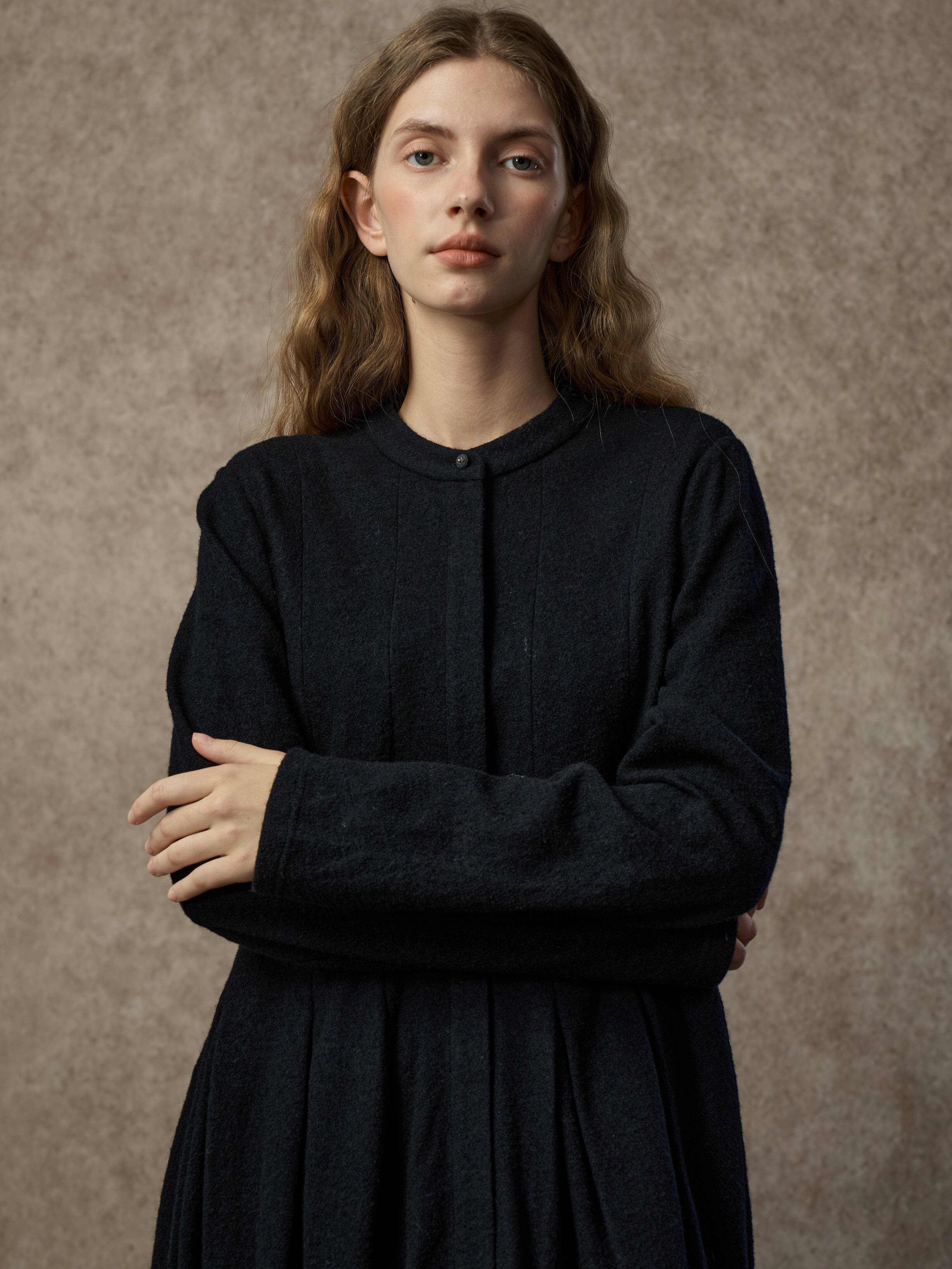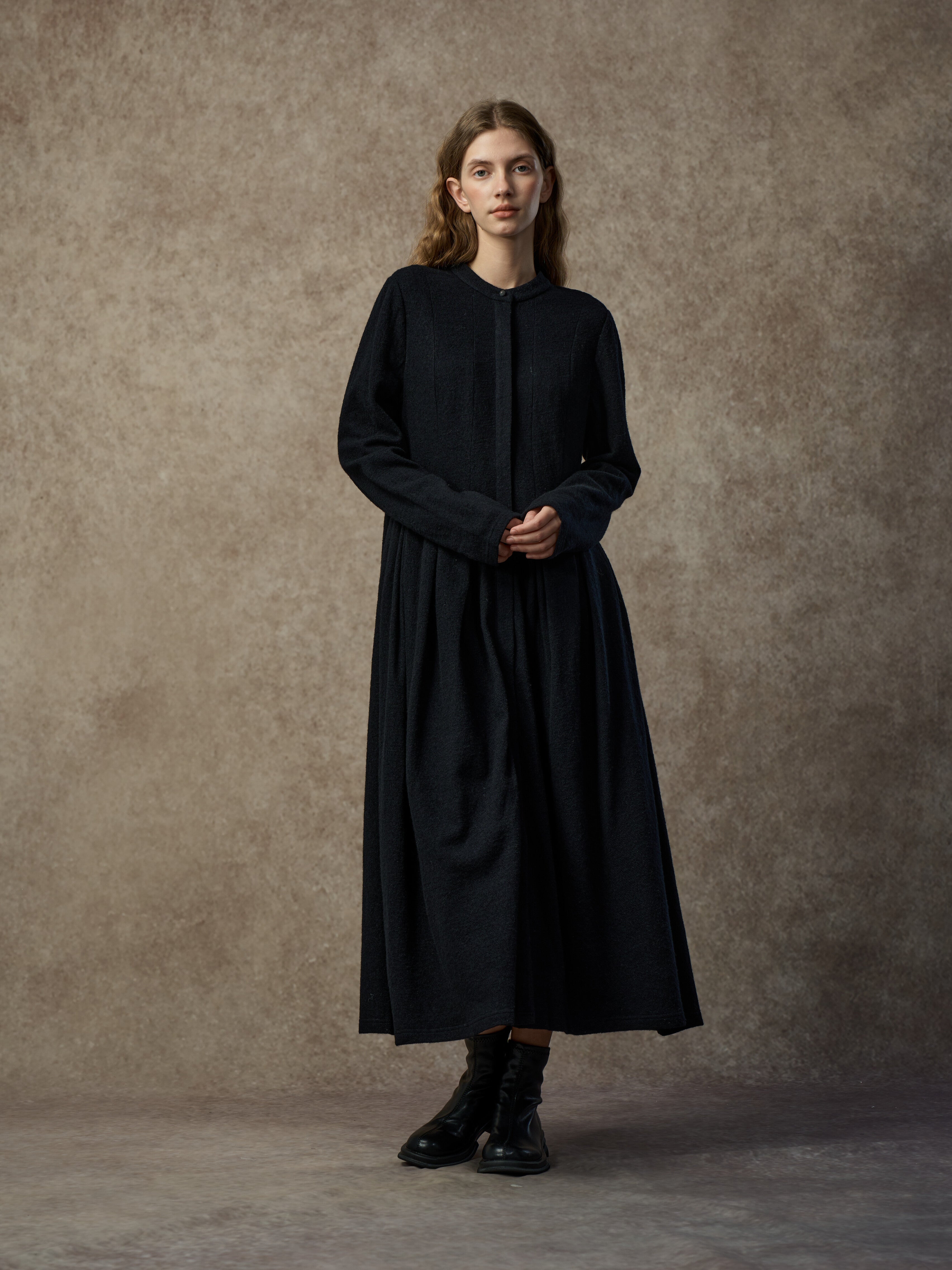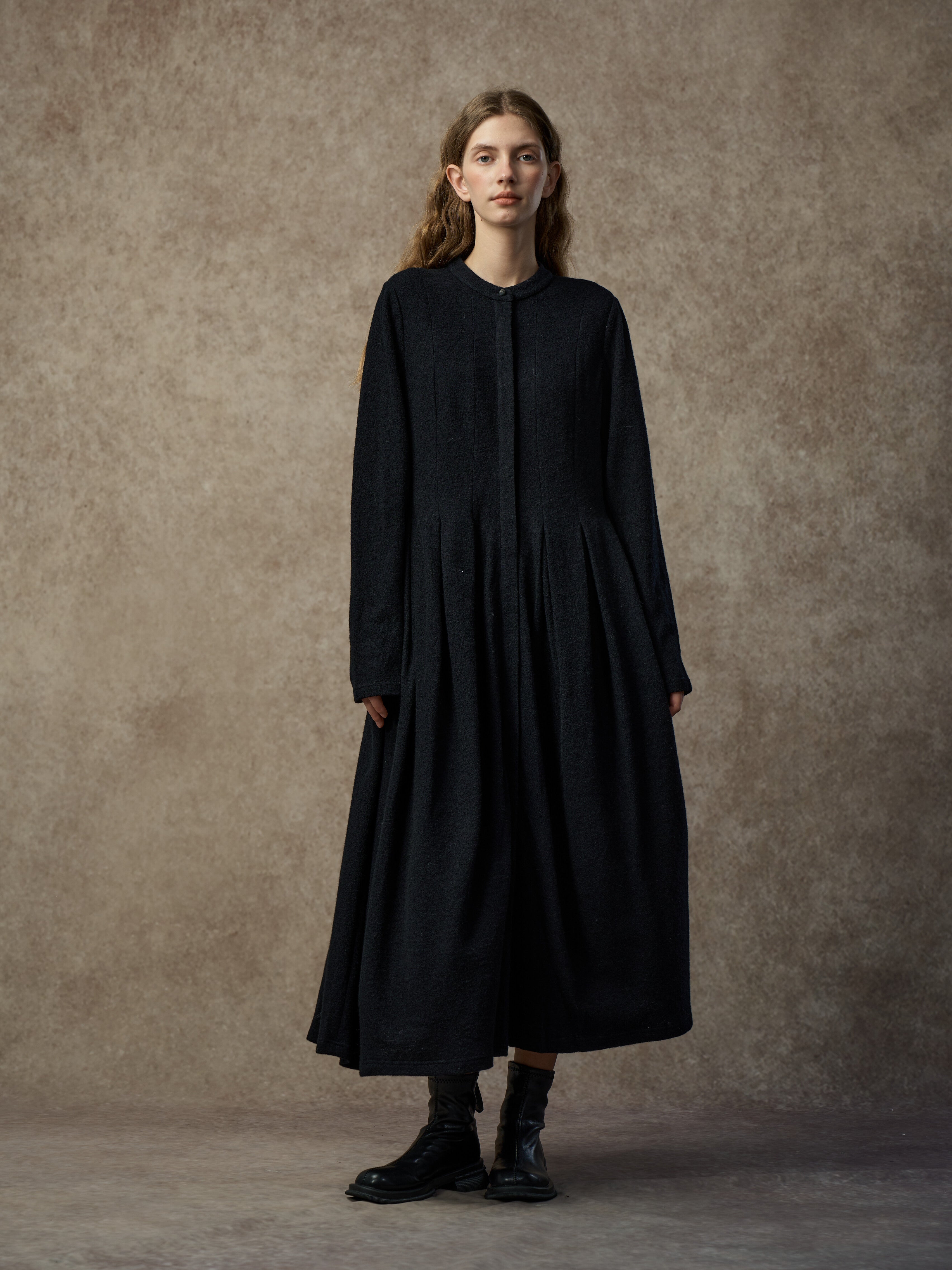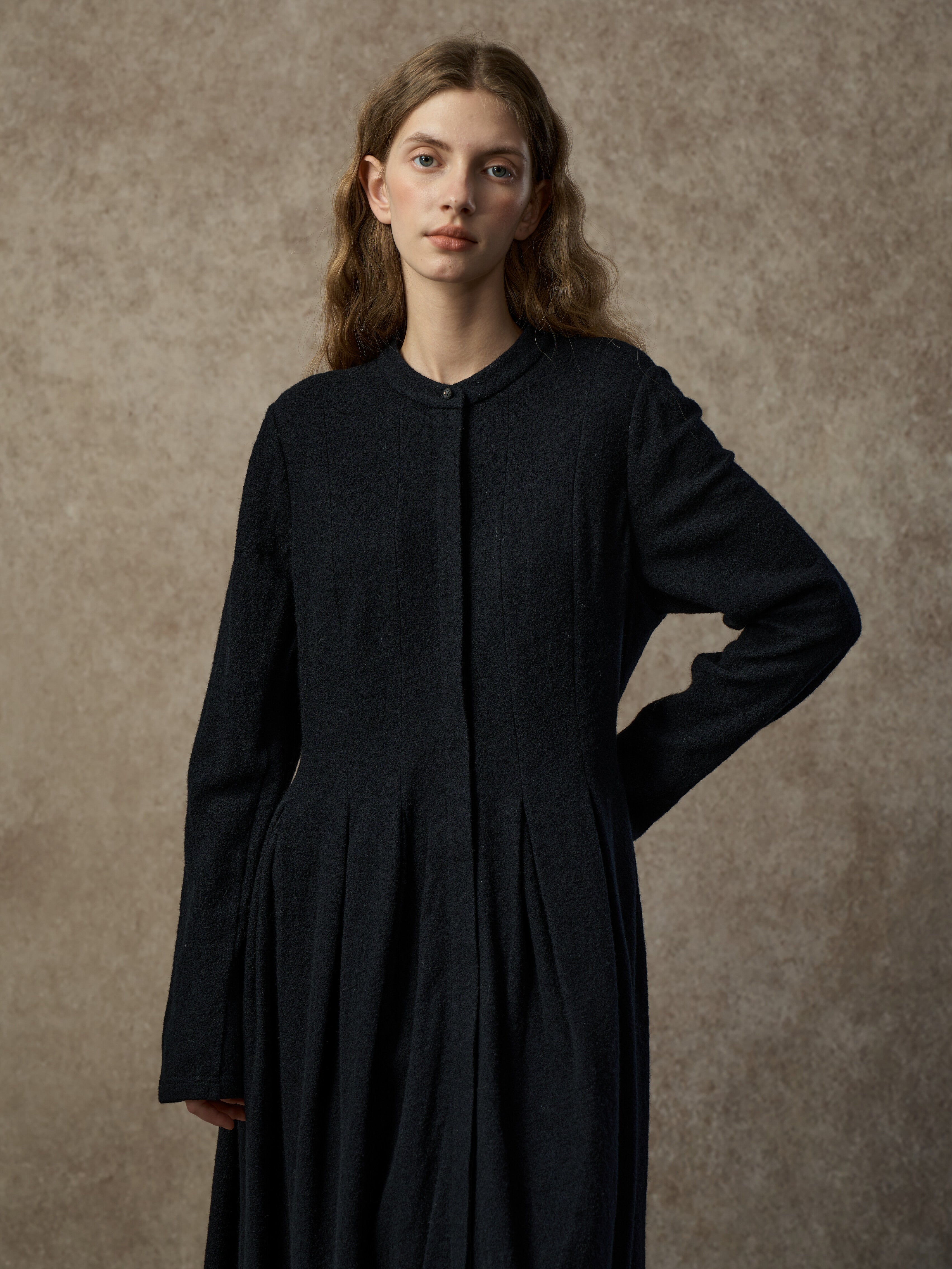 This open-front dress is made from a soft wool-cotton blend and can be worn as a dress or a lightweight coat. The fitted bodice and pleated A-line skirt create a flattering, elegant silhouette, while the premium fabric ensures warmth and comfort.