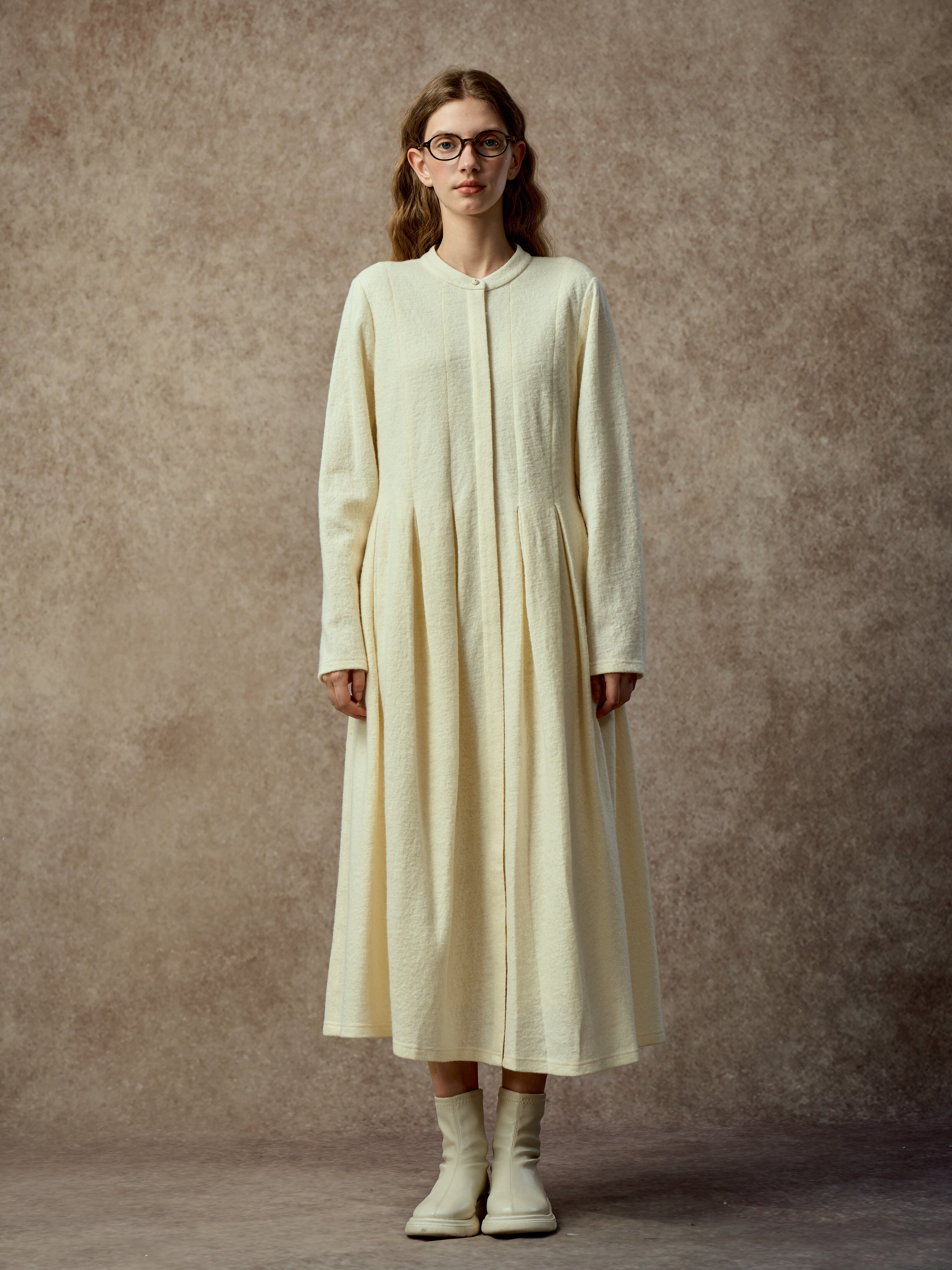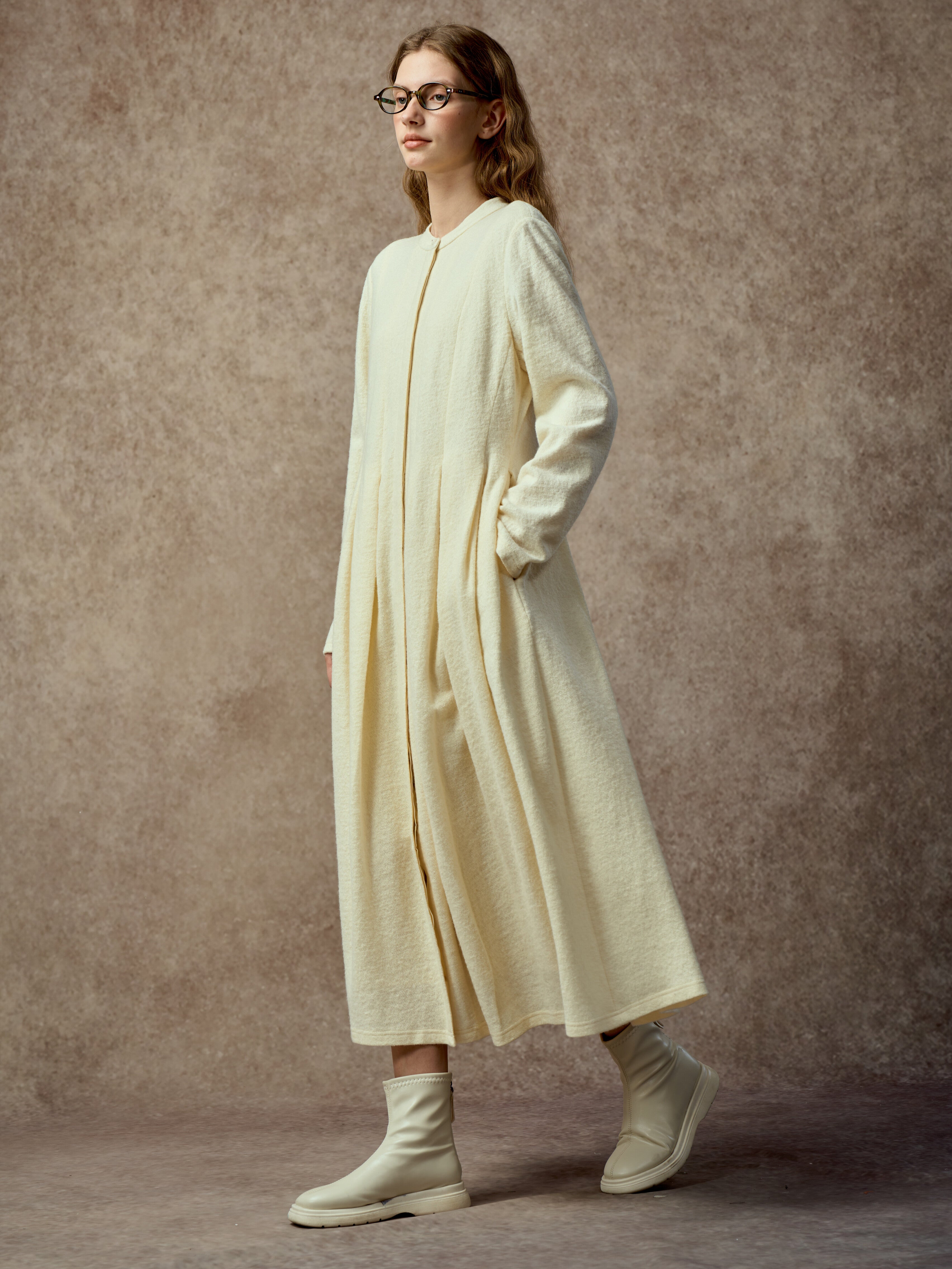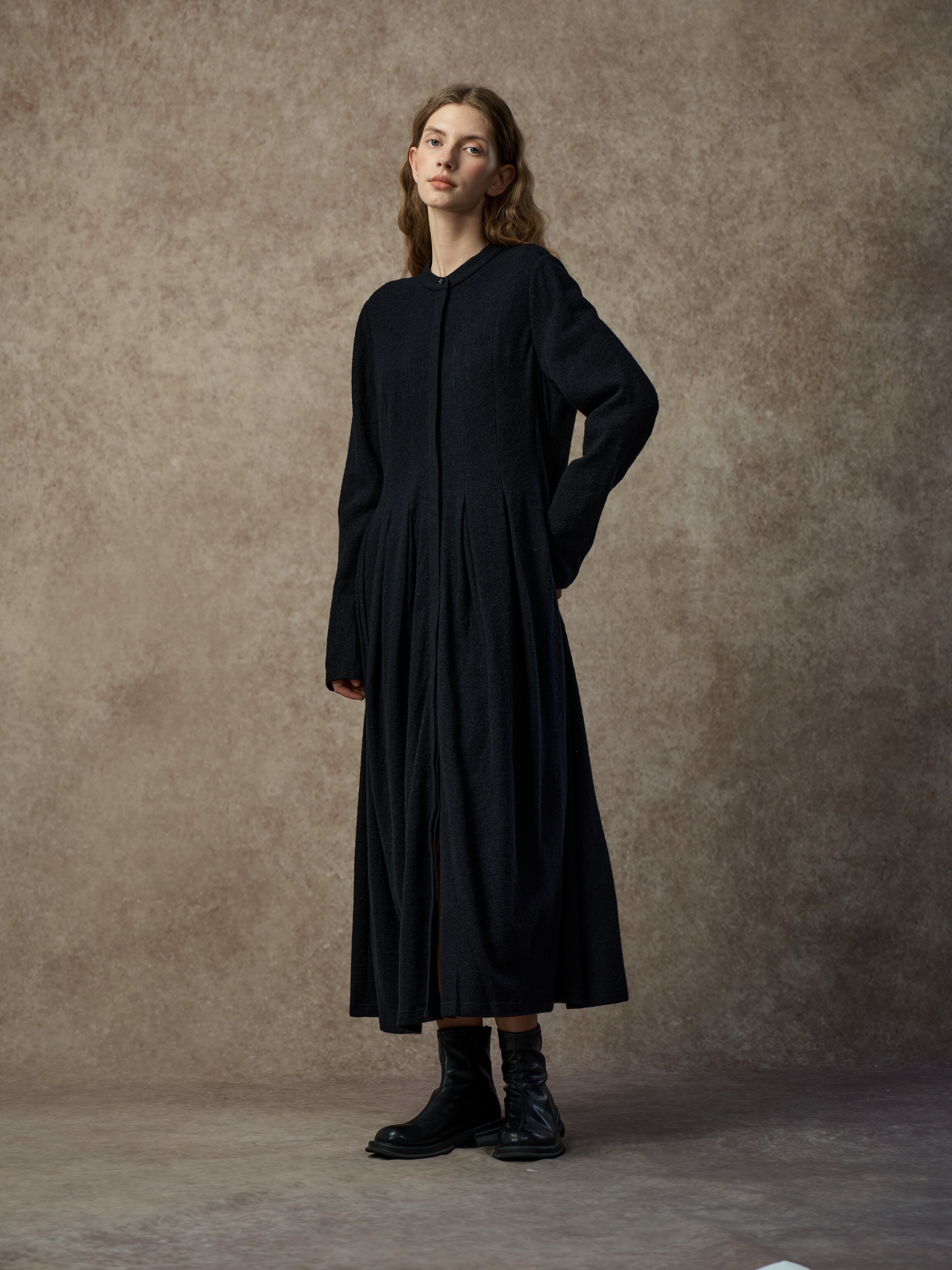 This open-front dress is made from a soft wool-cotton blend and can be worn as a dress or a lightweight coat. The fitted bodice and pleated A-line skirt create a flattering, elegant silhouette, while the premium fabric ensures warmth and comfort.