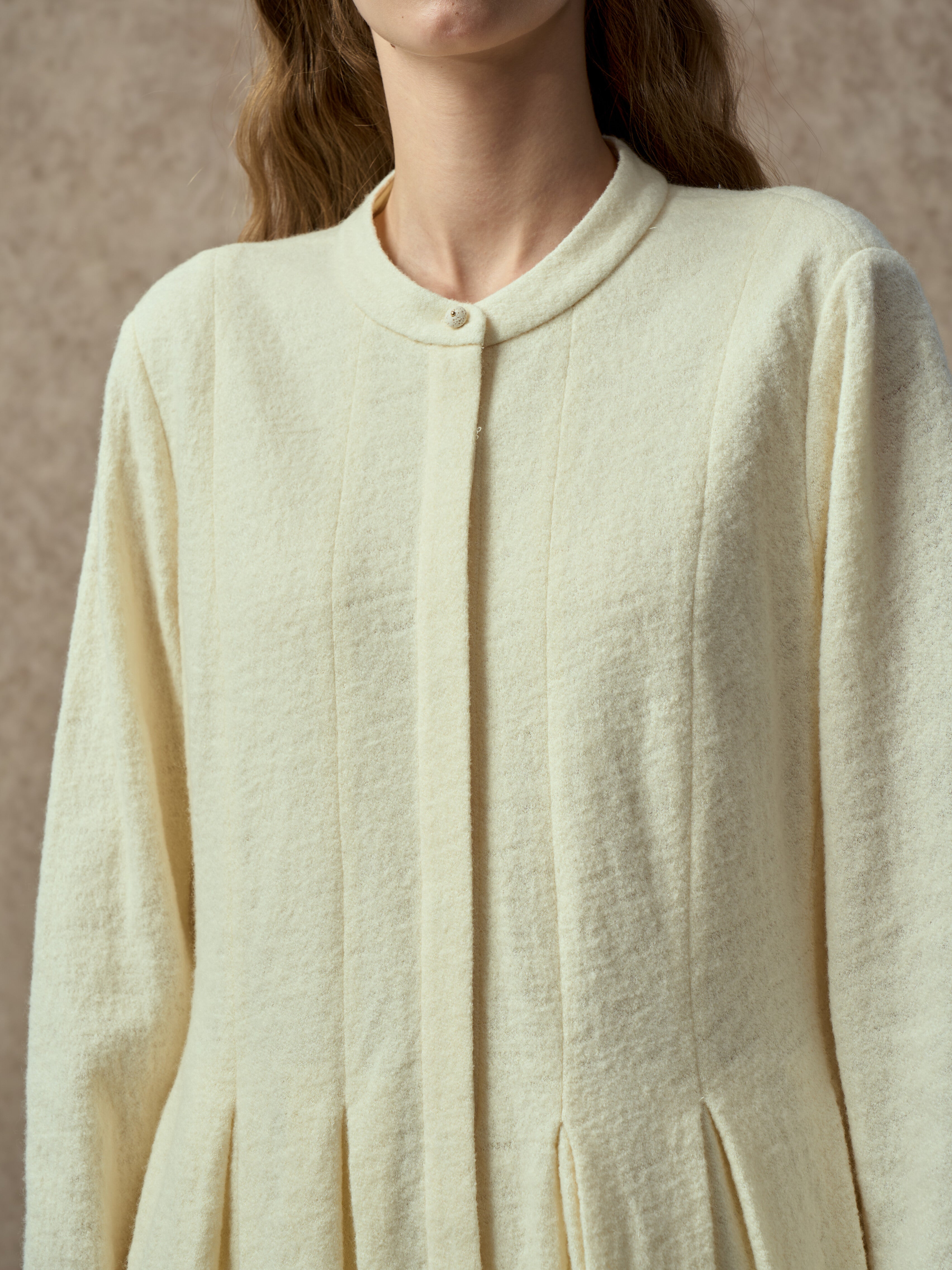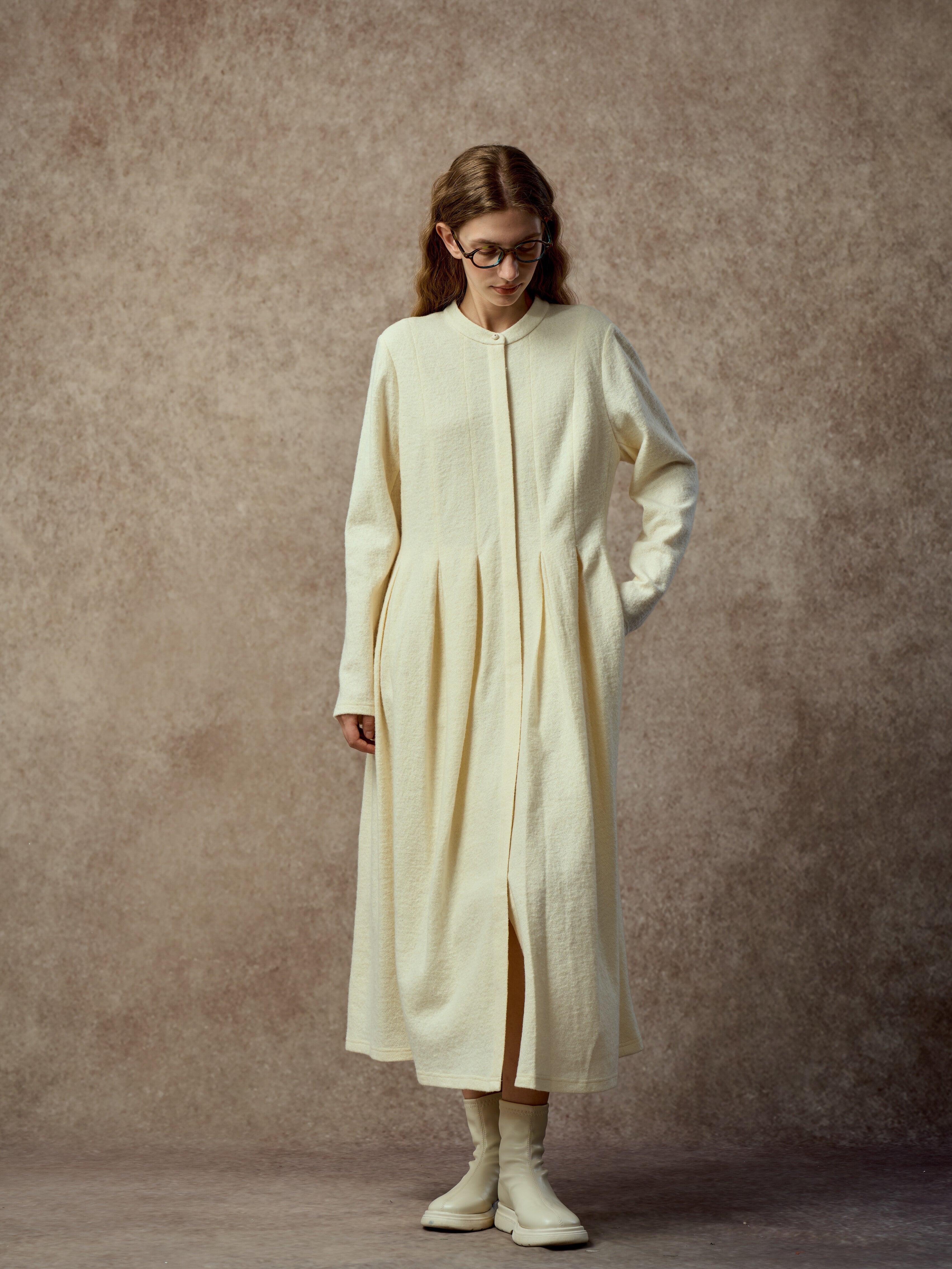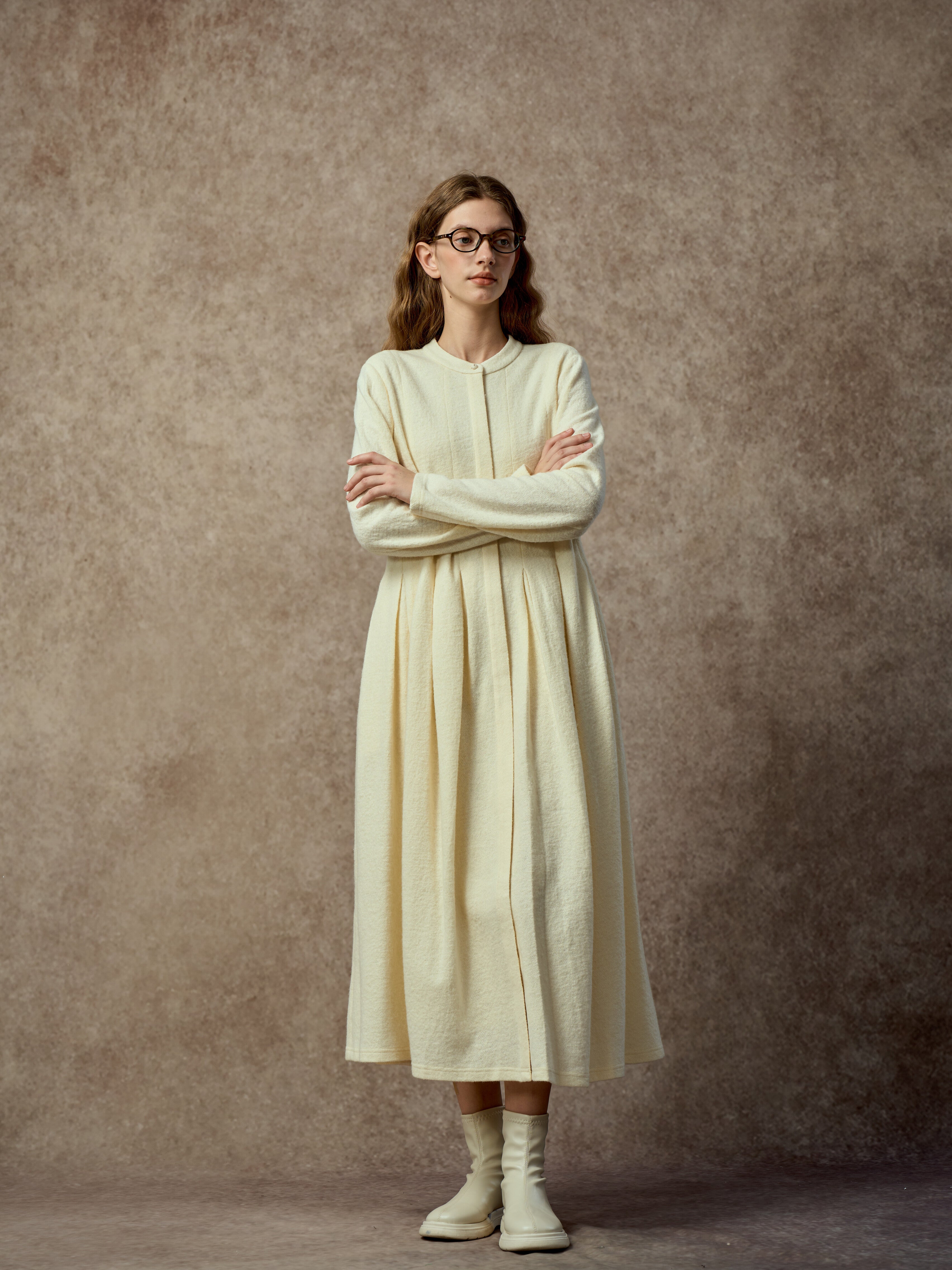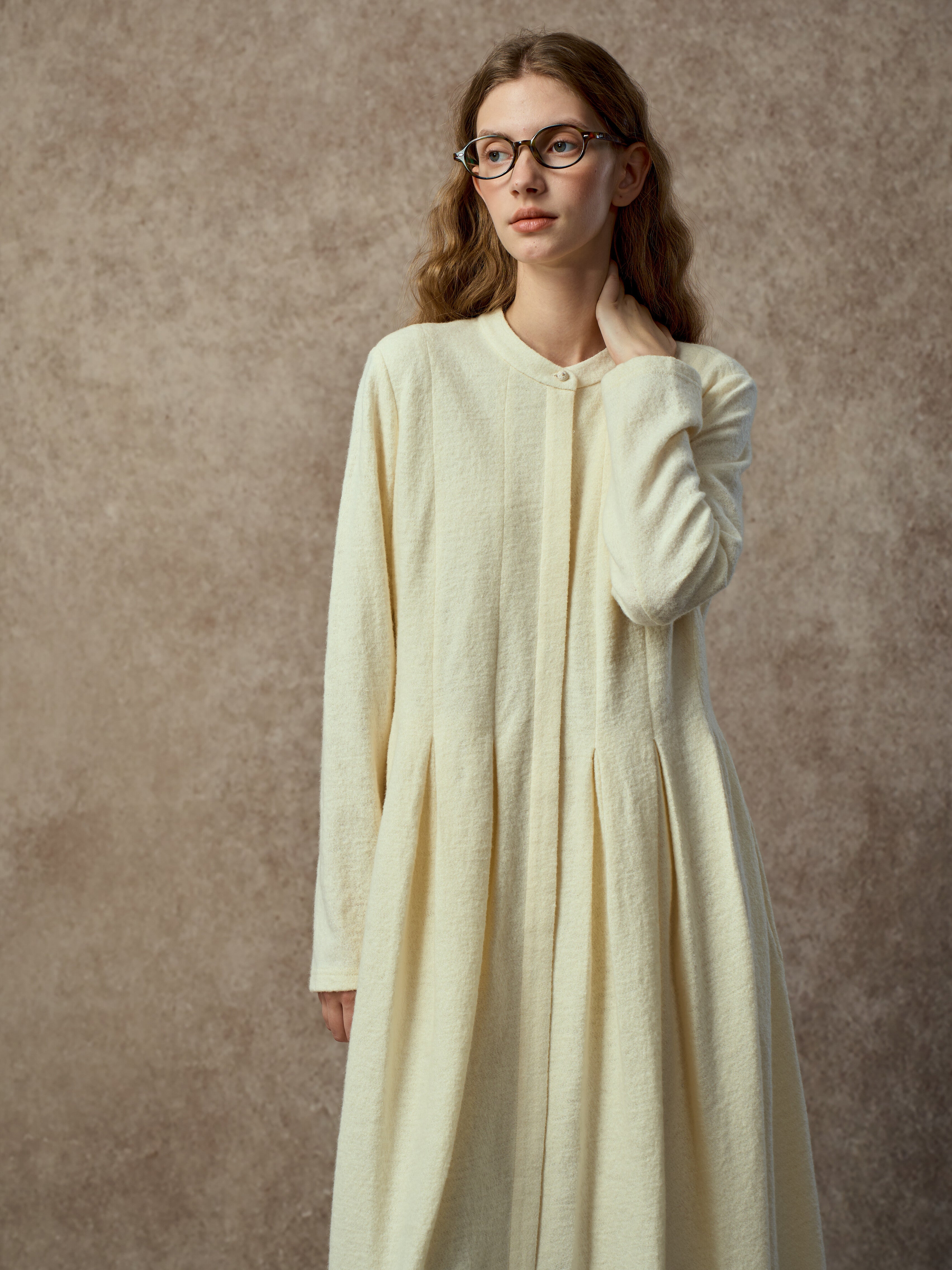 This open-front dress is made from a soft wool-cotton blend and can be worn as a dress or a lightweight coat. The fitted bodice and pleated A-line skirt create a flattering, elegant silhouette, while the premium fabric ensures warmth and comfort.