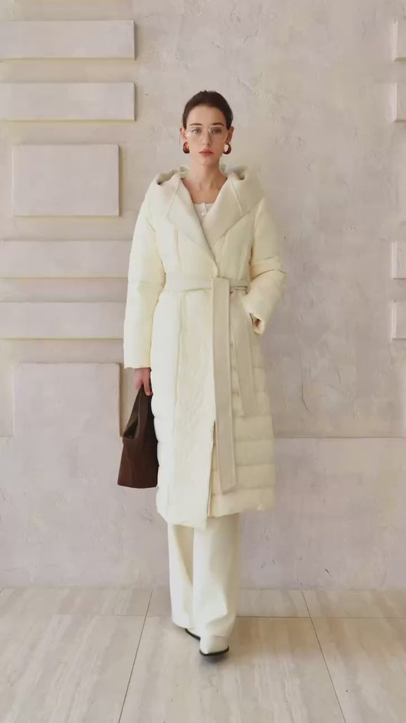 Famecoco Ultra-Light Long Belted Hooded Down Coat