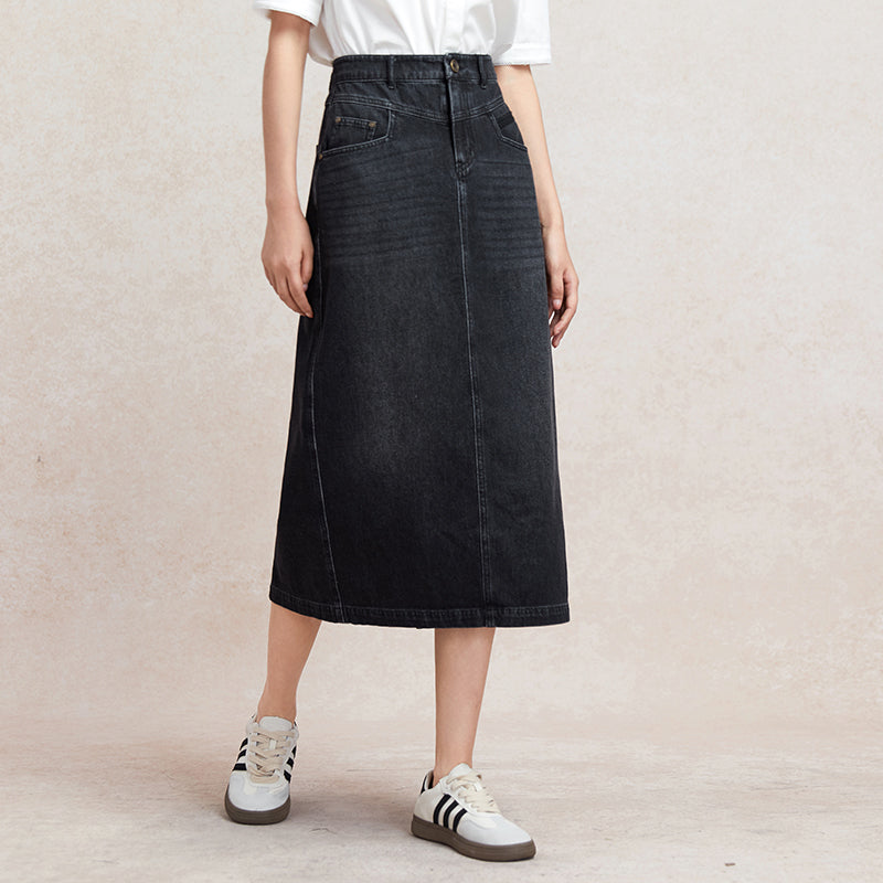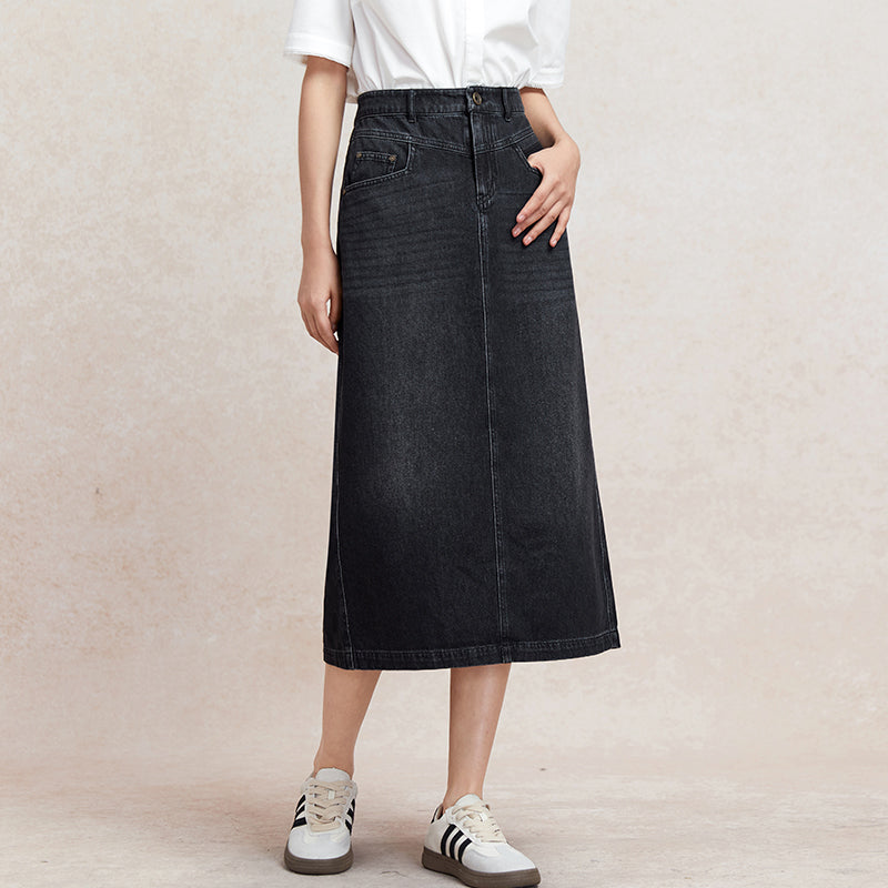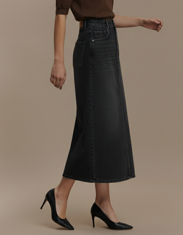 A vintage‑inspired A‑line skirt made from 100% cotton denim, featuring a high waist, practical pockets, and a washed black finish. Breathable, durable, and versatile for everyday wear.
