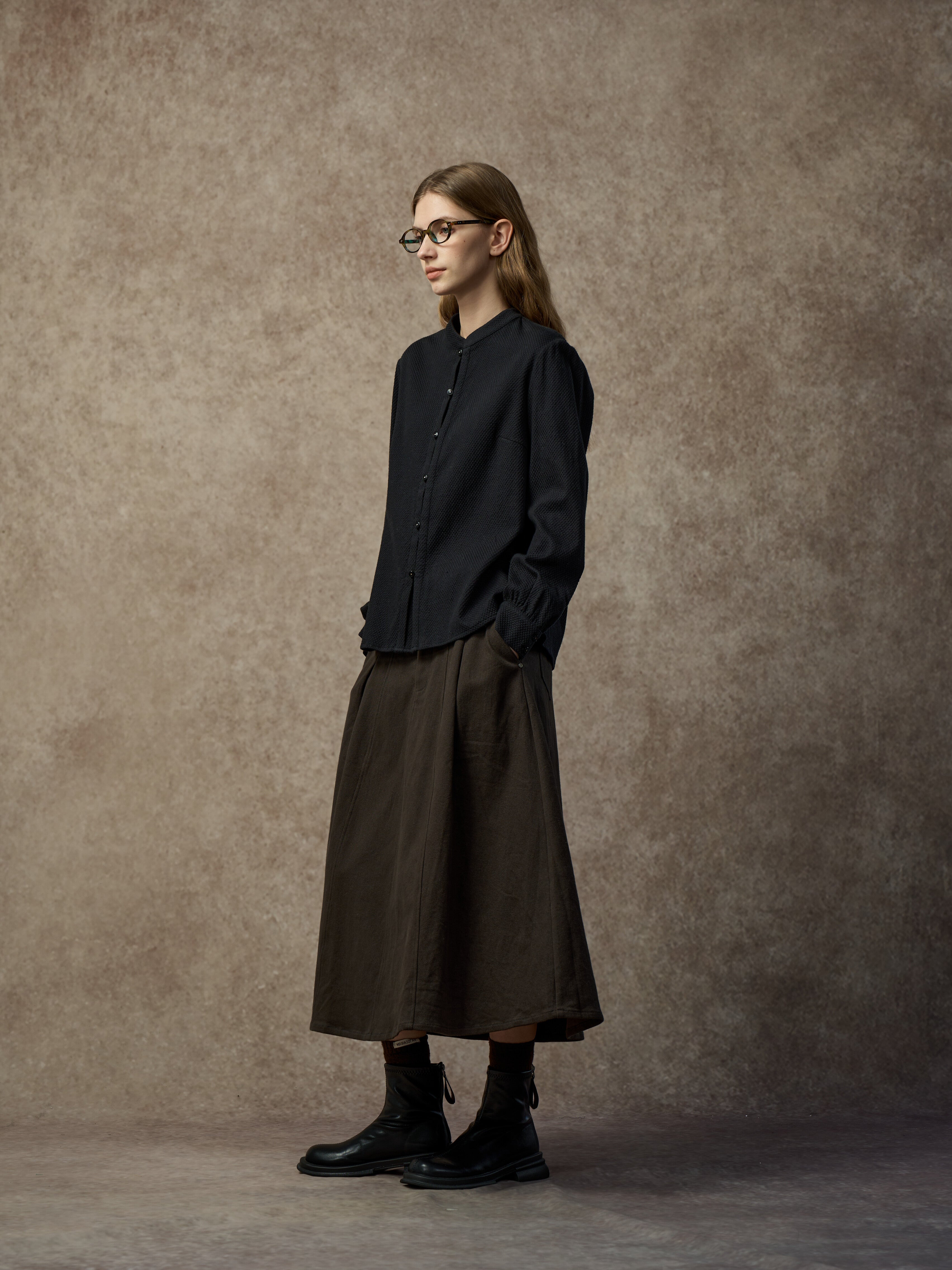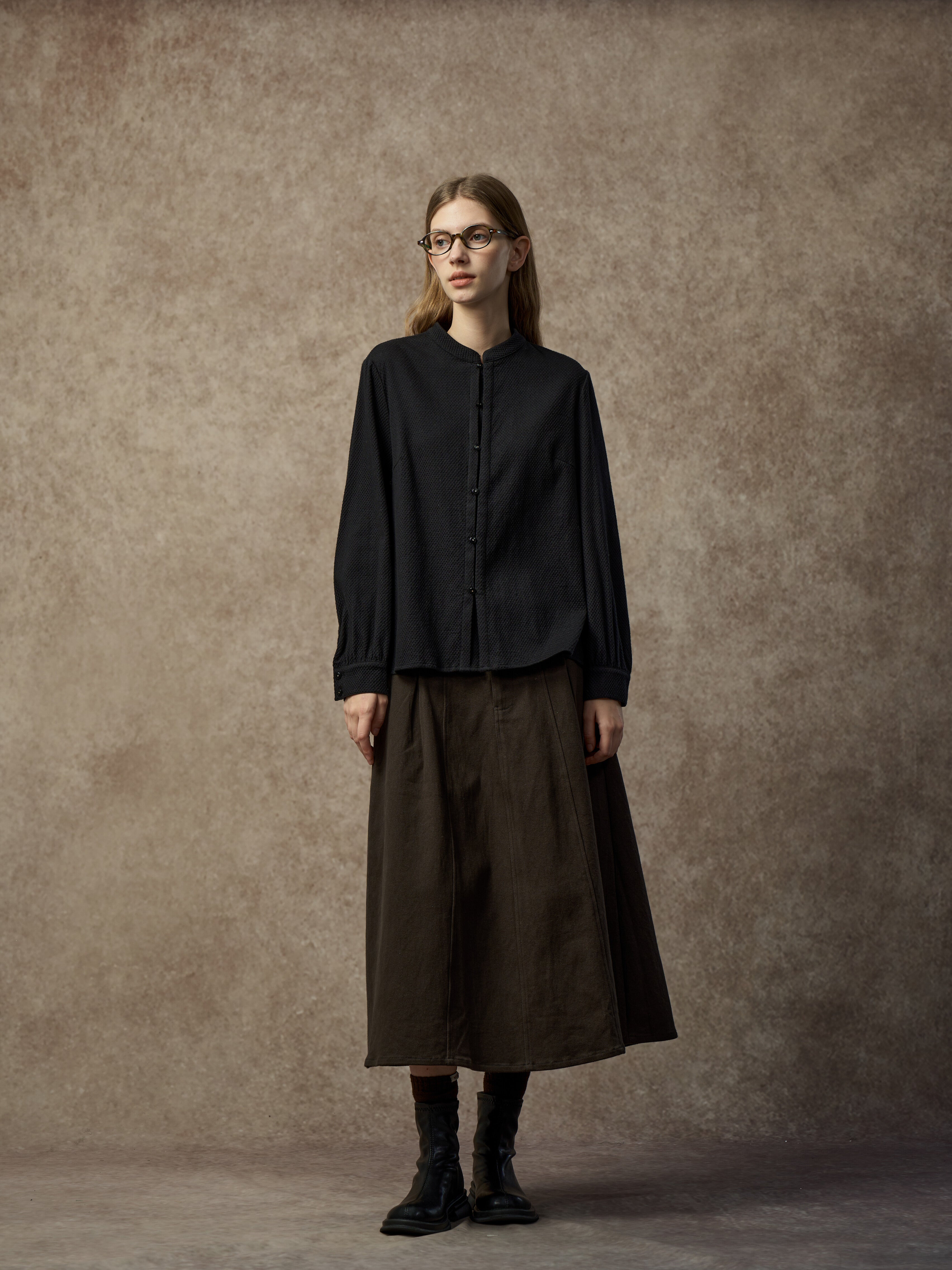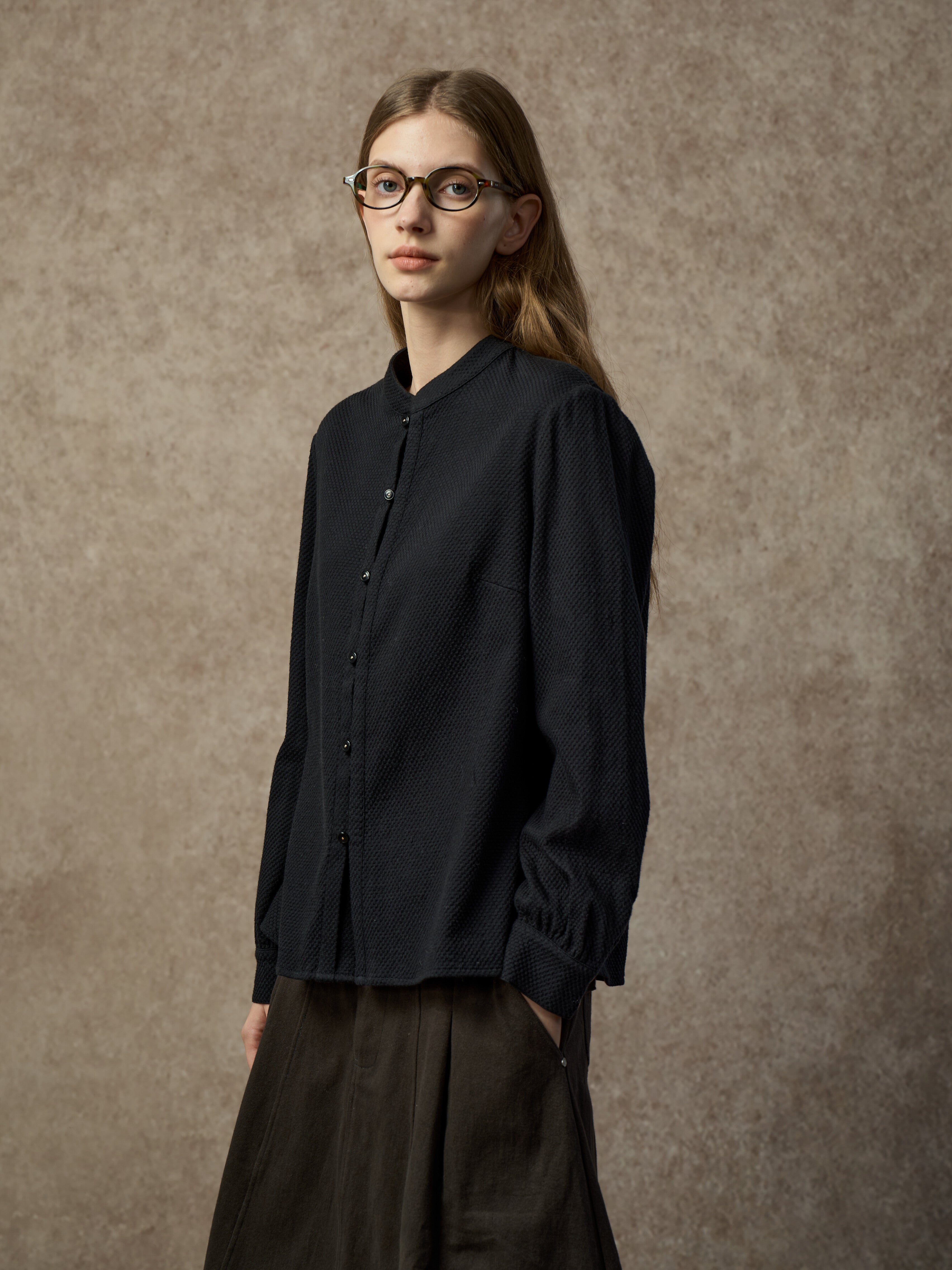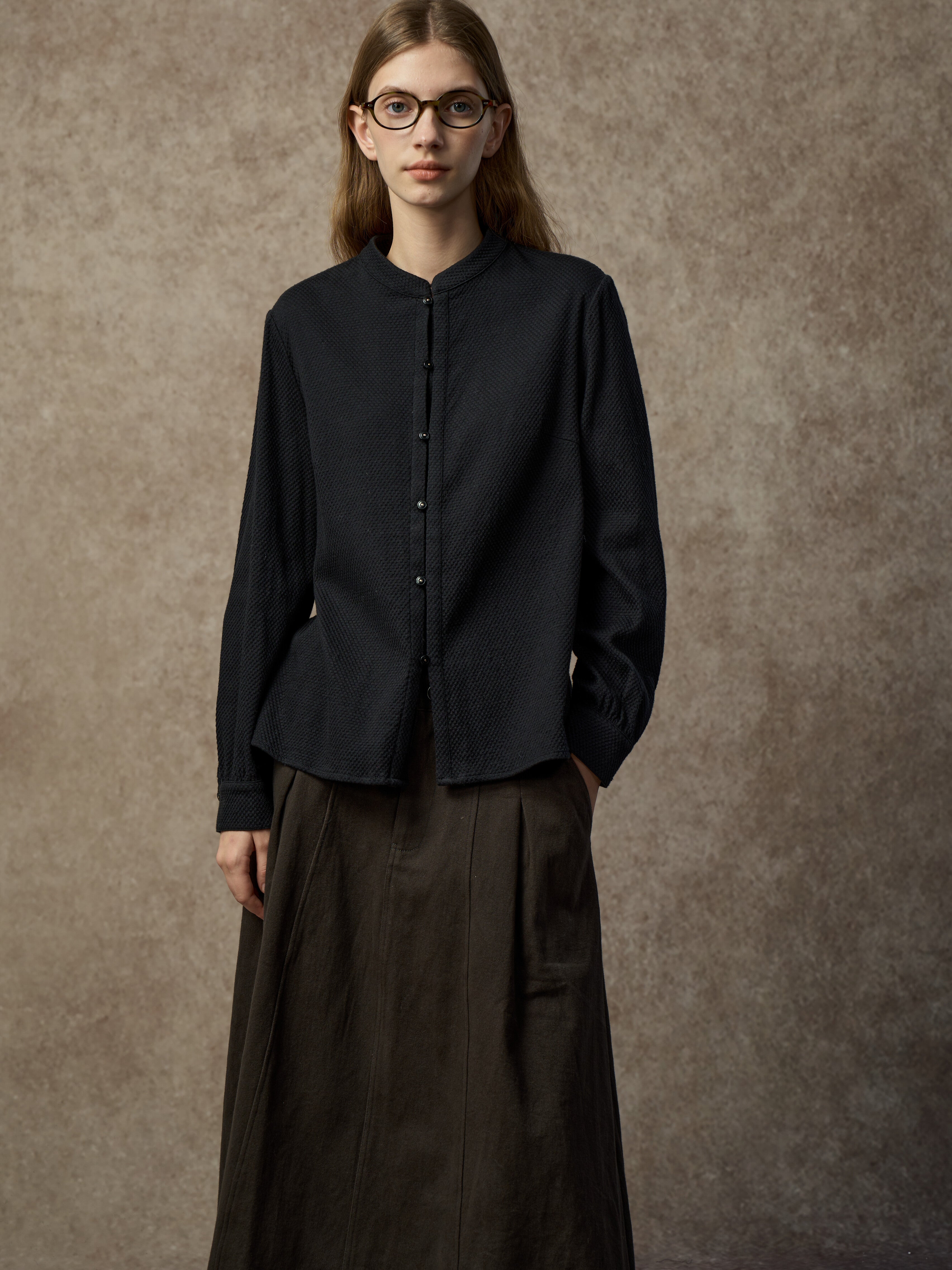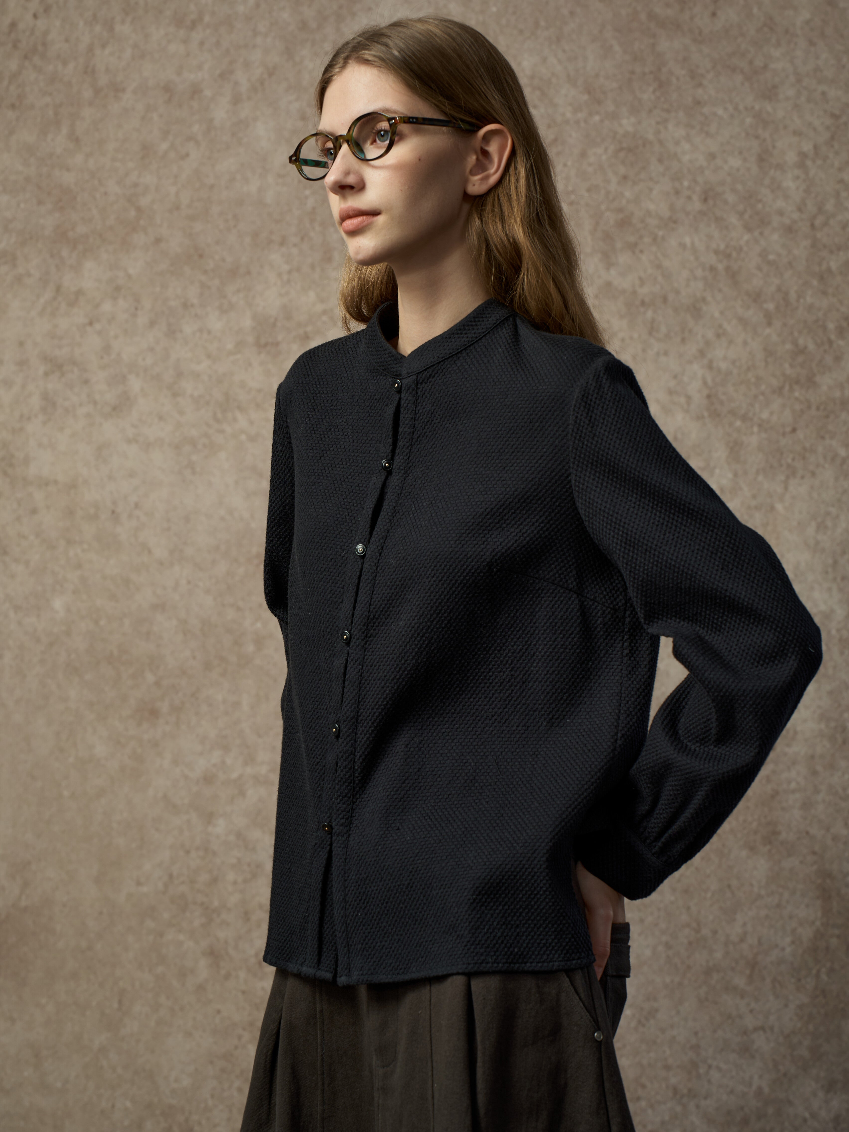 Famecoco Chic Mandarin Collar Textured Blouse