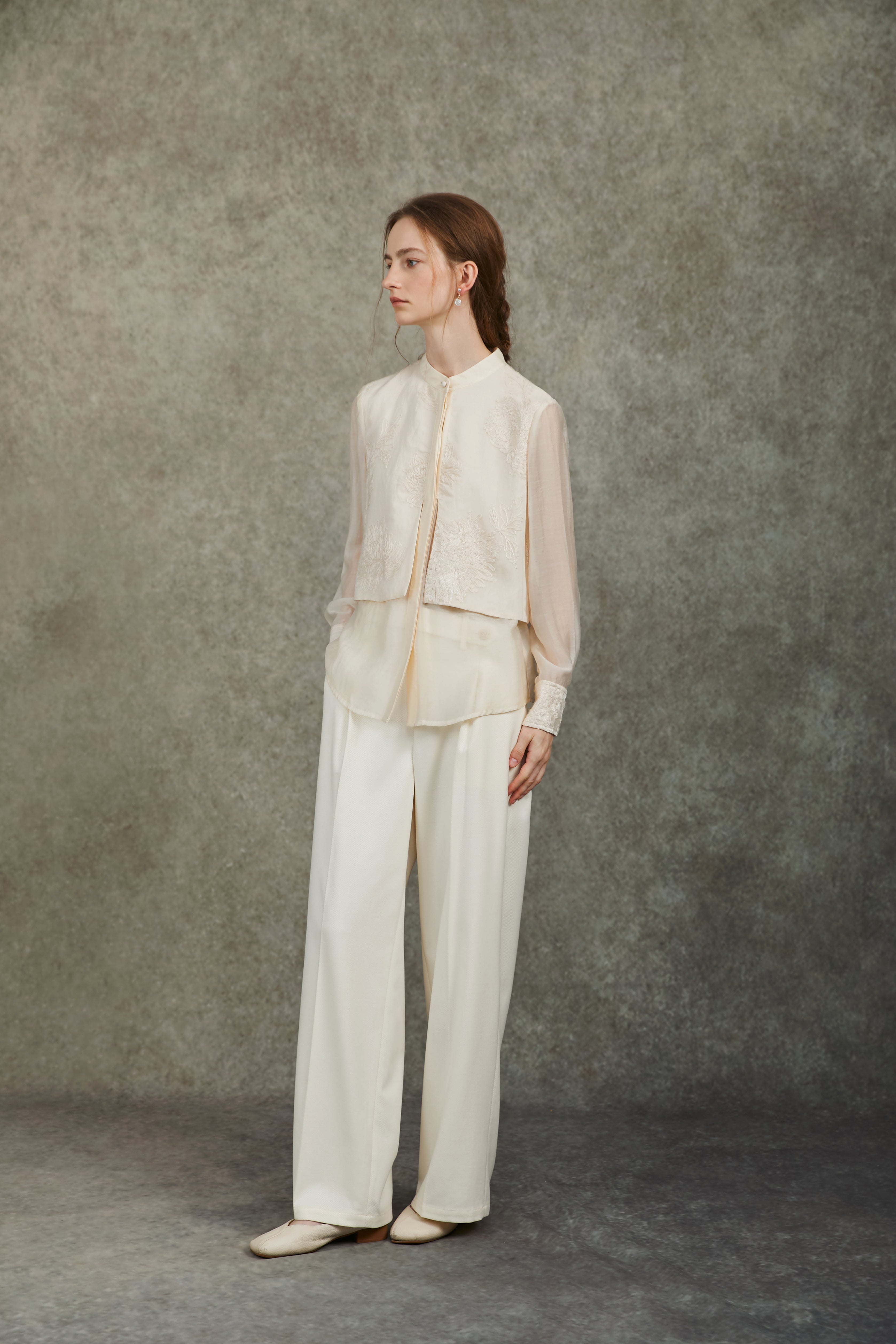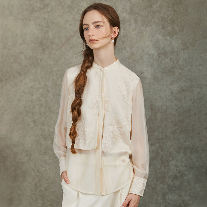 Famecoco Embroidered Cuff Mandarin Collar Blouse