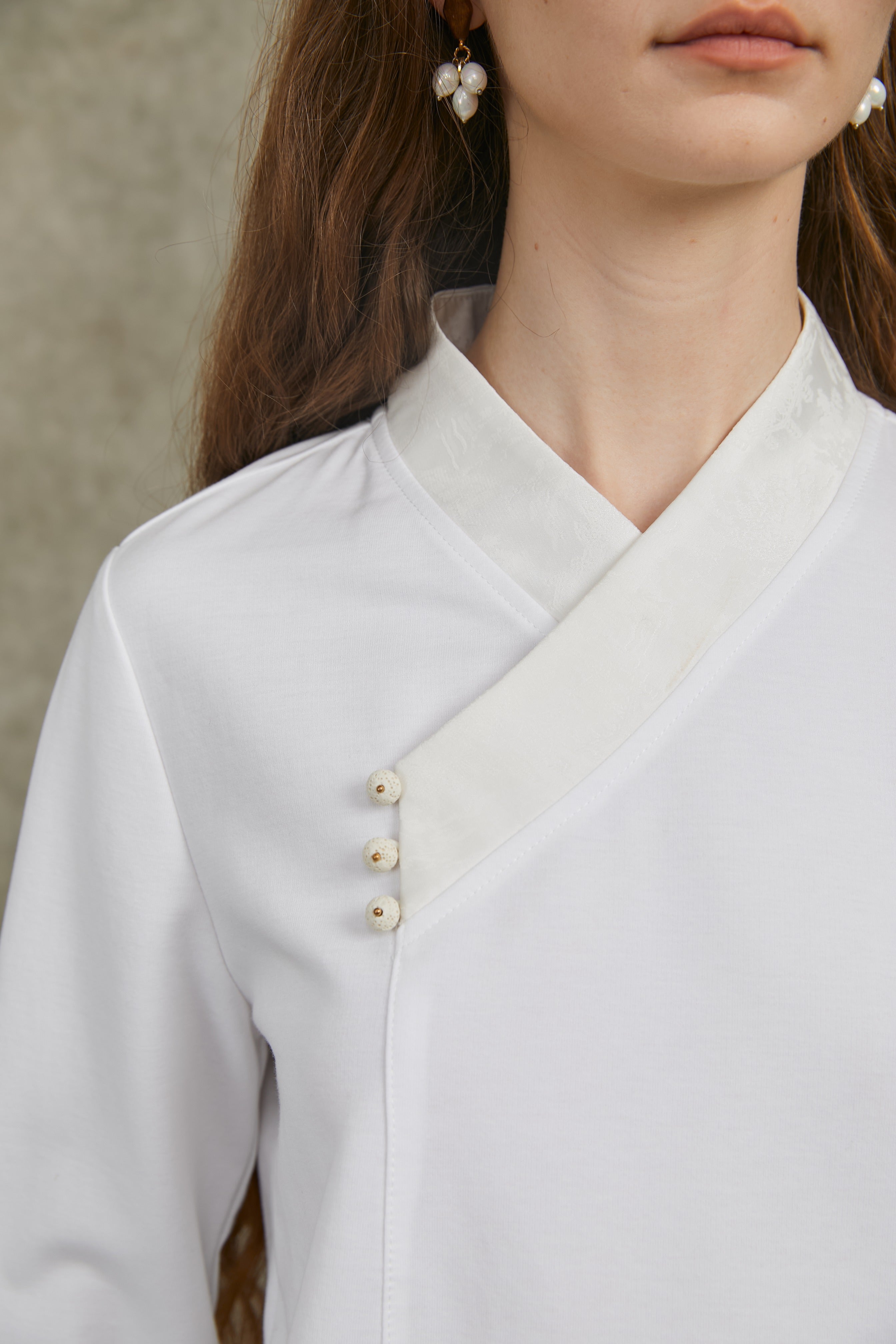 Famecoco Satin Mandarin Collar Blouse with Pearl Buttons