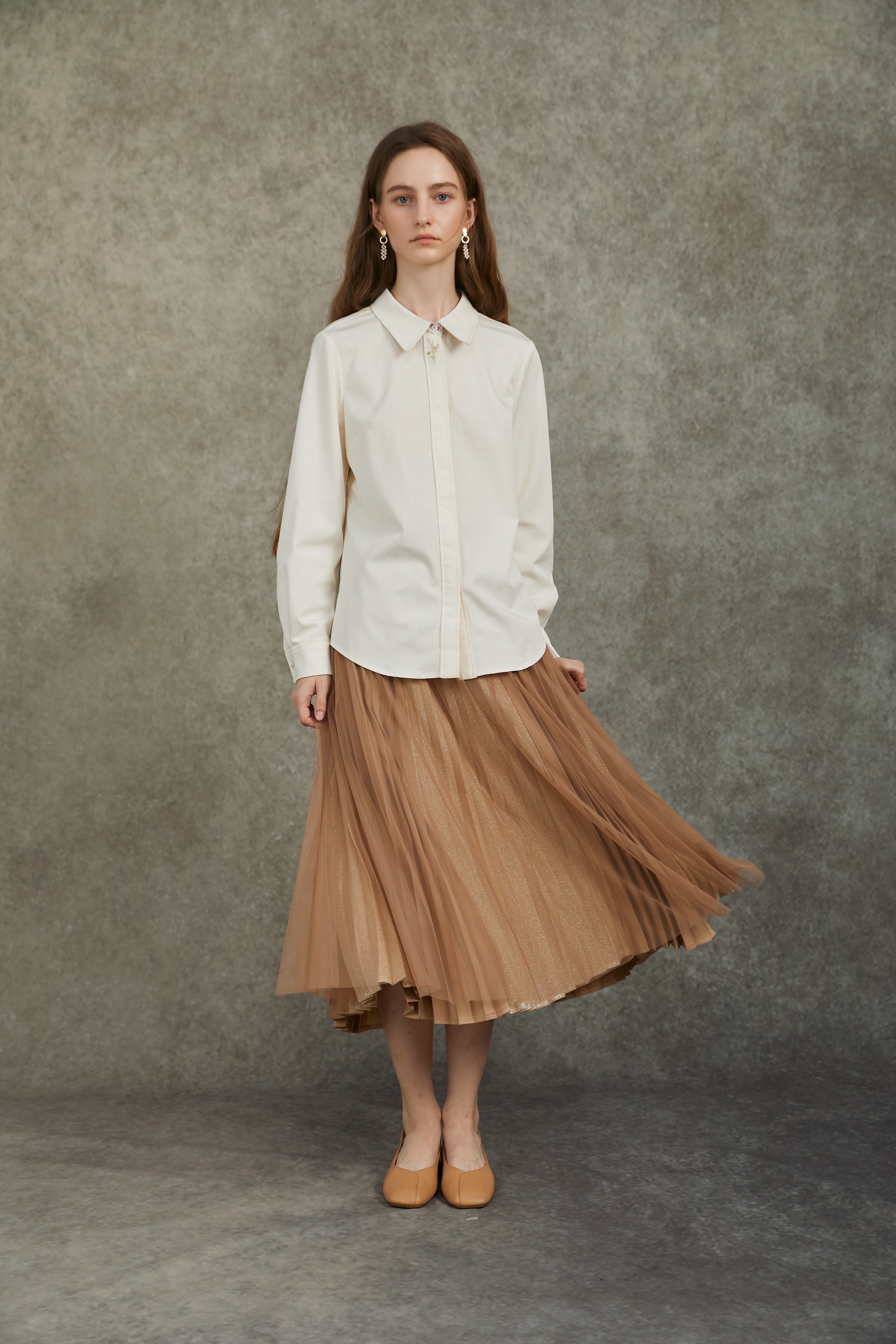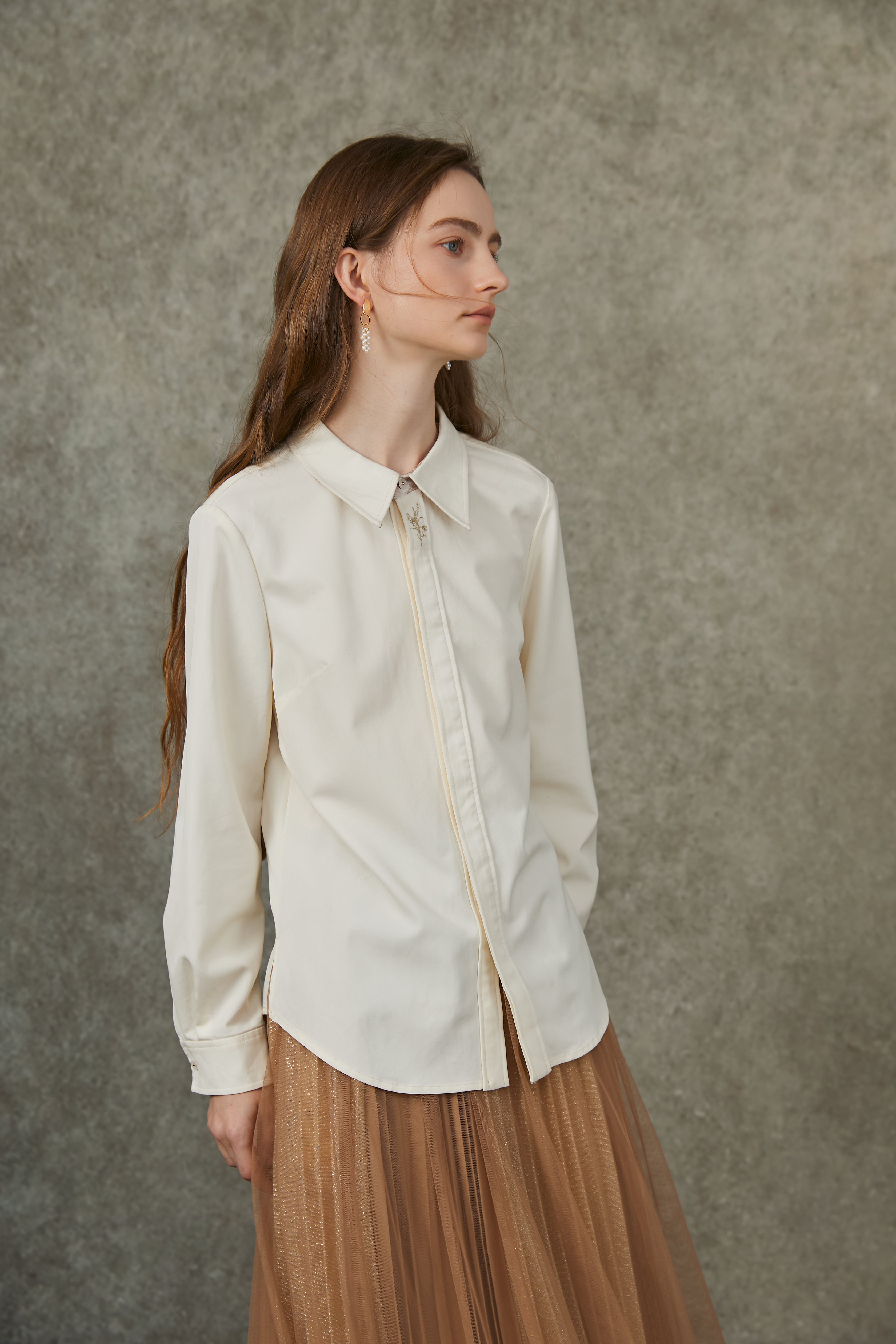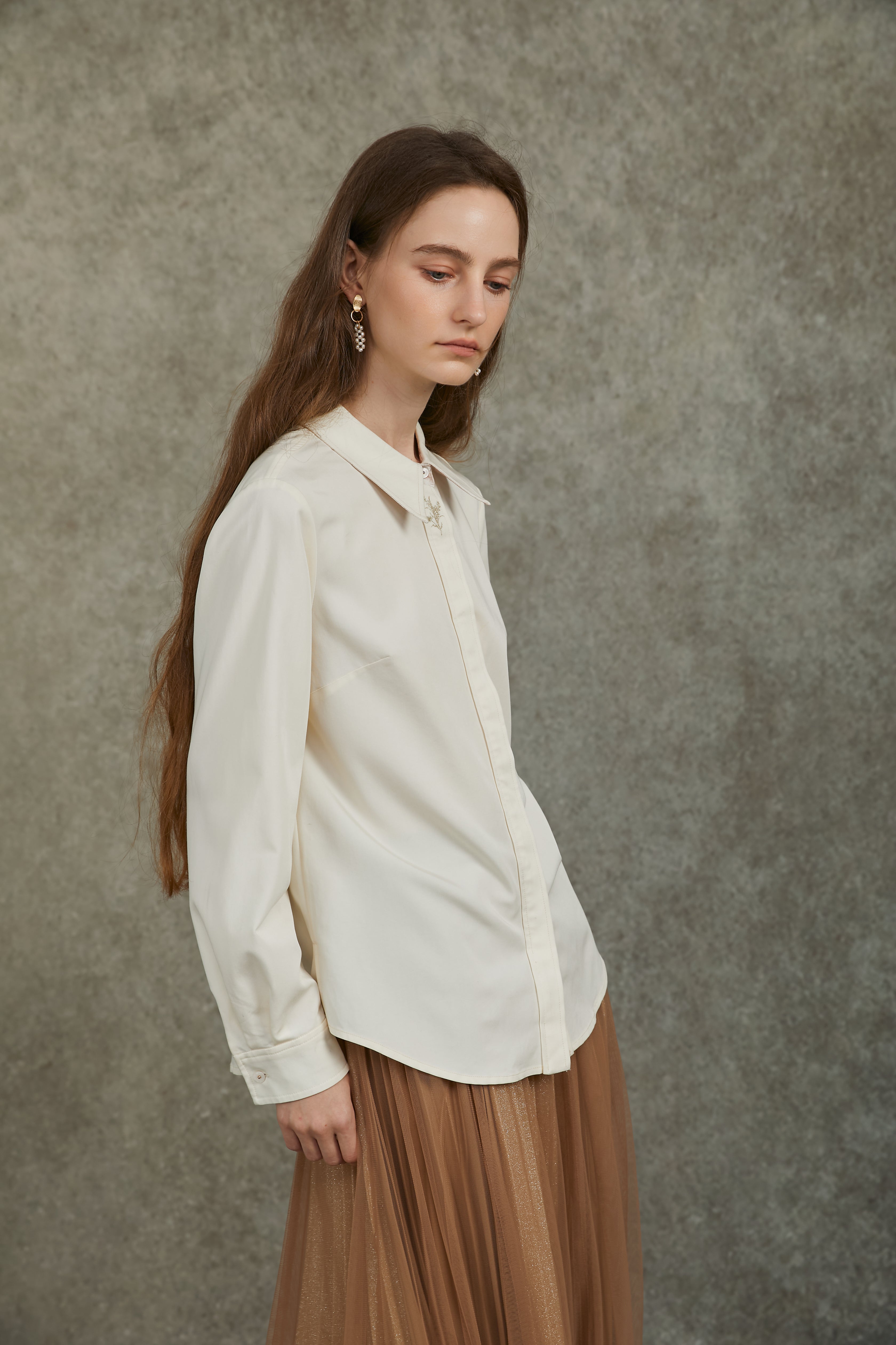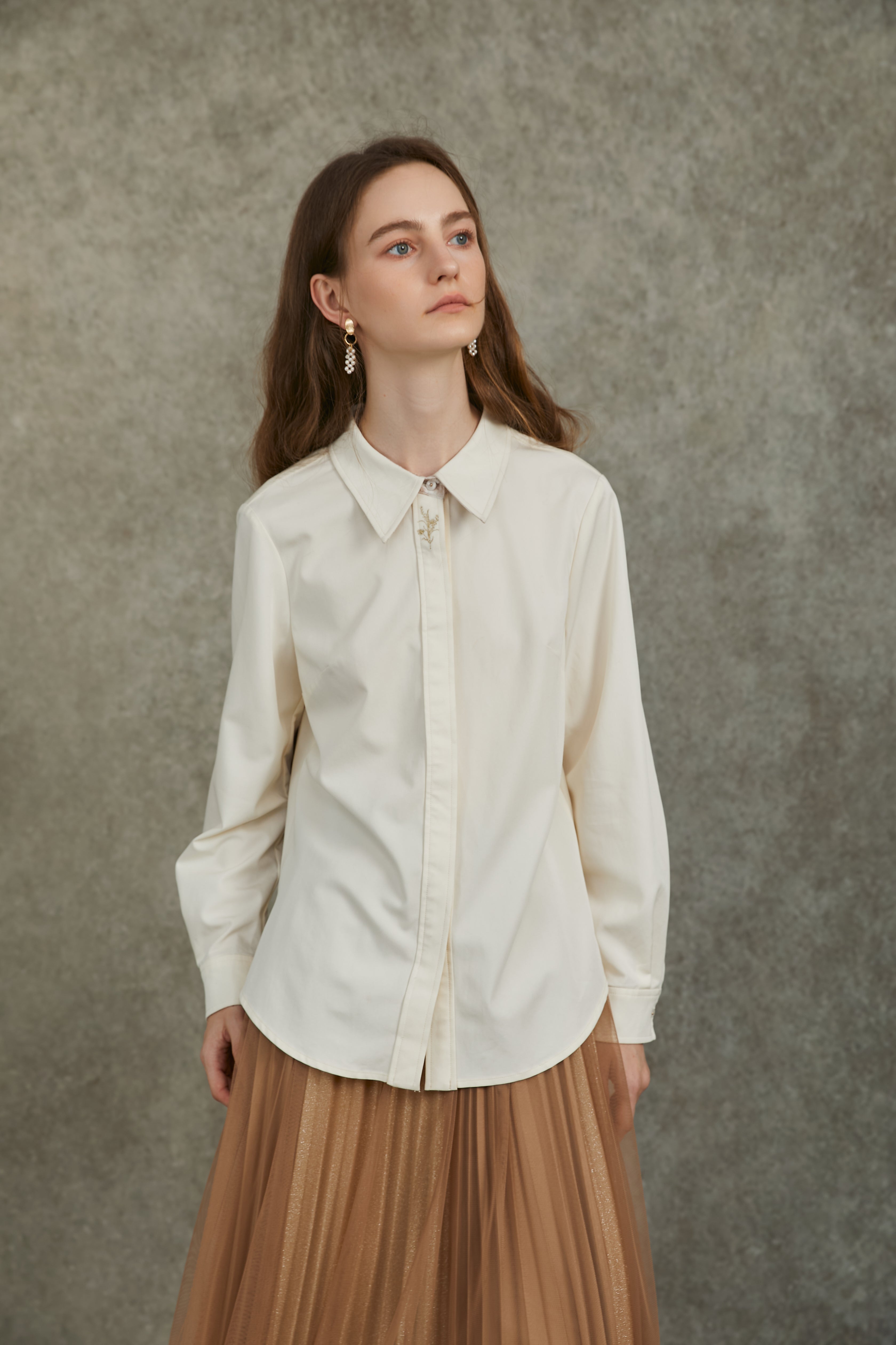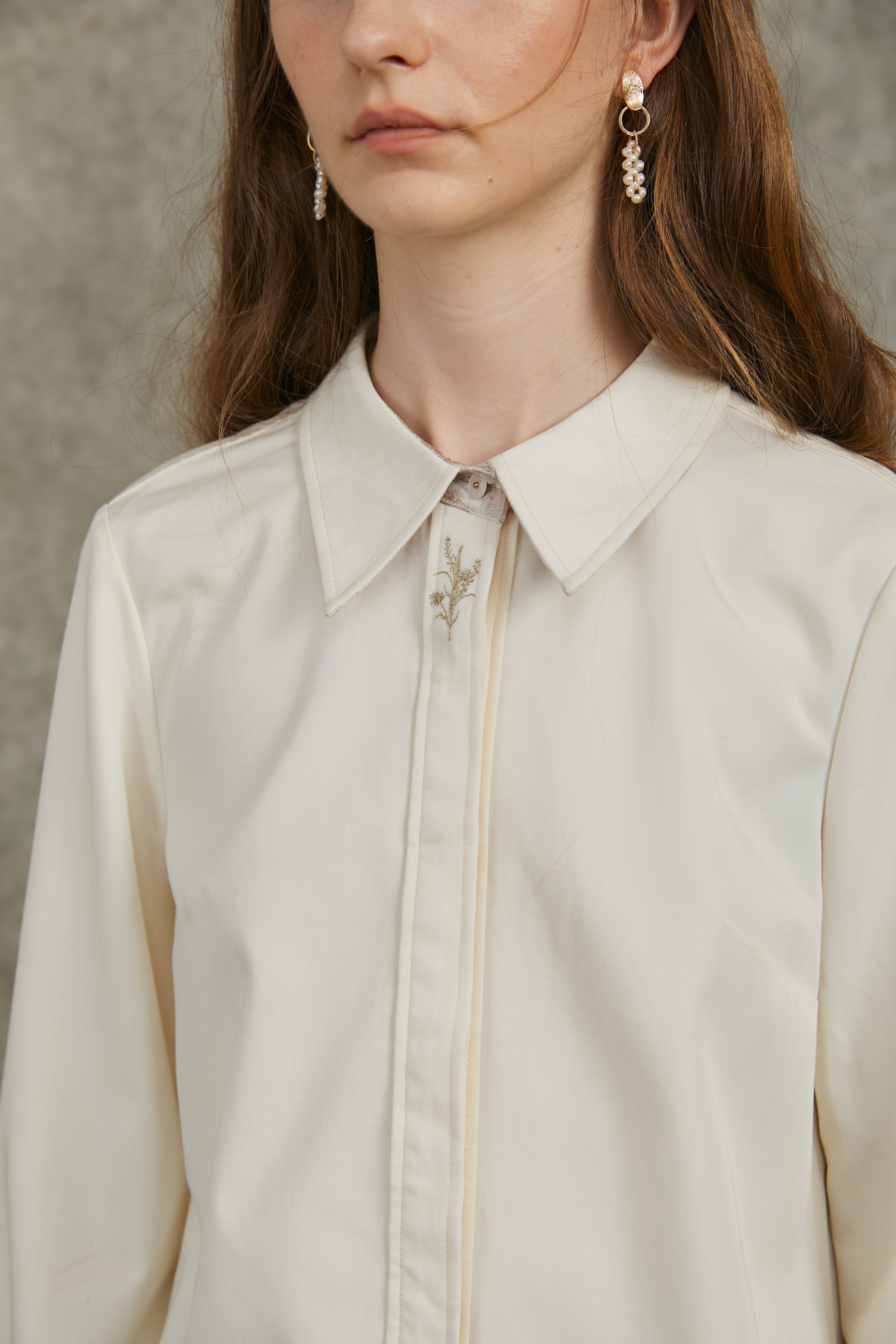 A viscose‑polyester blend blouse with a smooth, breathable finish. Features a classic collar with hidden floral embroidery for a subtle touch of elegance.