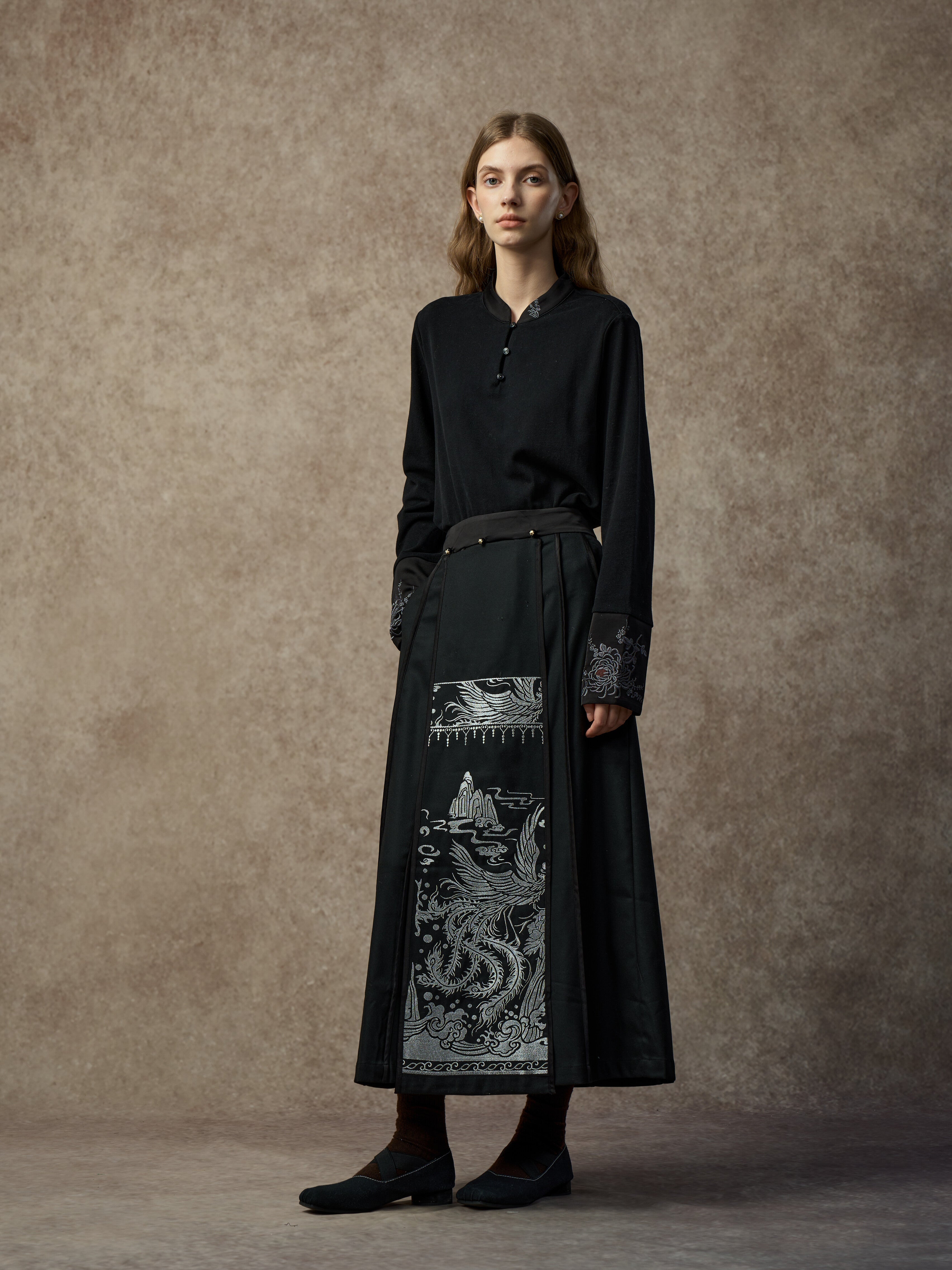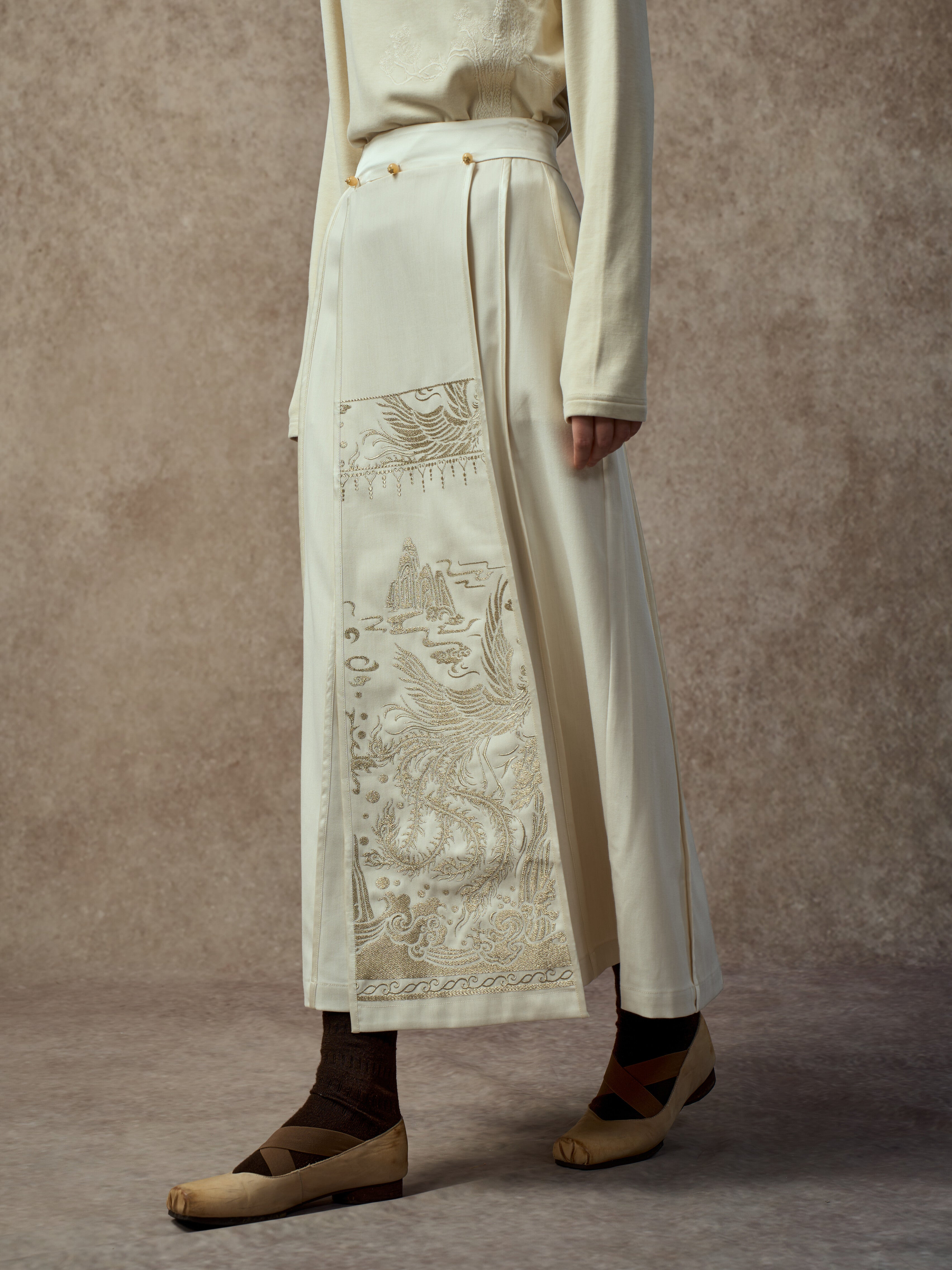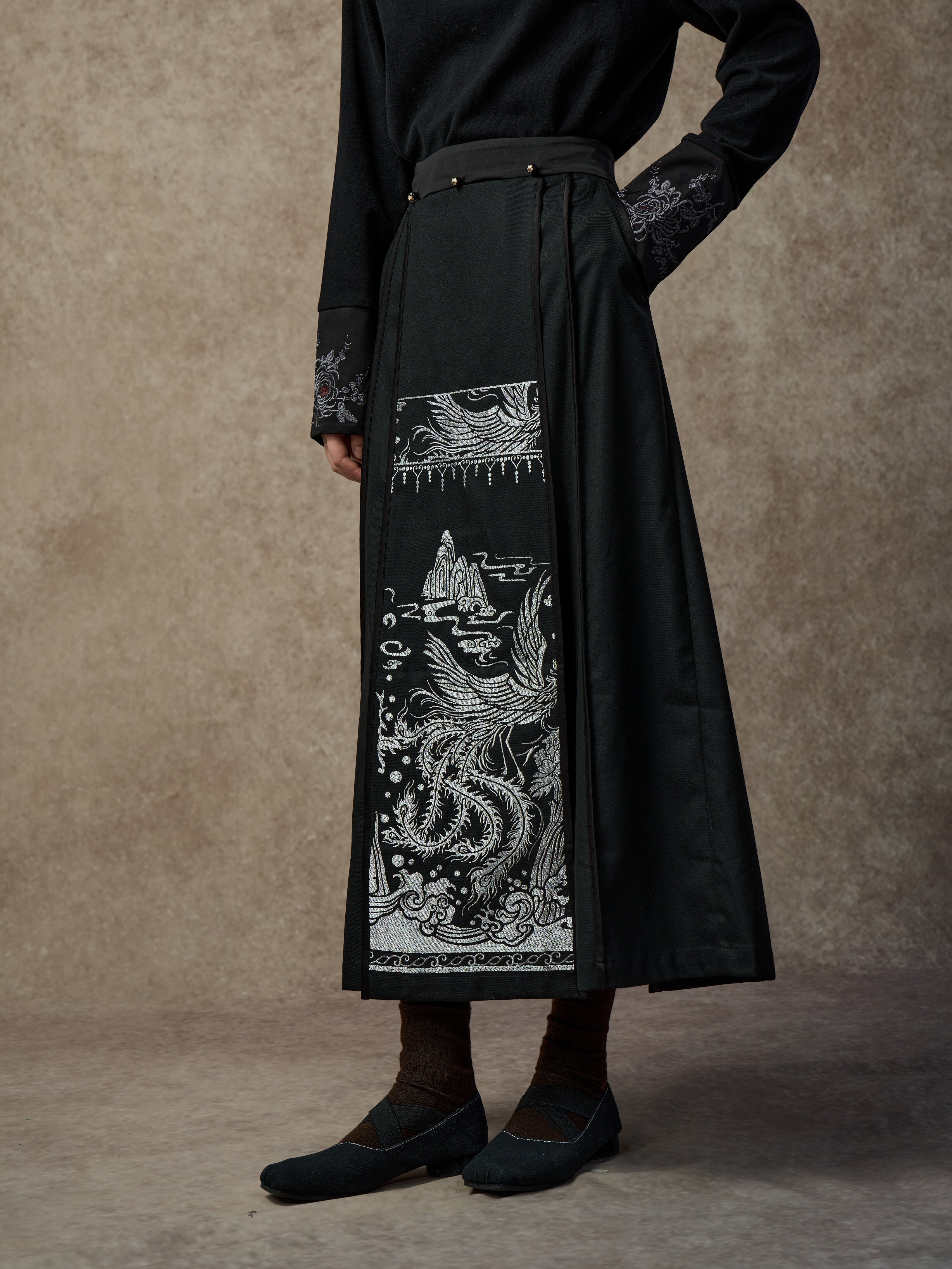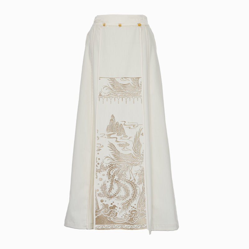 A Mamian skirt with a detachable embroidered front panel for two looks—traditional or A‑line. Gold‑thread phoenix embroidery adds striking detail, while the slimming A‑line fit flatters and conceals. Finished with a side zipper for easy wear.