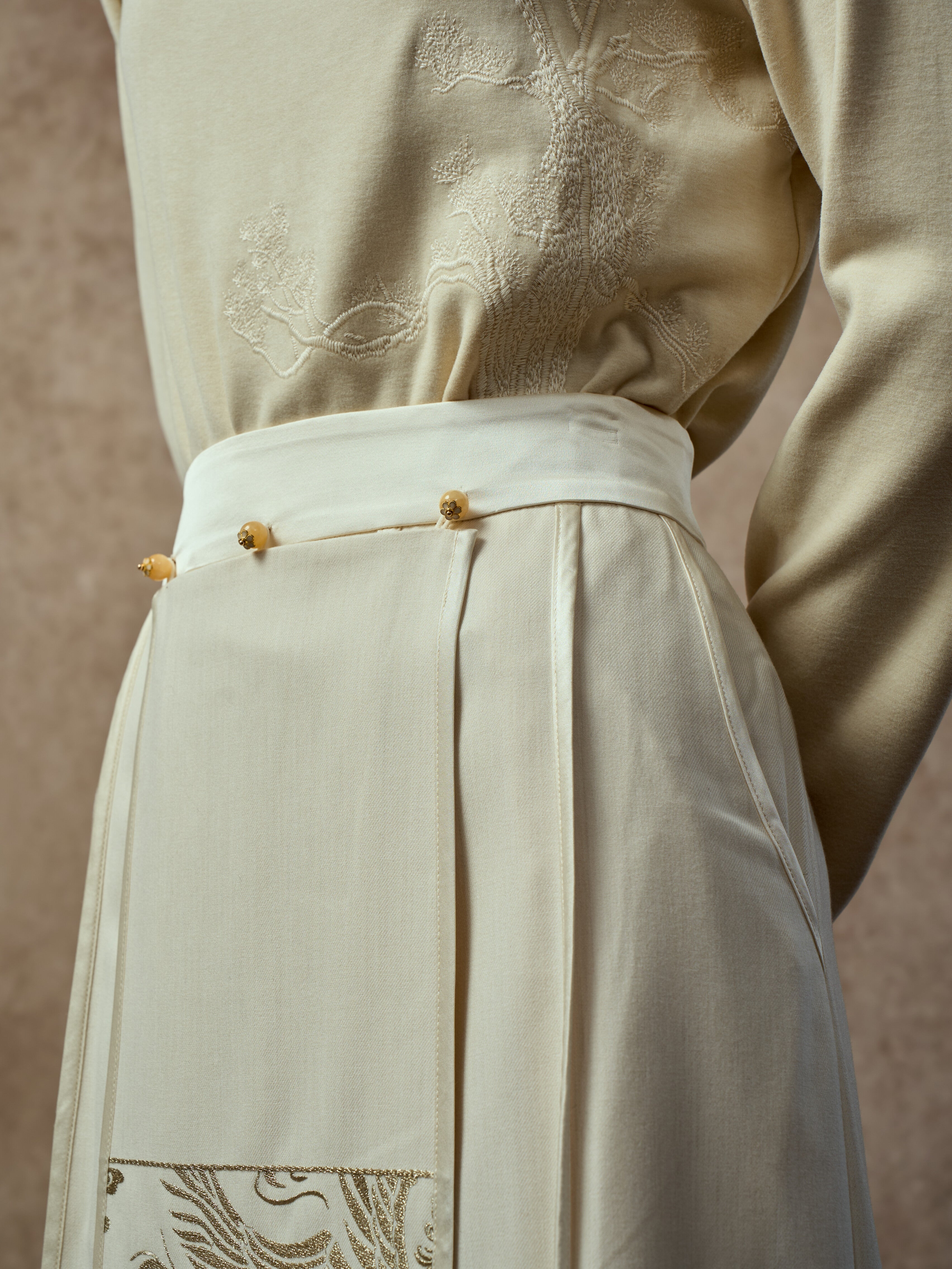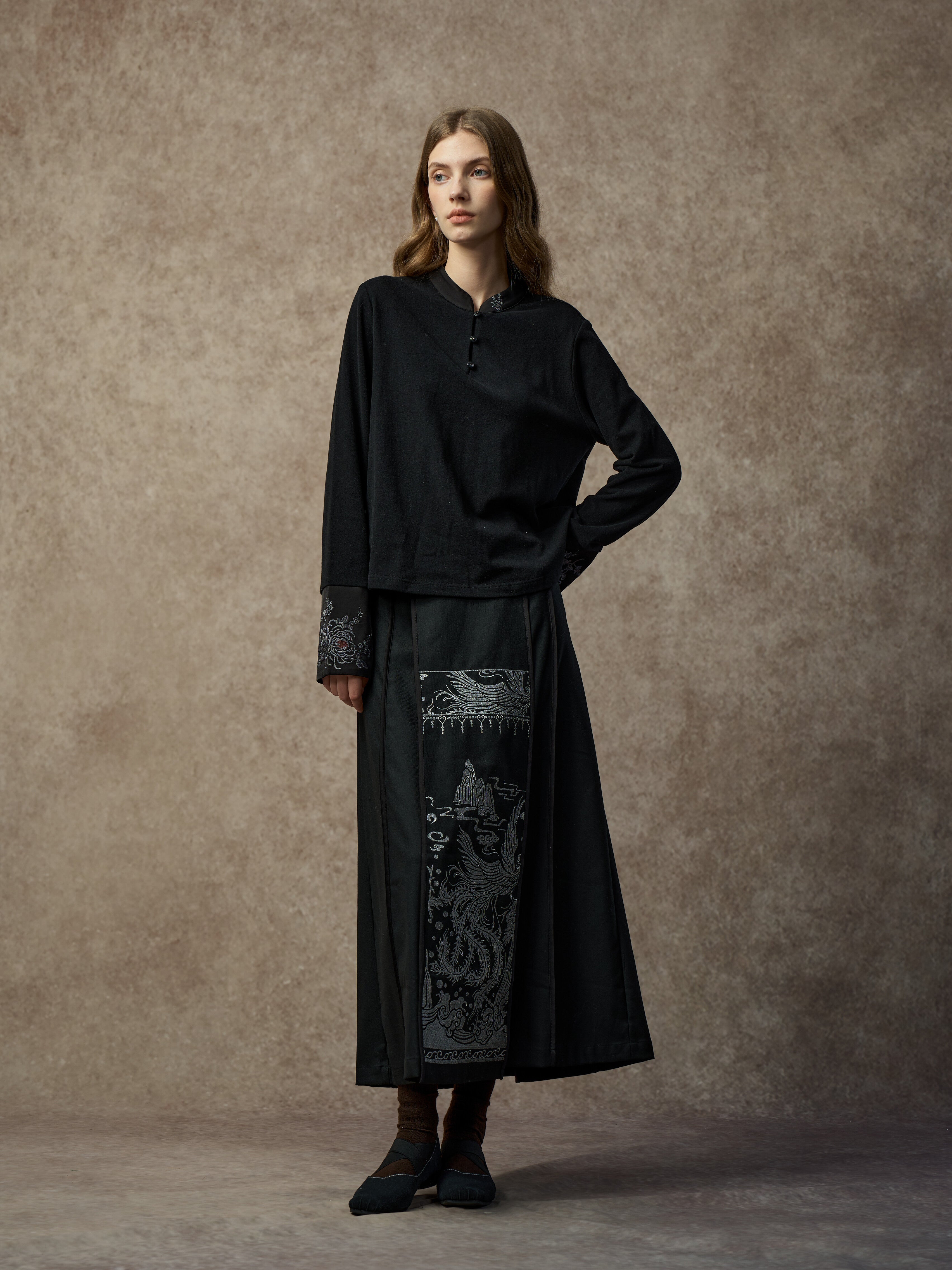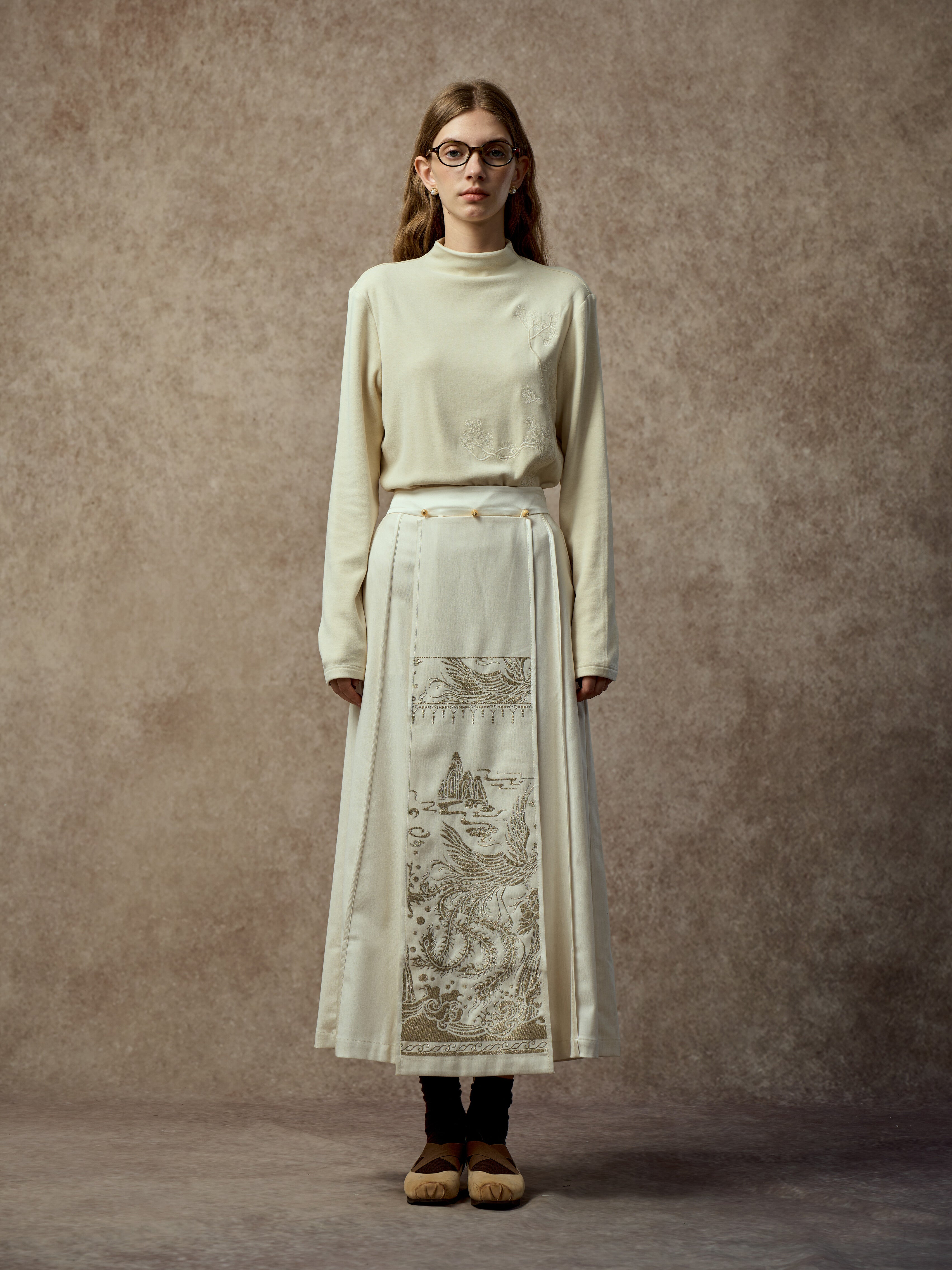A Mamian skirt with a detachable embroidered front panel for two looks—traditional or A‑line. Gold‑thread phoenix embroidery adds striking detail, while the slimming A‑line fit flatters and conceals. Finished with a side zipper for easy wear.