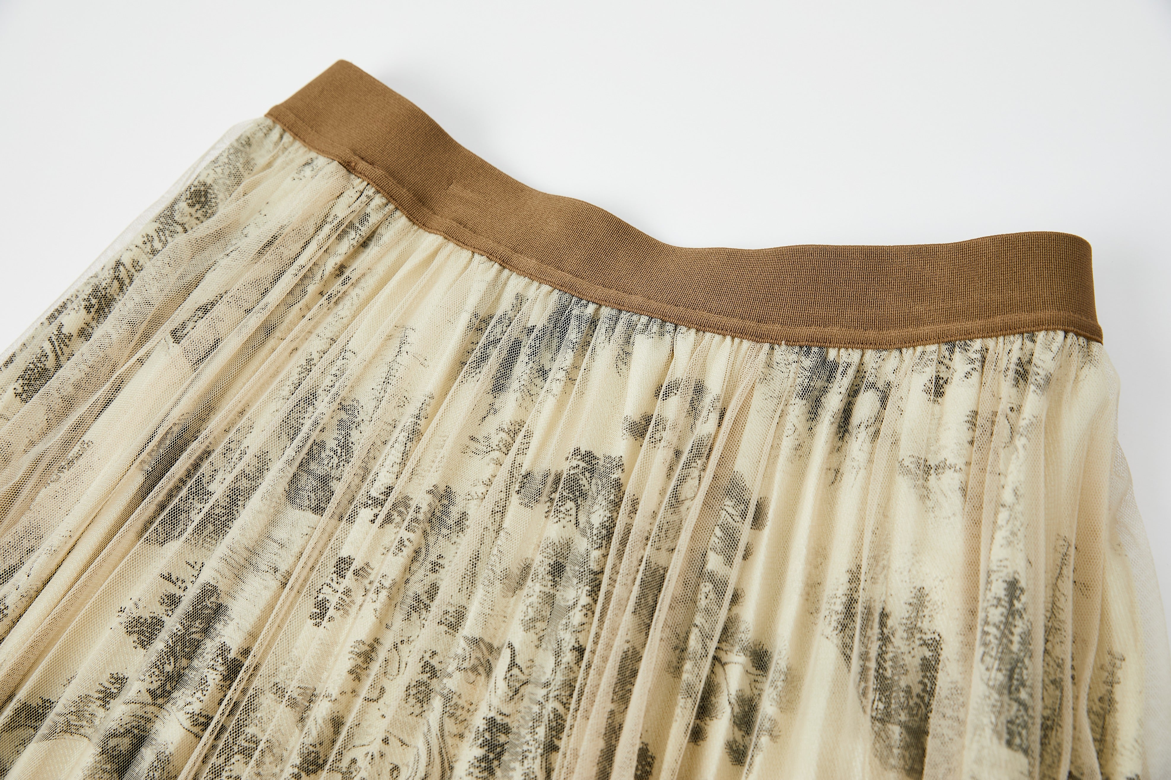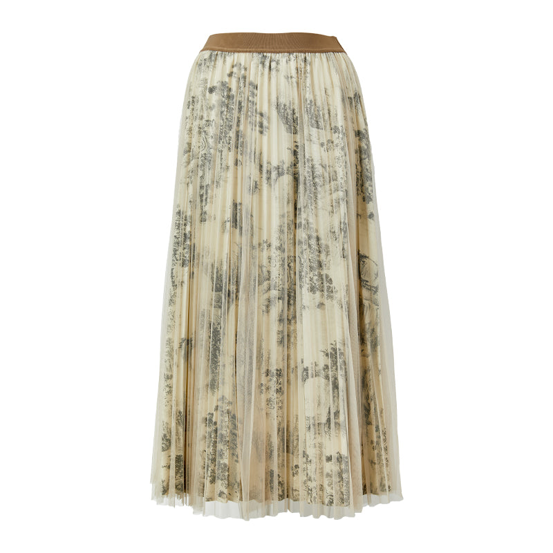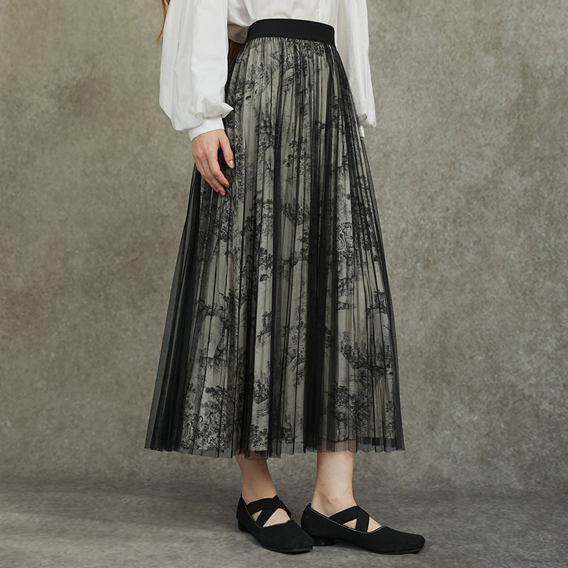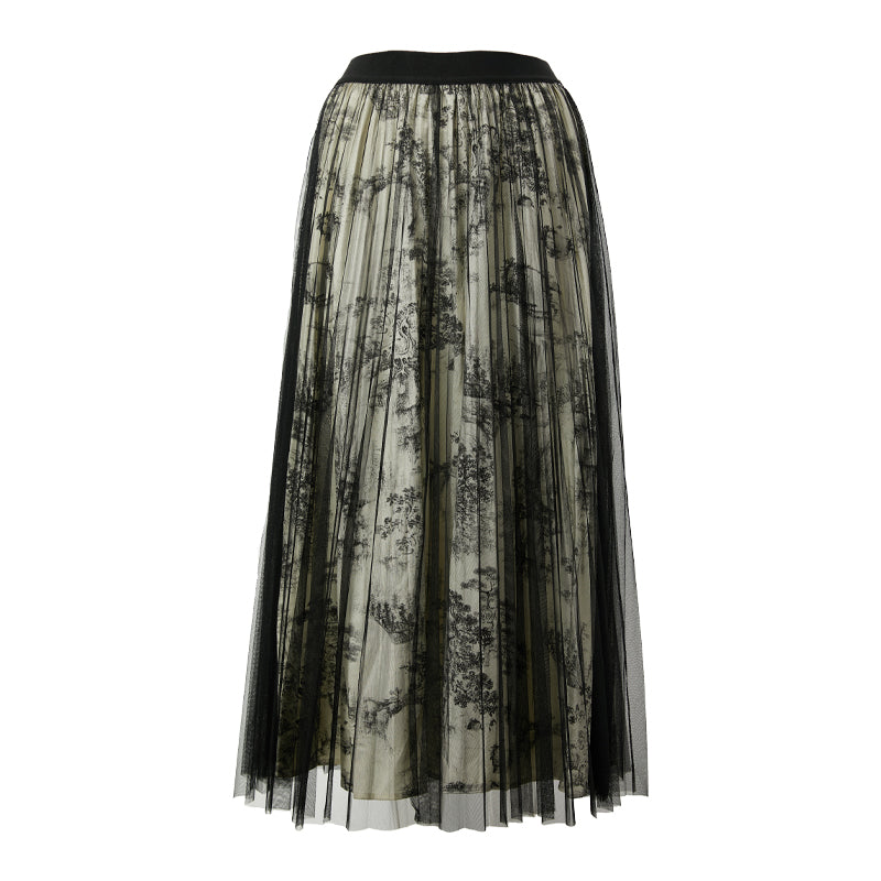 A two‑layer skirt with an ink landscape print lining and a sheer mesh overlay. Light, graceful, and flowy, it creates an elegant, feminine look.