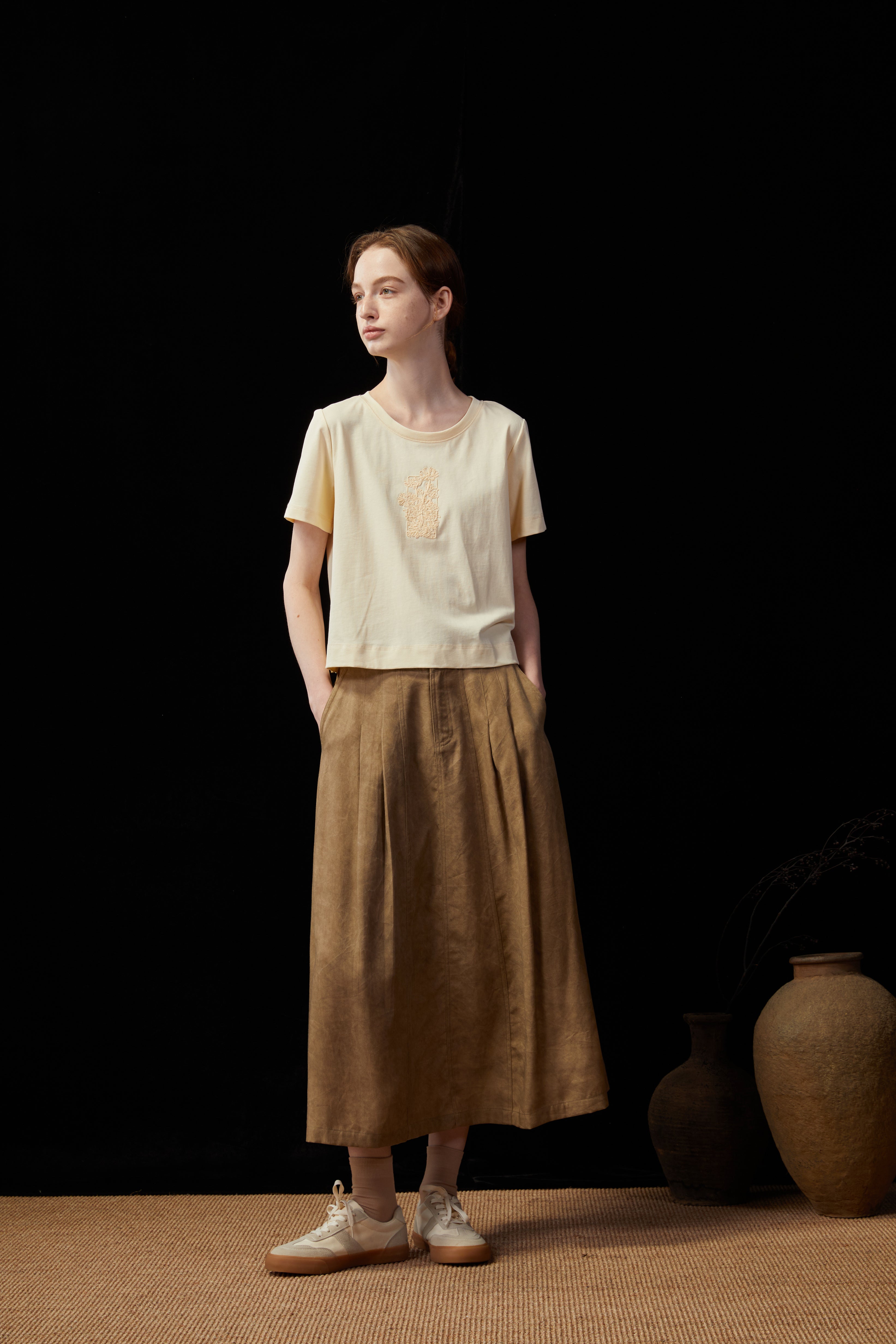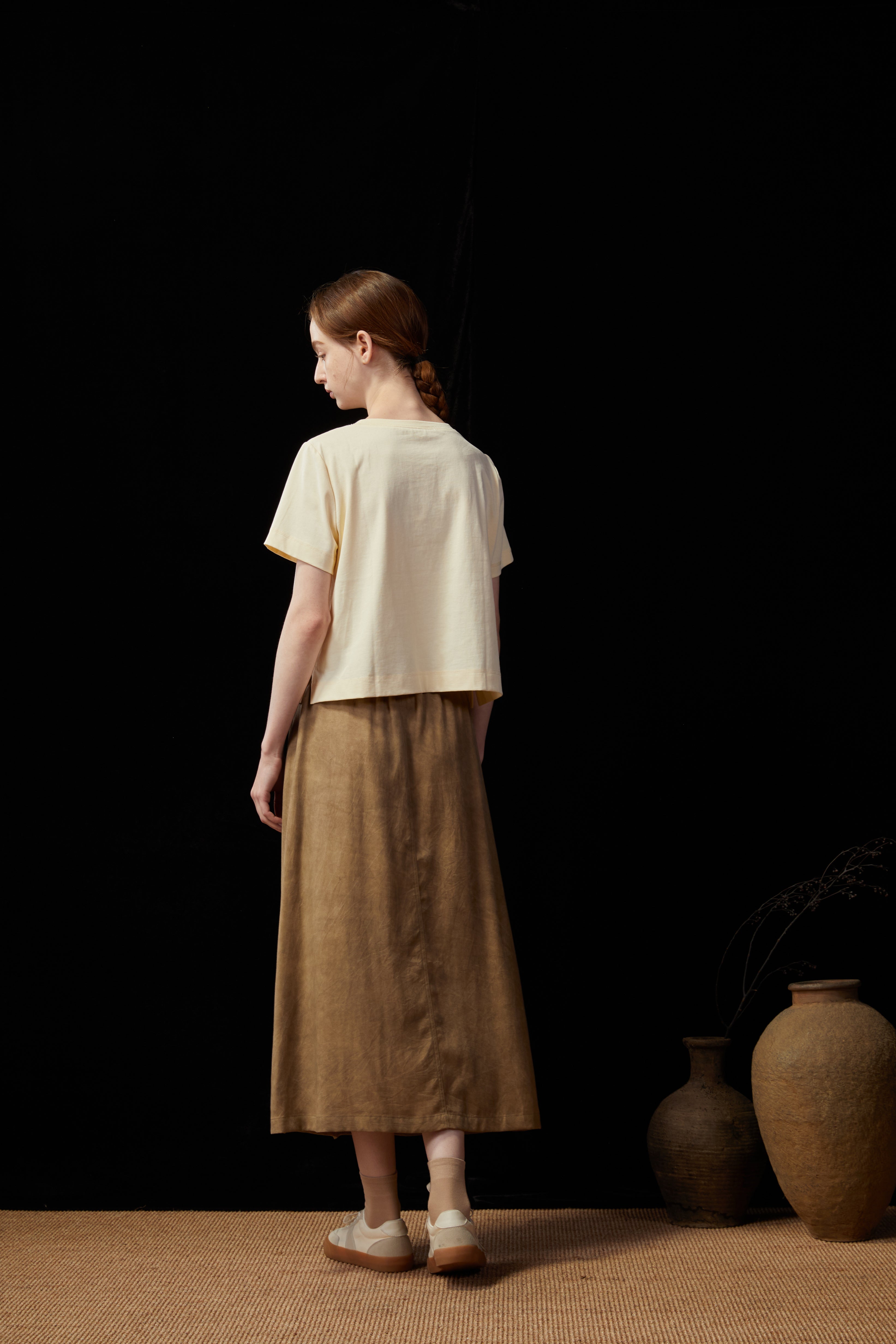 Inspired by the gentle flow of nature, this A-line midi skirt is crafted from 100% Lyocell for a cool, breathable feel. The washed finish adds soft texture, while the relaxed shape and V-shaped waistband create a flattering, easy silhouette.