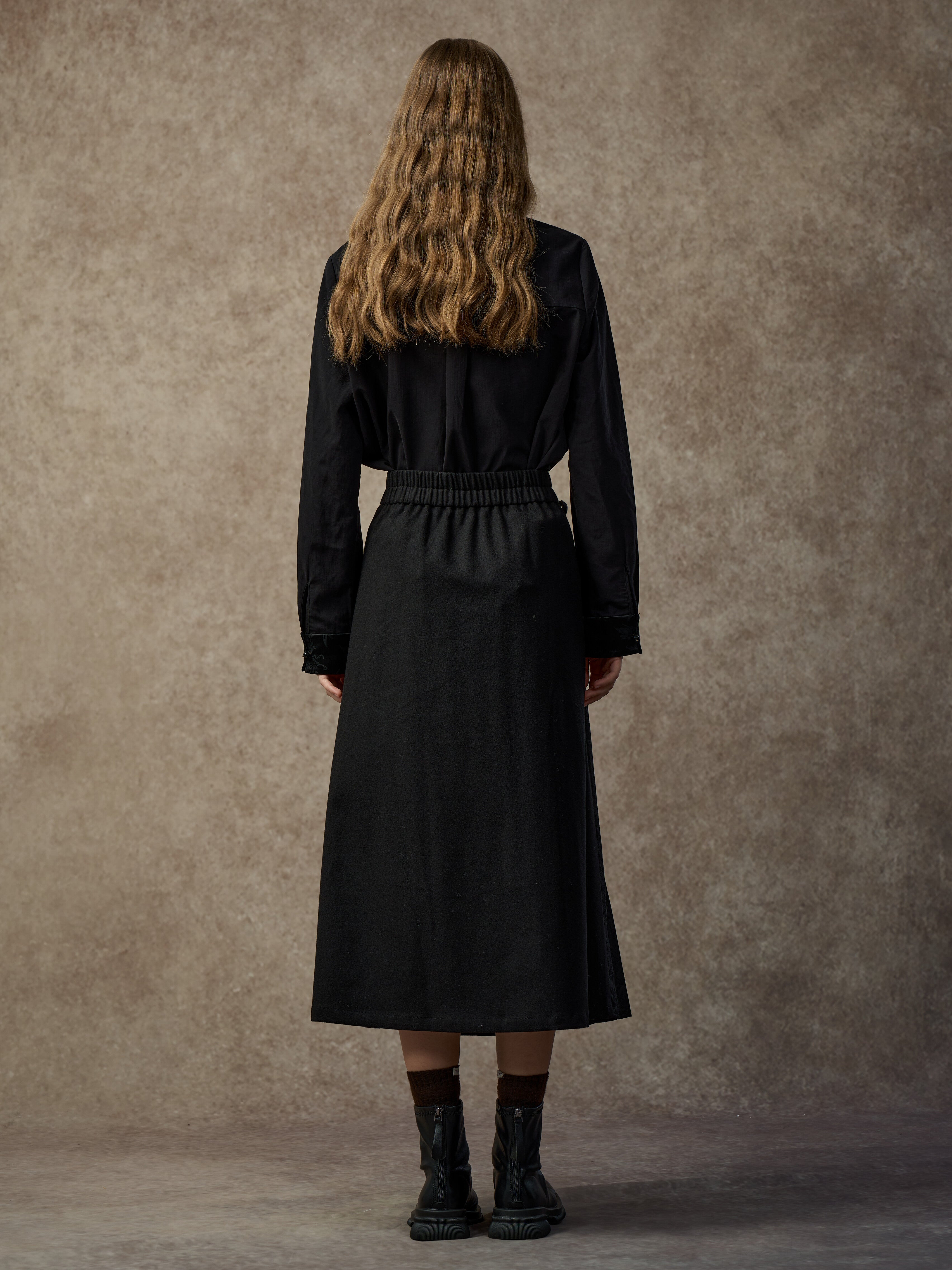 A chic H‑line skirt with a pleated jacquard front and tie accent. Features a slight A‑line shape and elastic back waist for comfort and a flattering fit. Contrasting fabrics add a modern, refined touch.