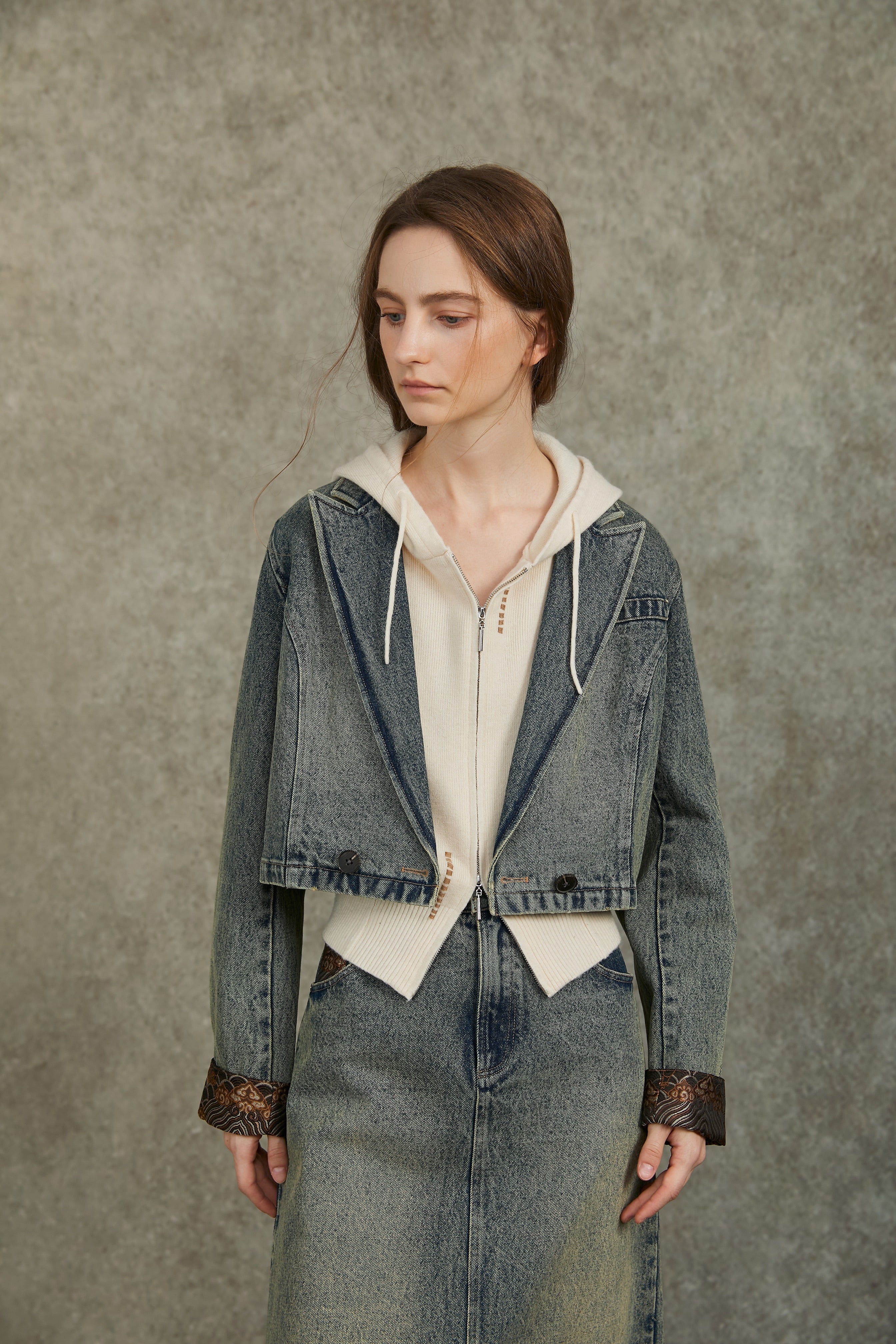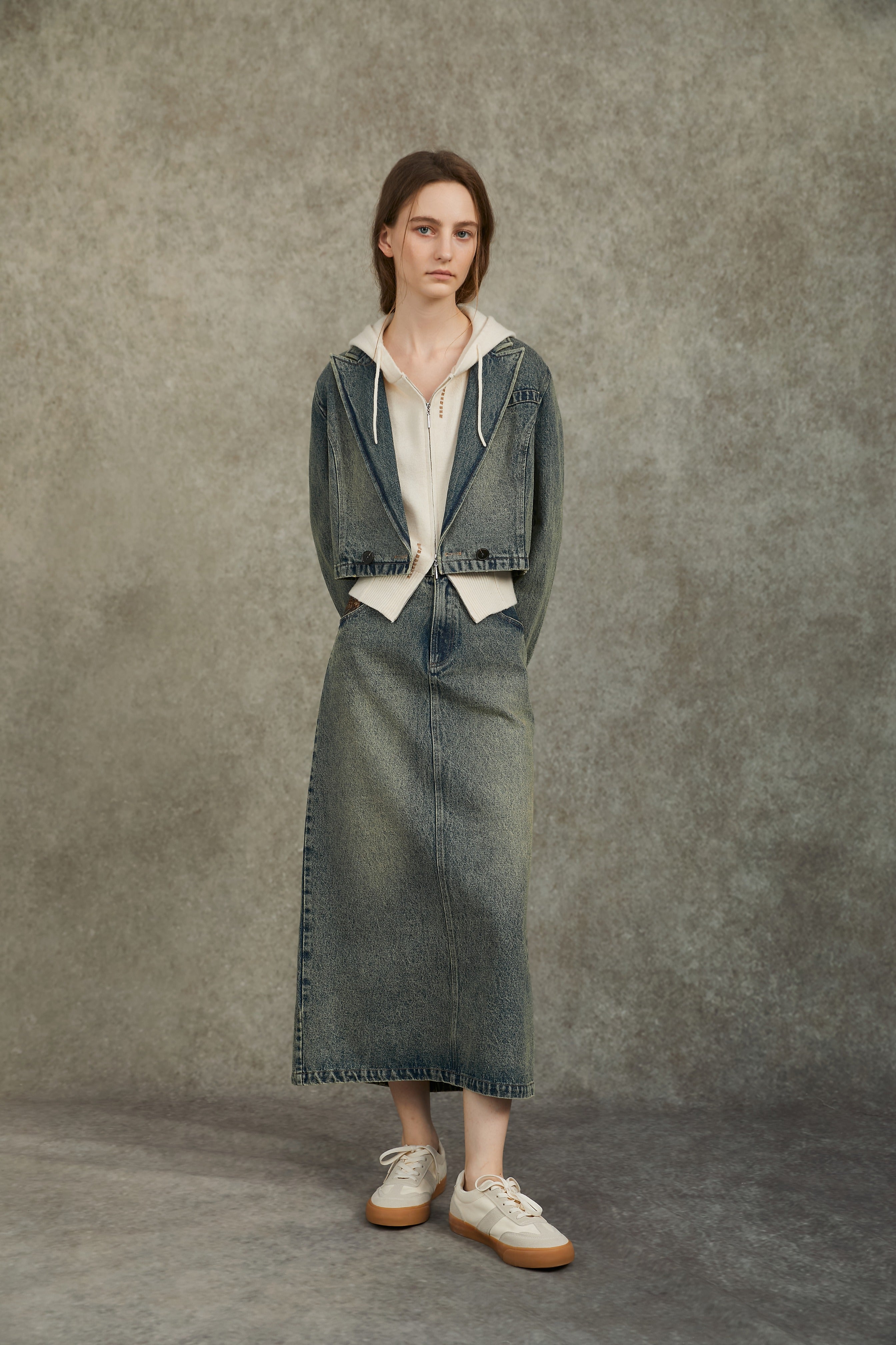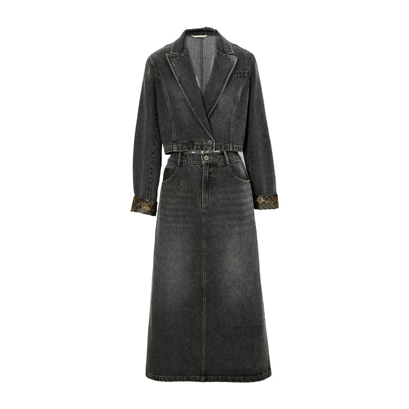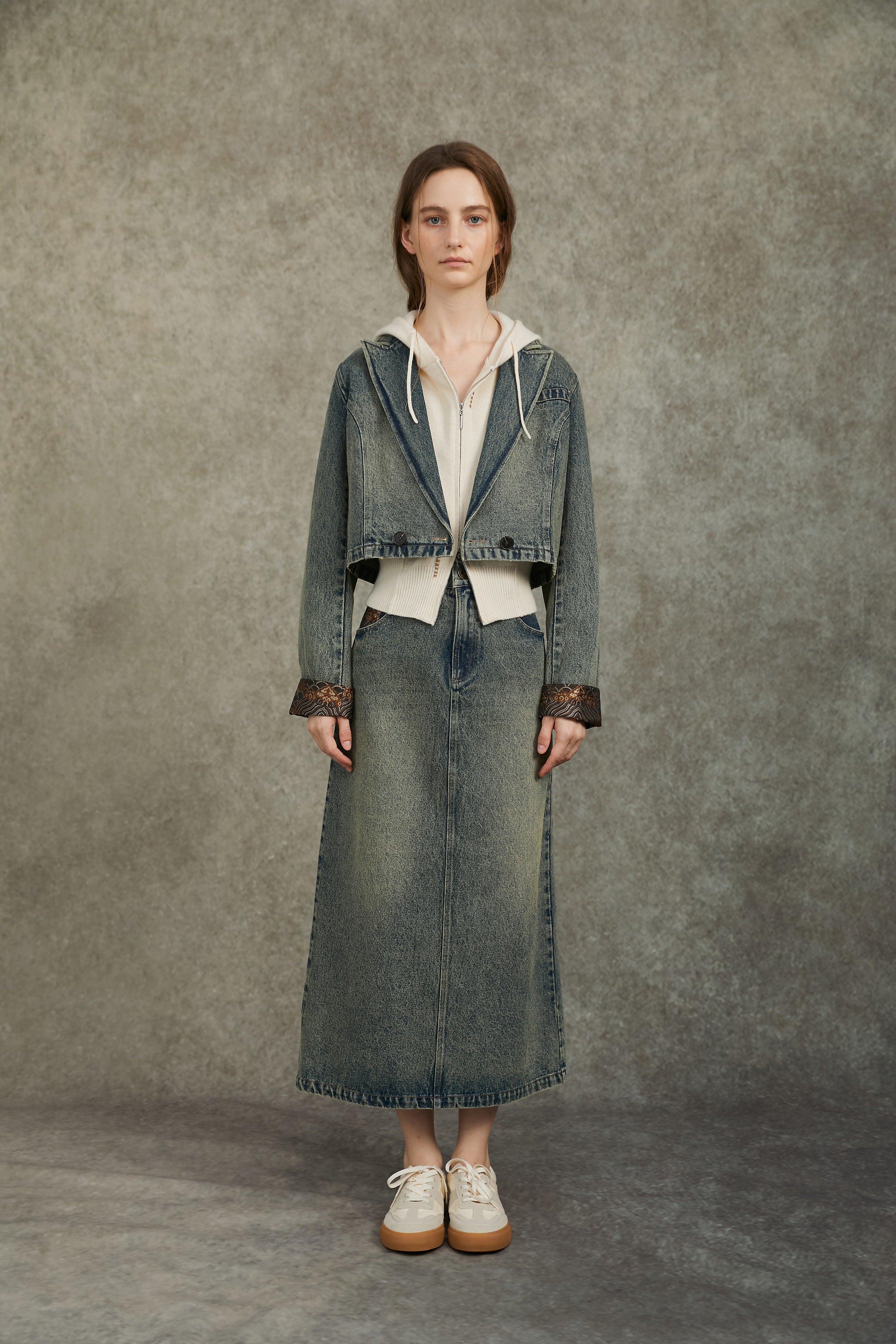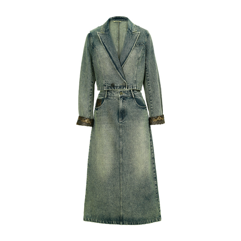 A vintage‑inspired denim set with a tailored blazer and matching skirt. The washed finish adds depth and jacquard details give a modern edge, while the back slit offers comfort and movement. Versatile for both casual and dressy looks.