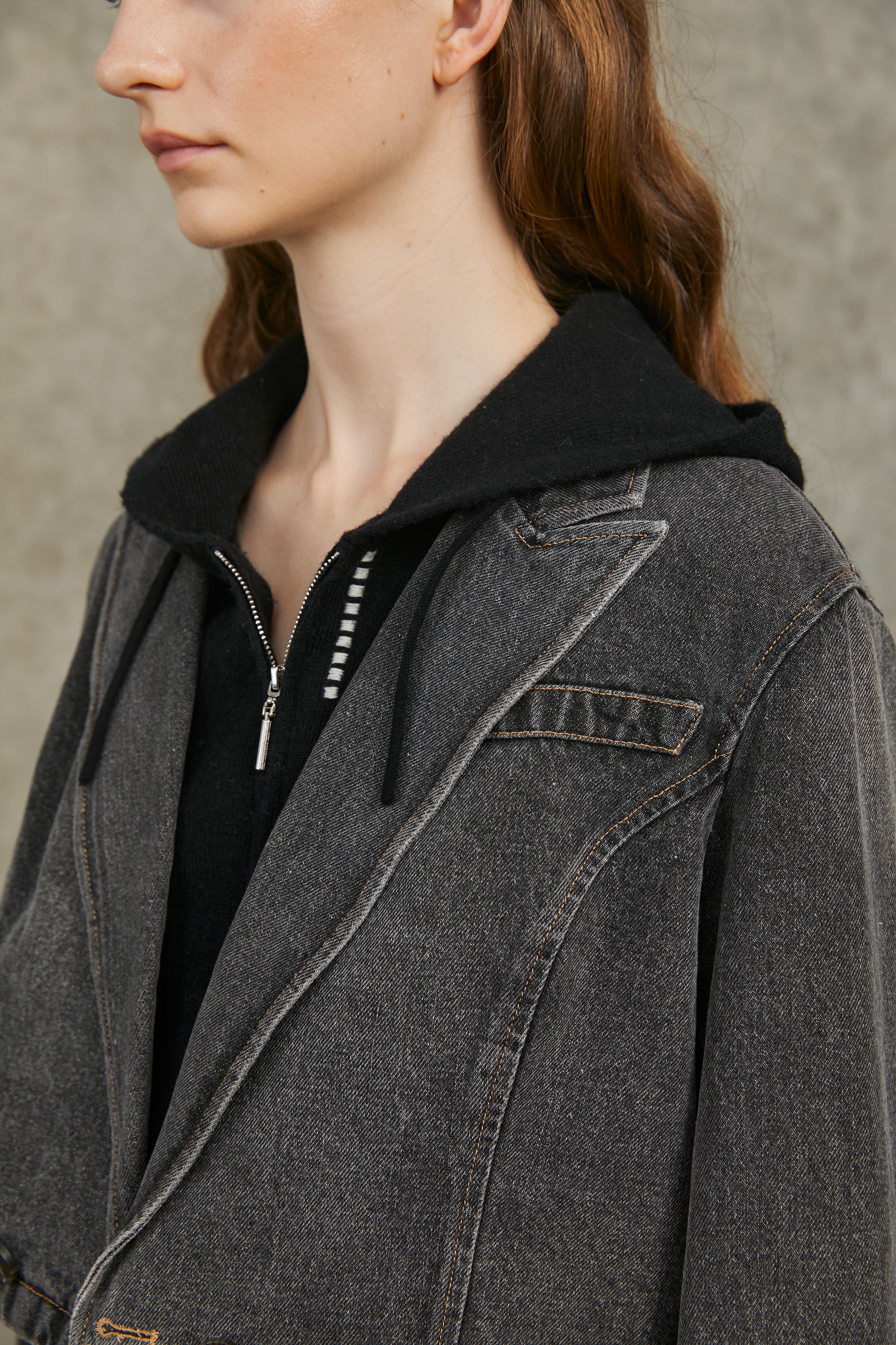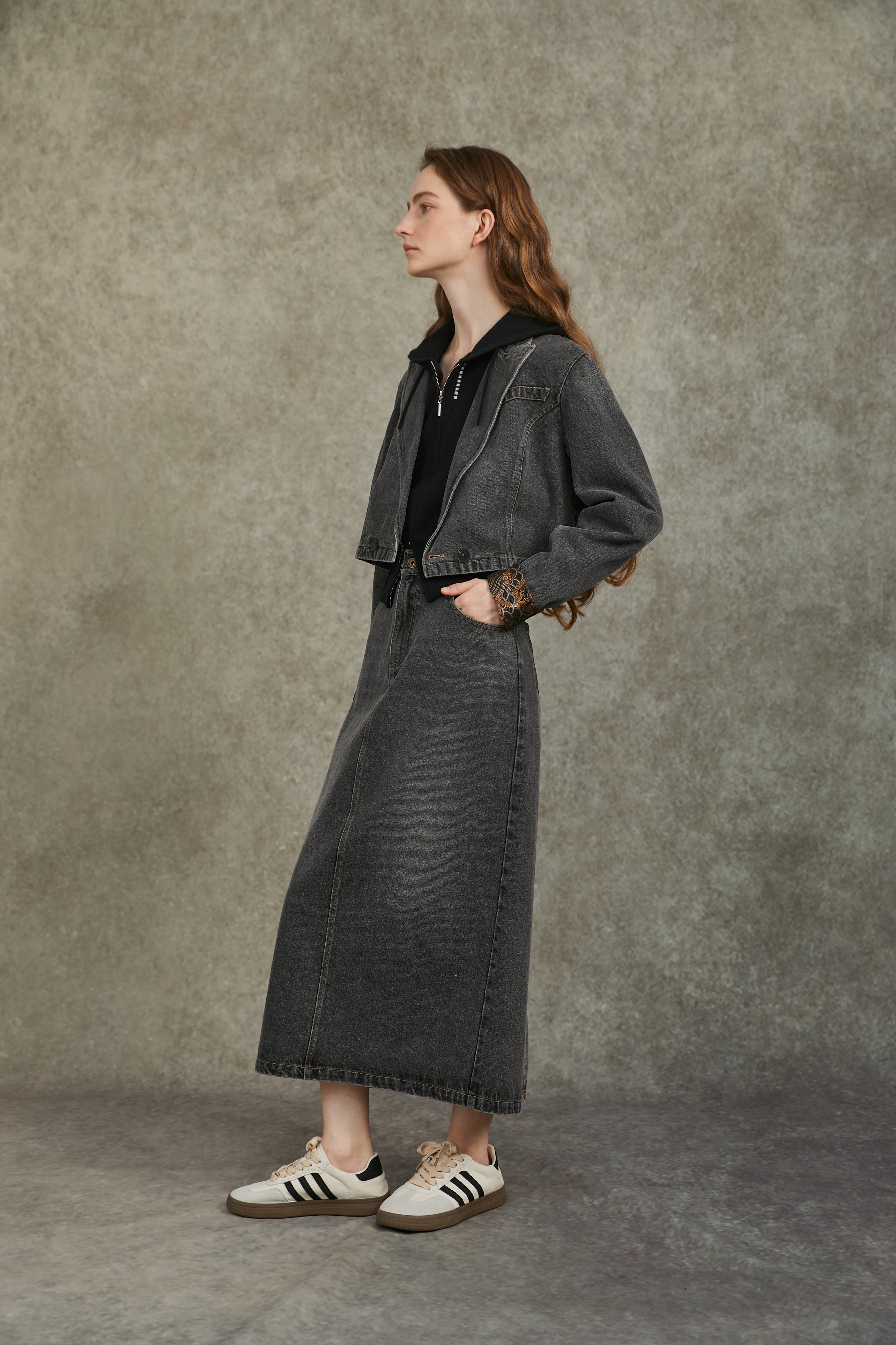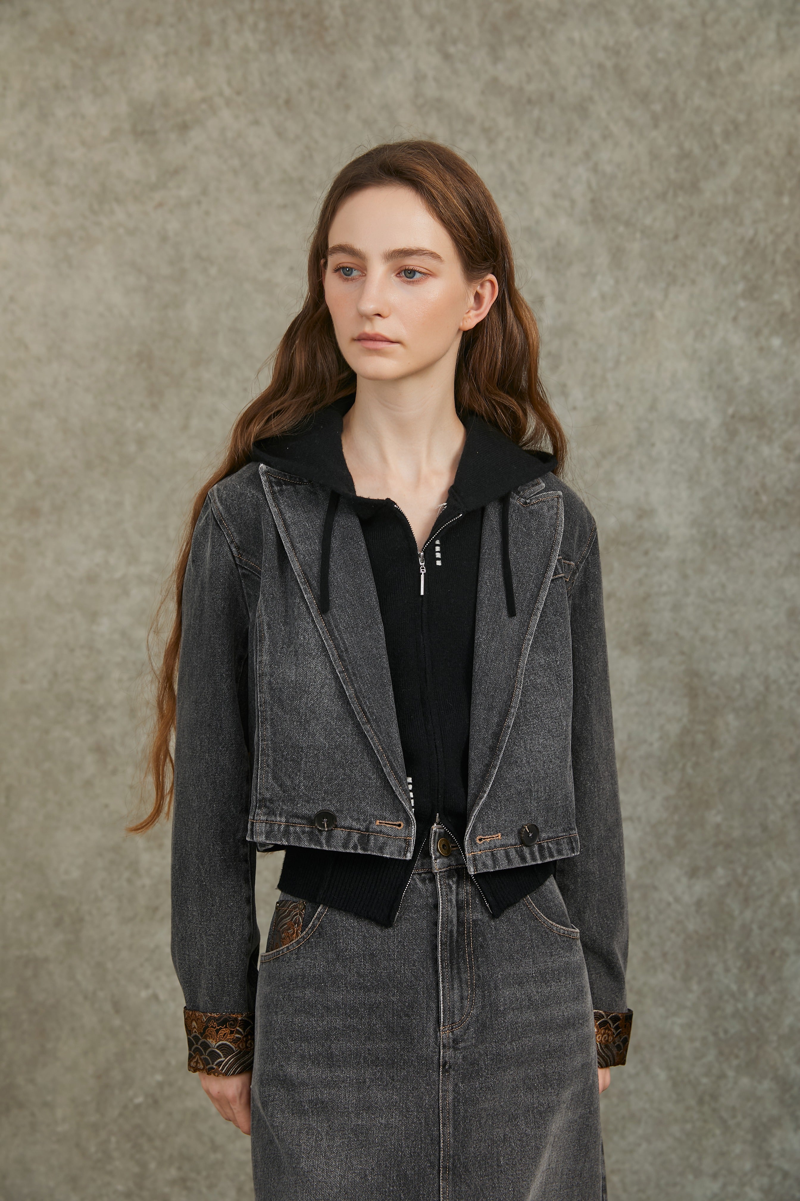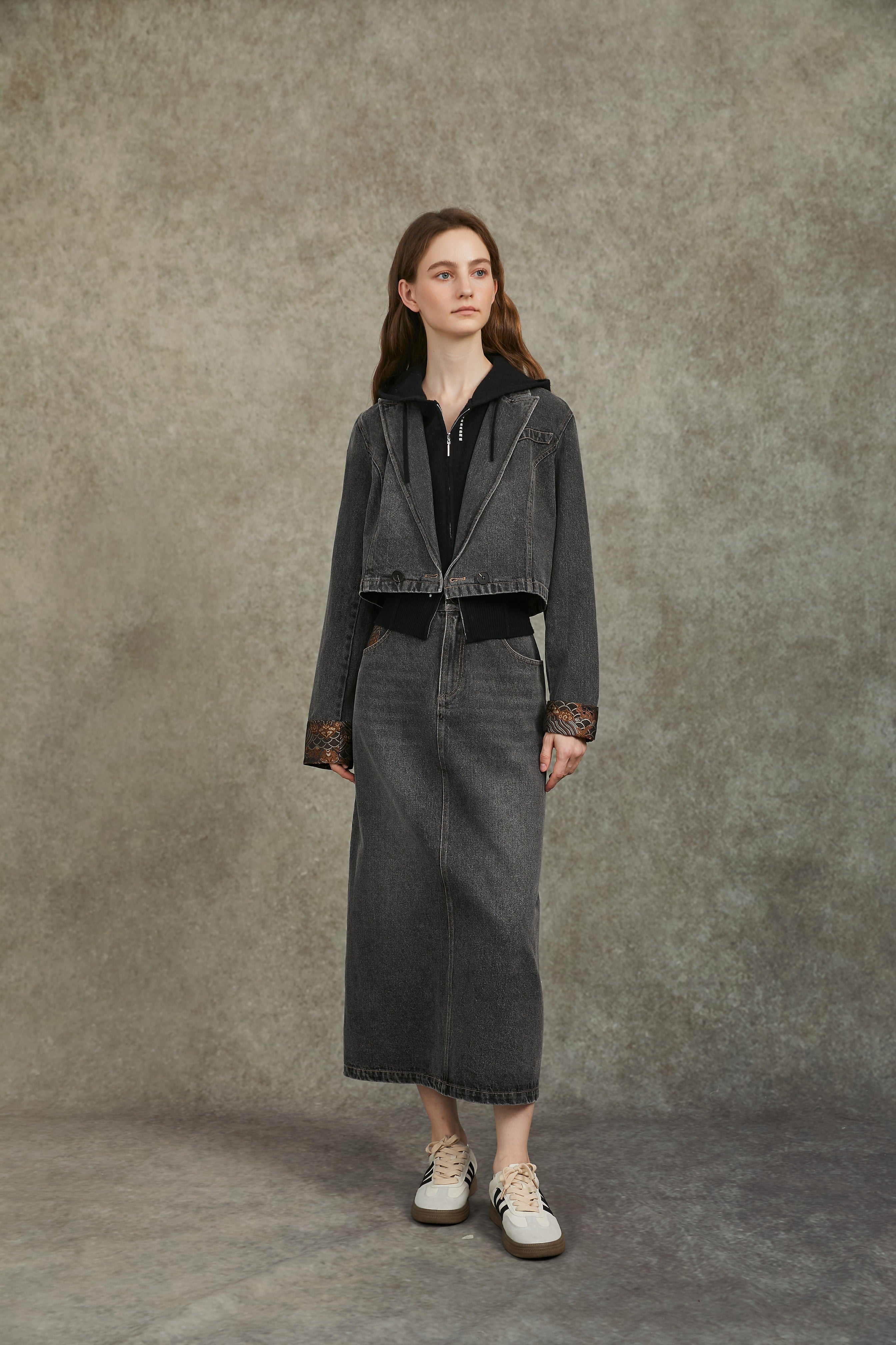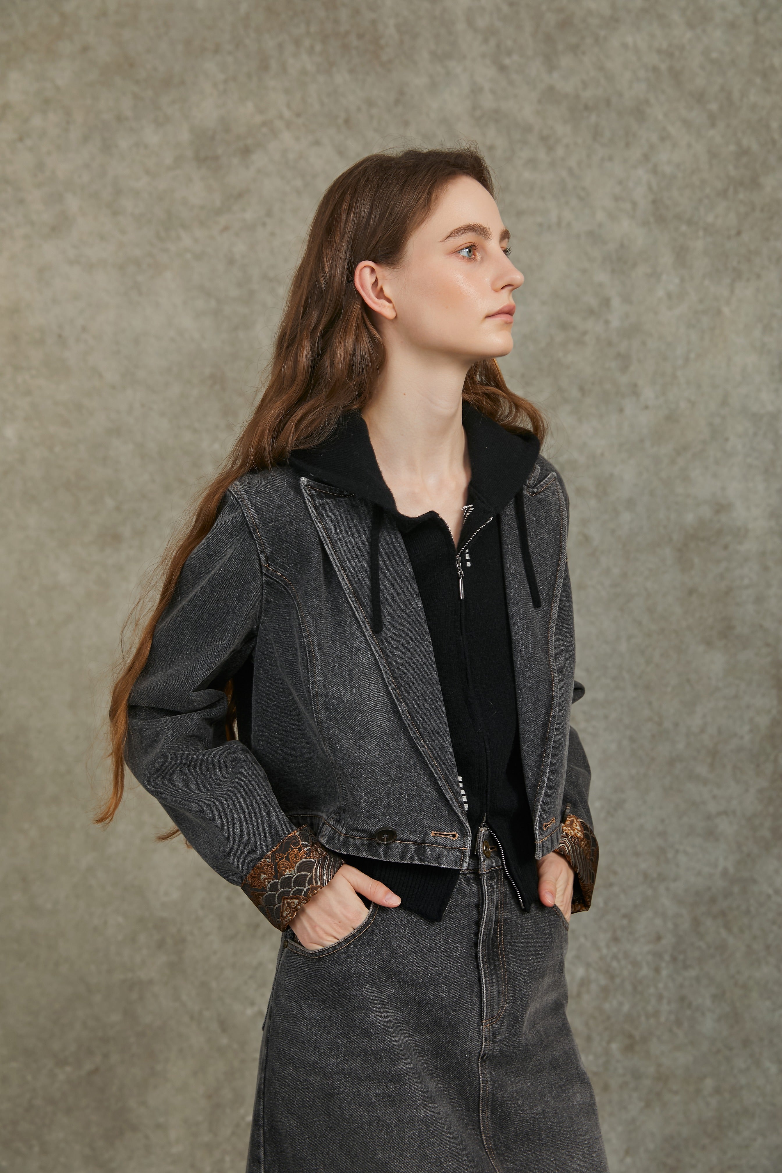 A vintage‑inspired denim set with a tailored blazer and matching skirt. The washed finish adds depth and jacquard details give a modern edge, while the back slit offers comfort and movement. Versatile for both casual and dressy looks.