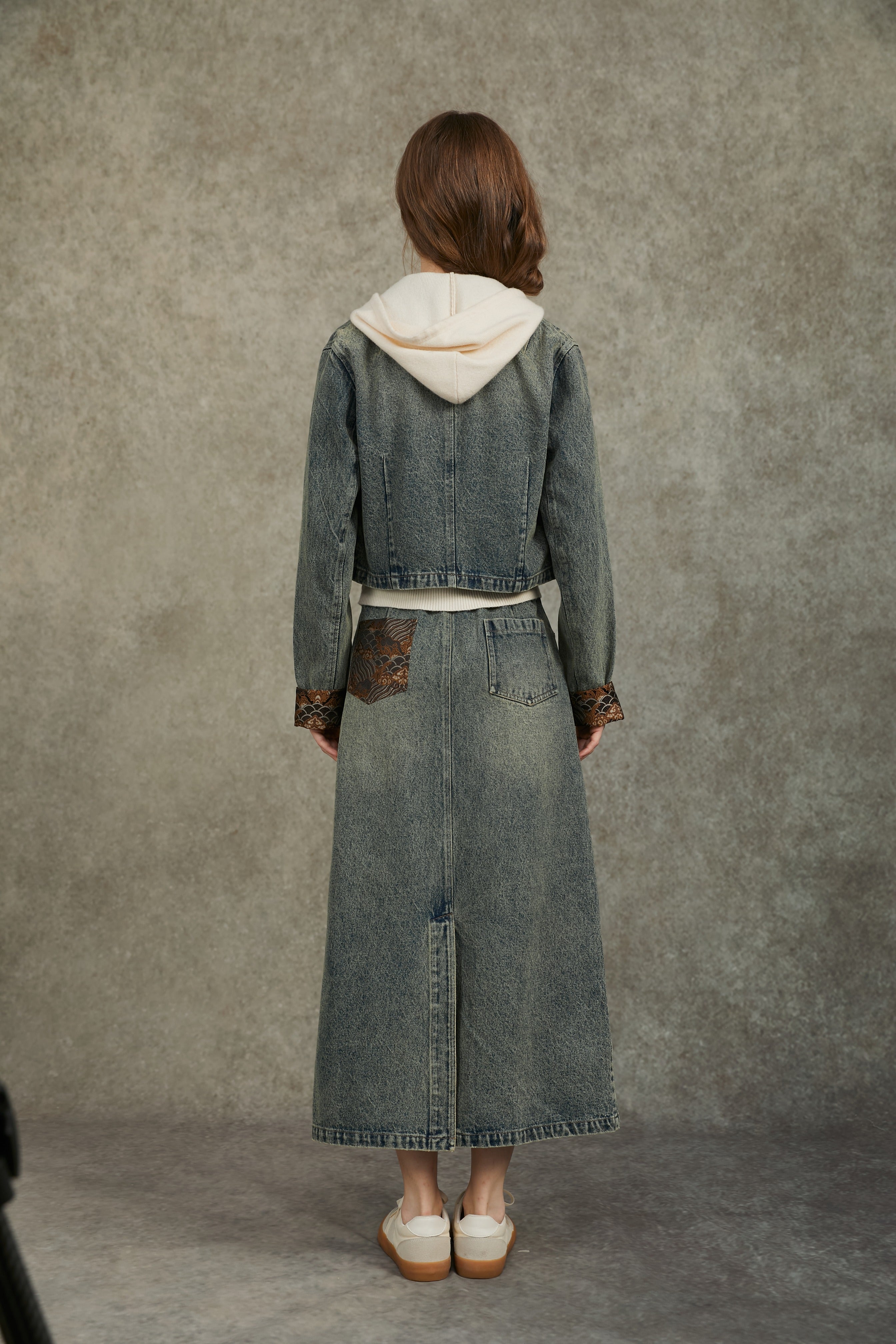 - Design: Washed denim, jacquard patchwork, skirt with back slit