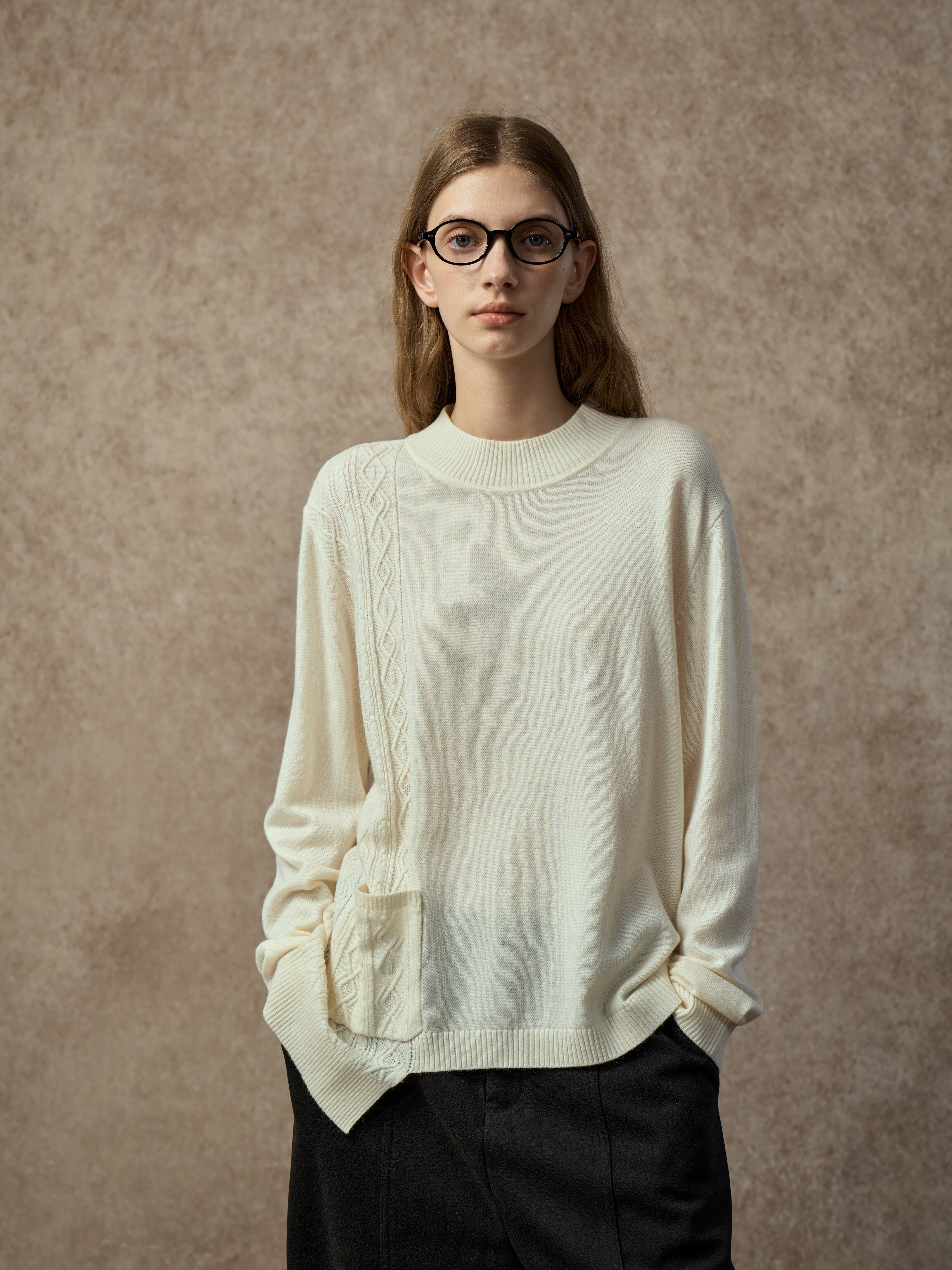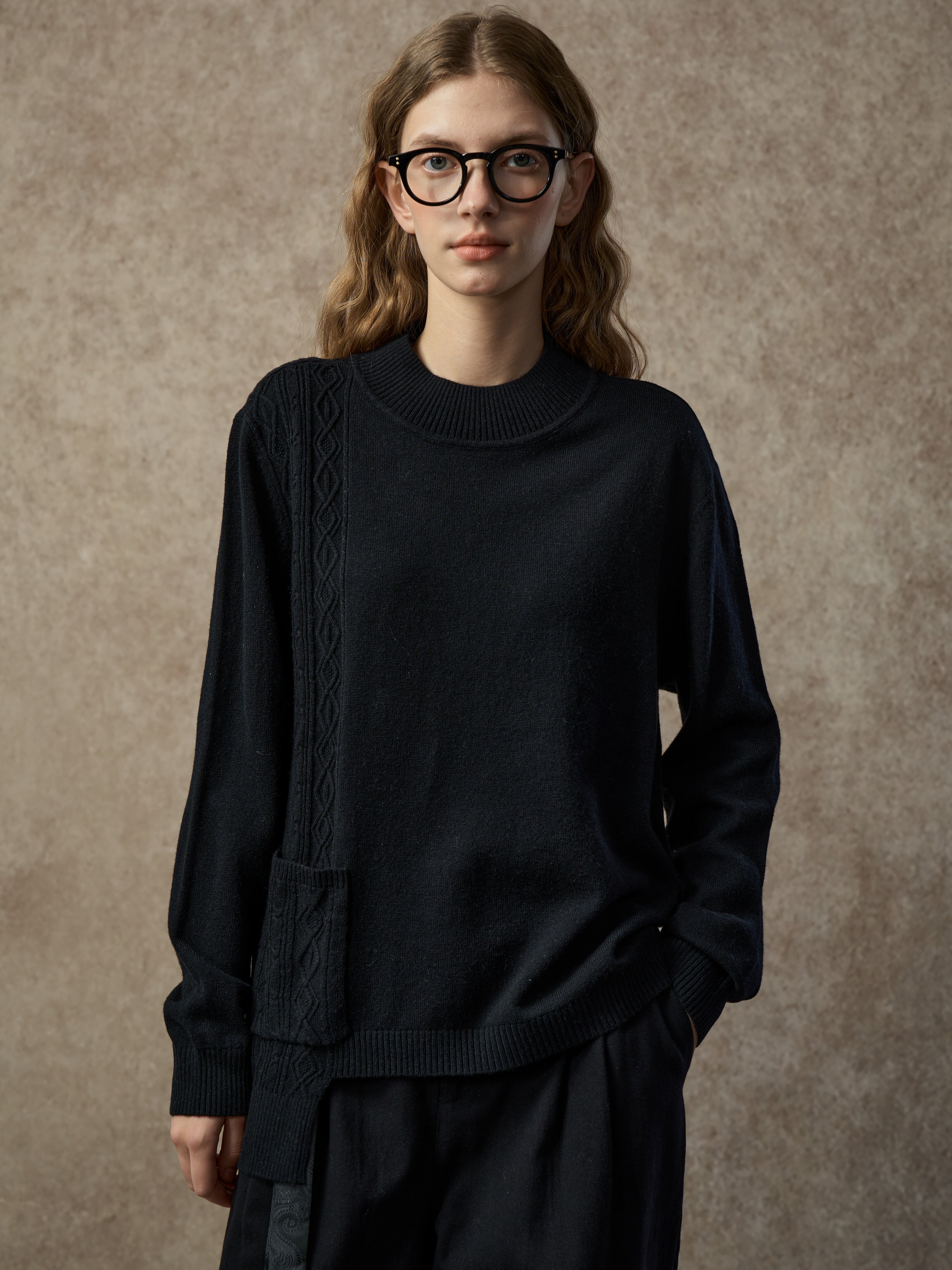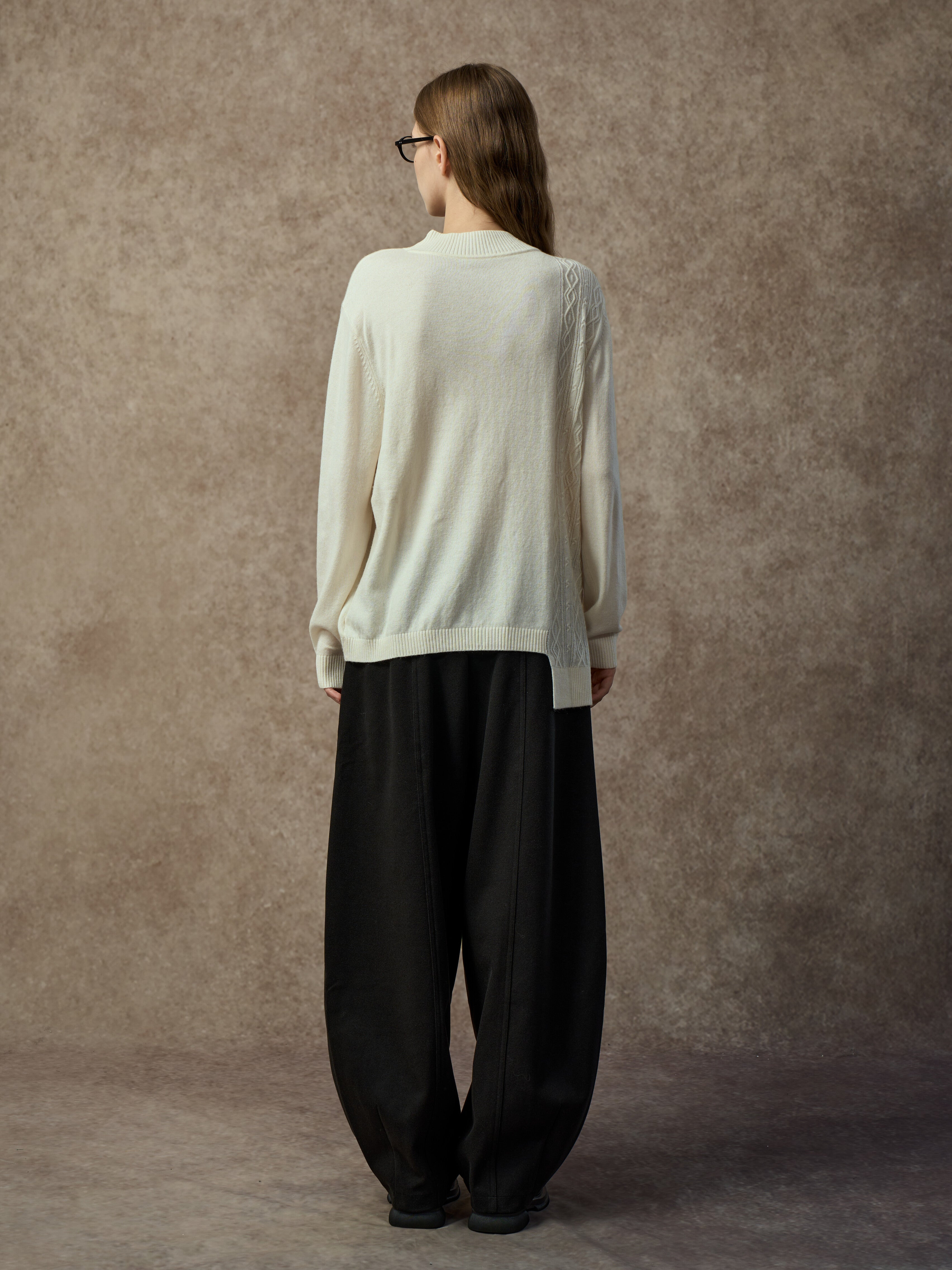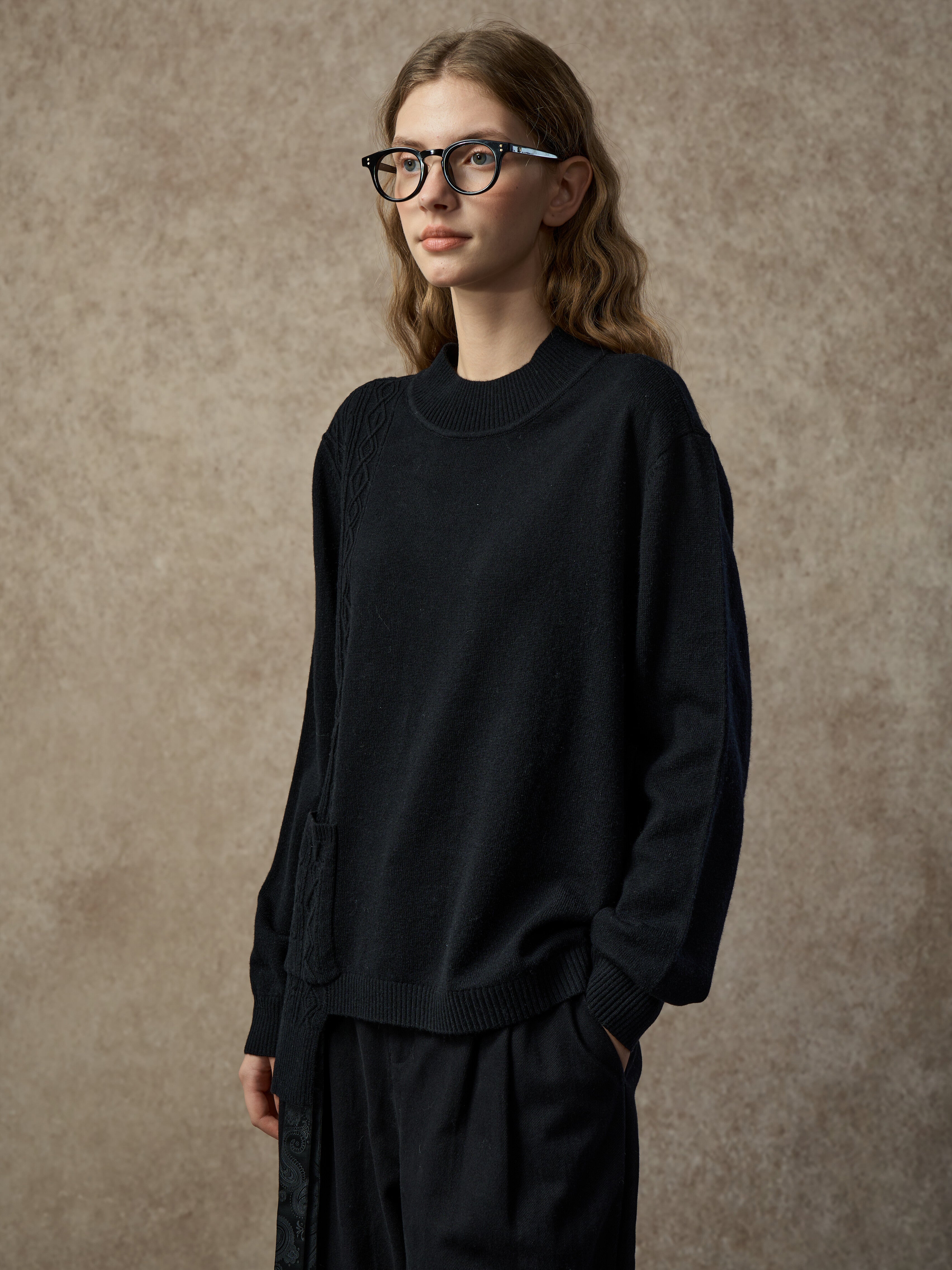 A soft wool-blend sweater with a mock neck and asymmetric hem. Cable and diamond knit patterns combine with single-side patchwork for added texture and dimension. Warm, comfortable, and easy to style for everyday wear.