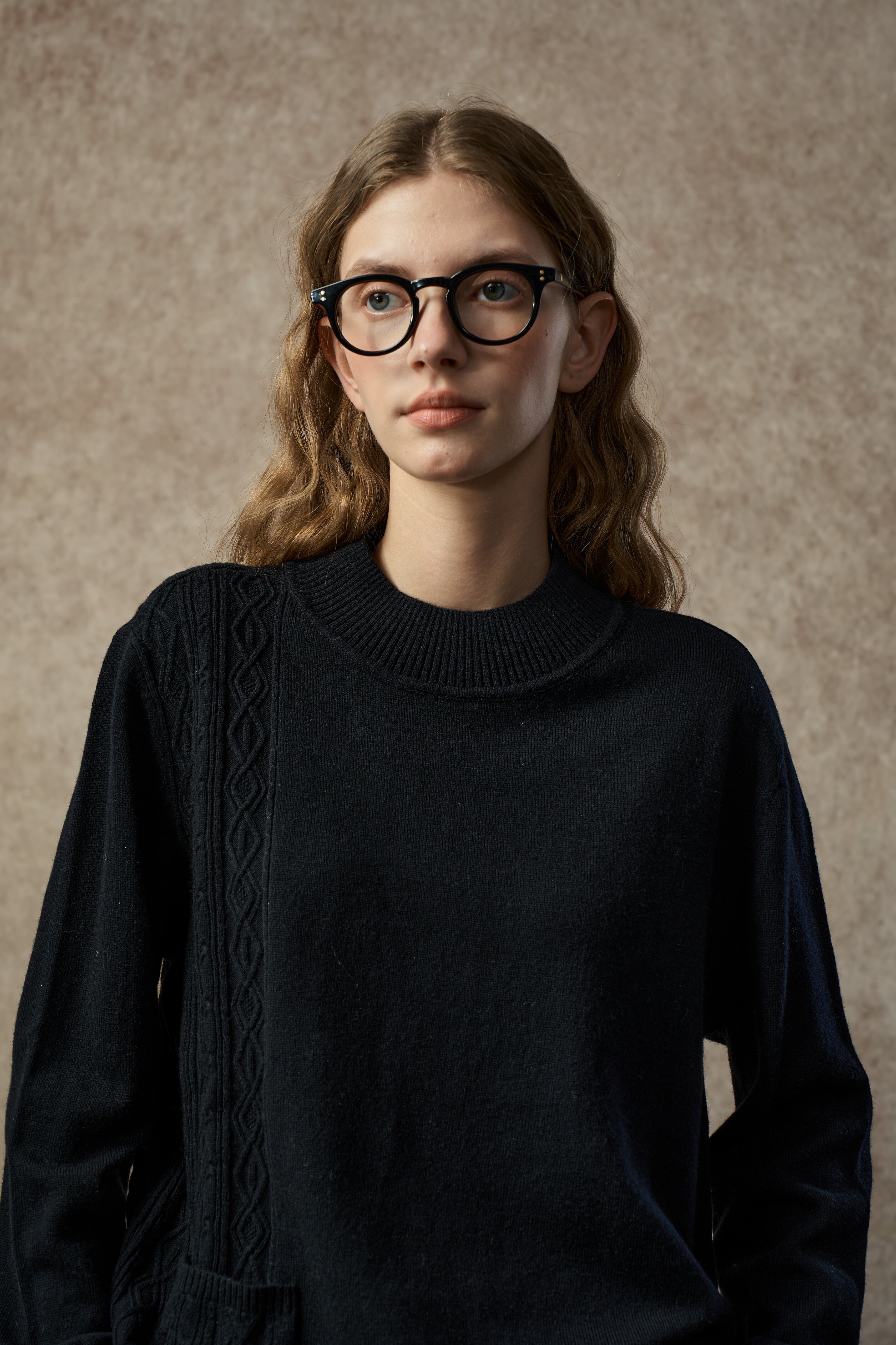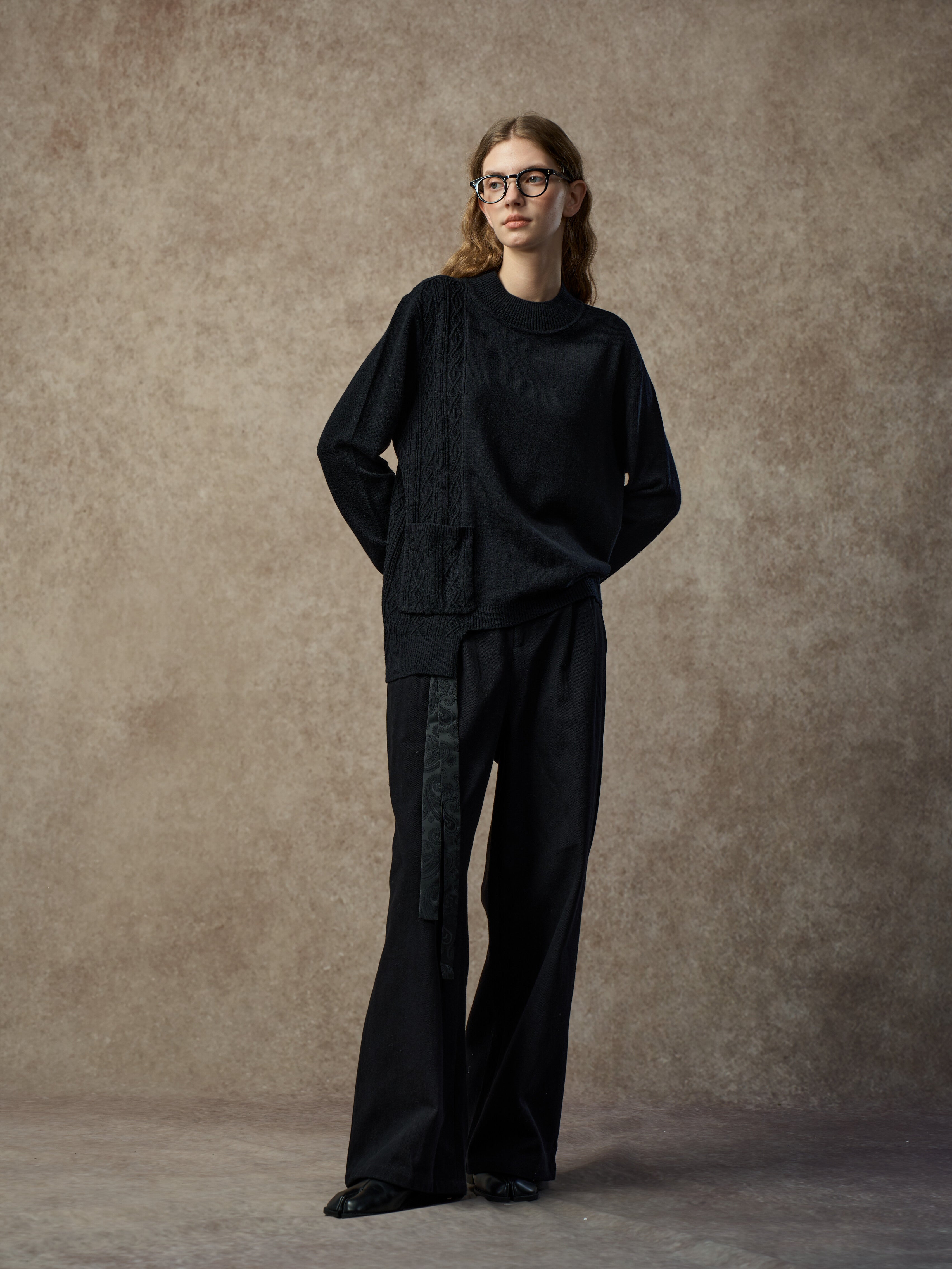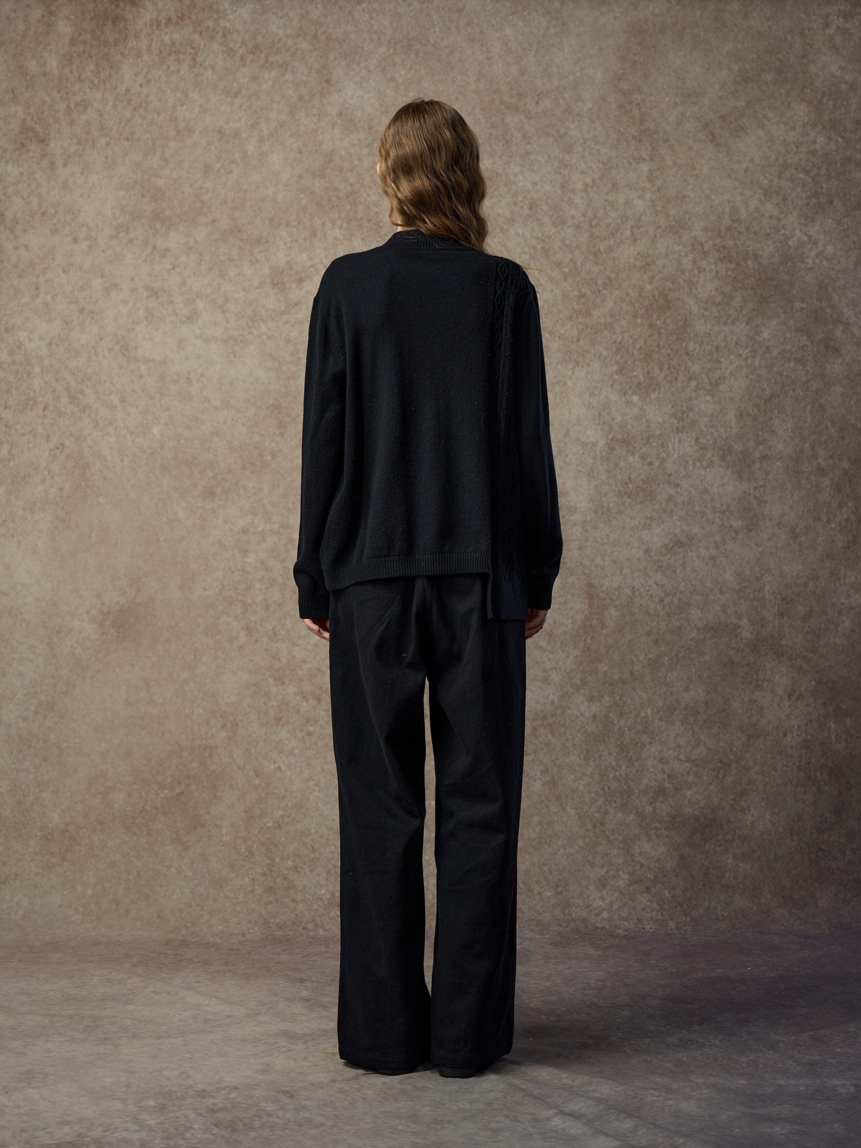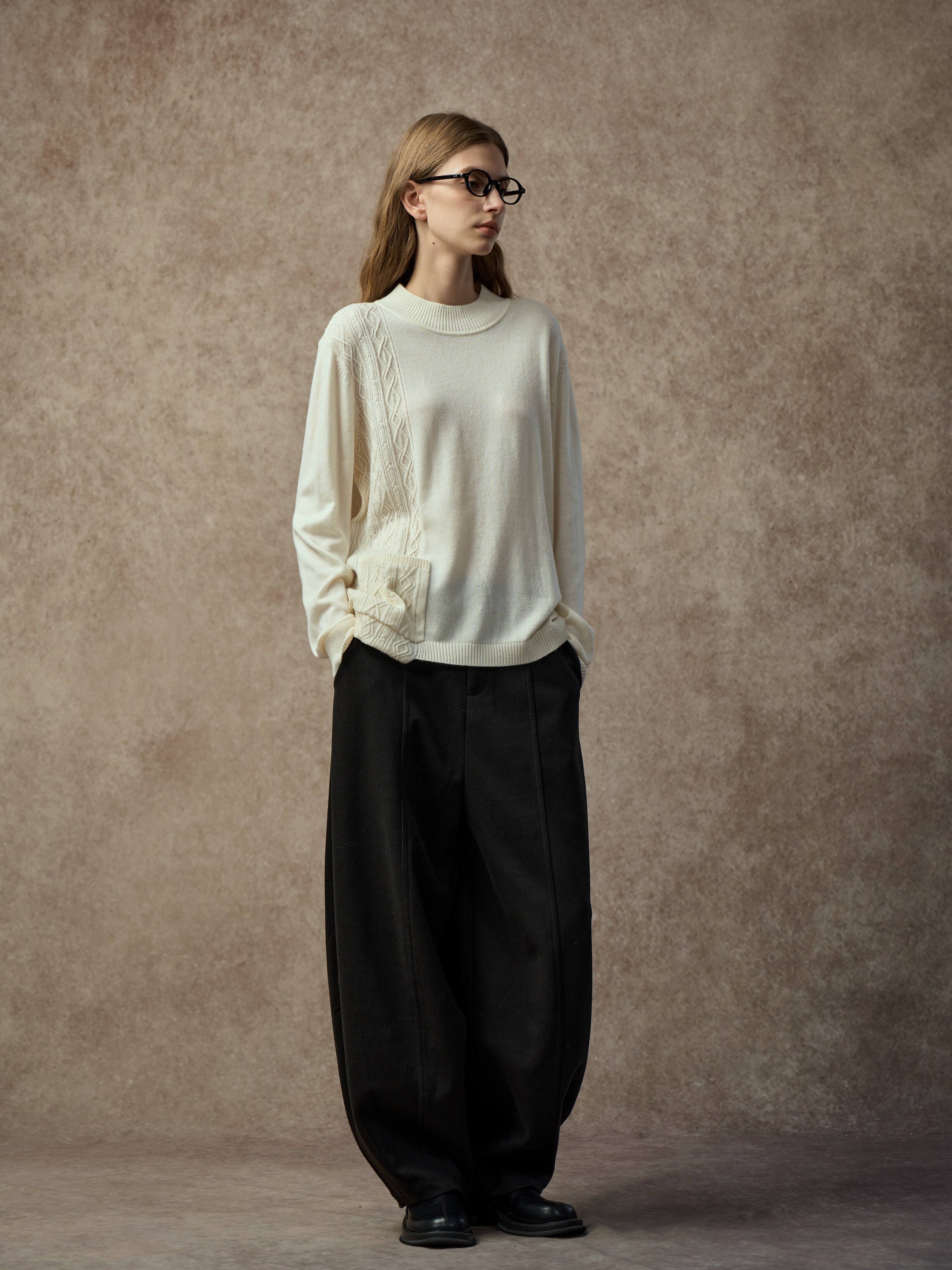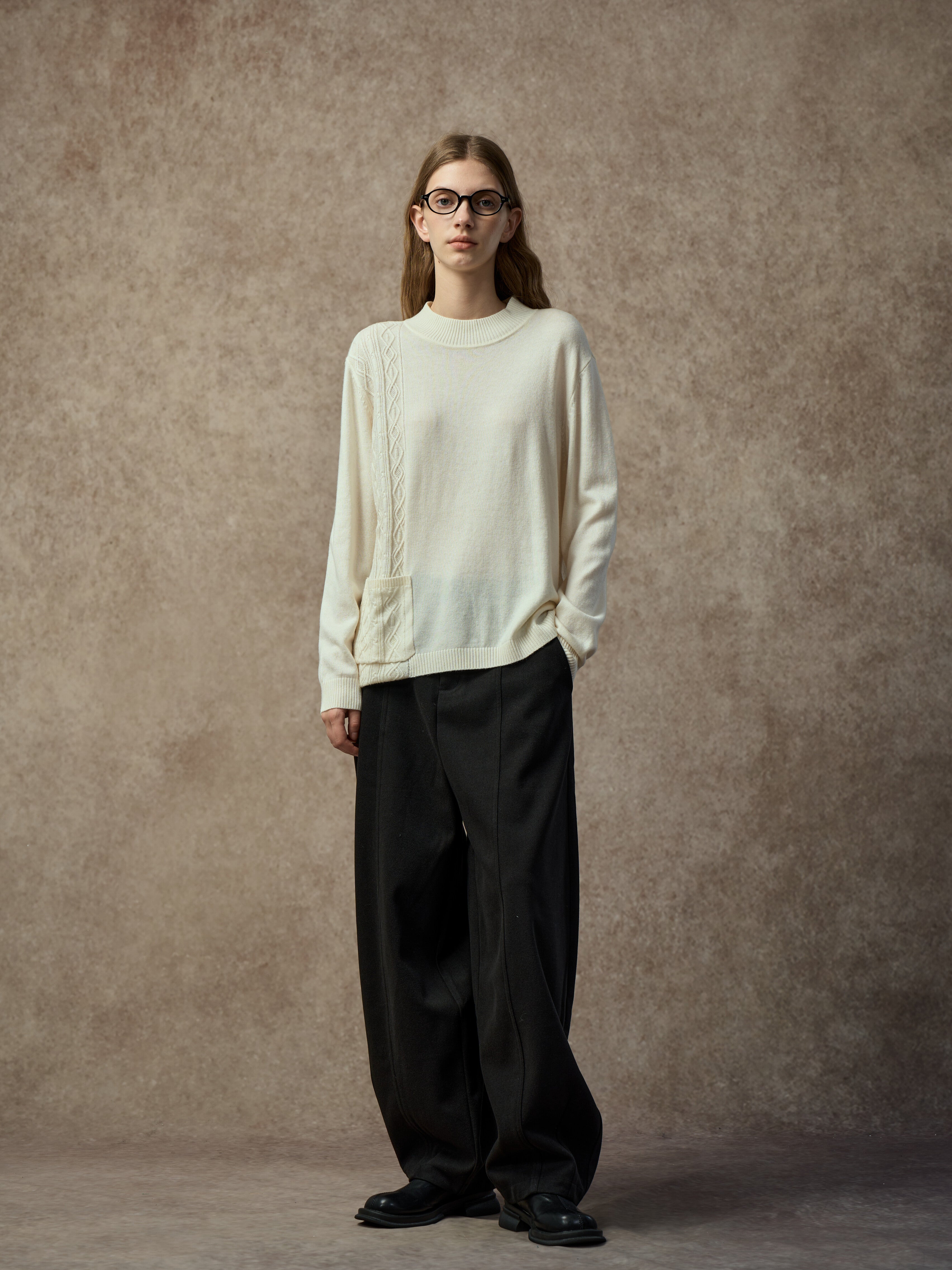 A soft wool-blend sweater with a mock neck and asymmetric hem. Cable and diamond knit patterns combine with single-side patchwork for added texture and dimension. Warm, comfortable, and easy to style for everyday wear.