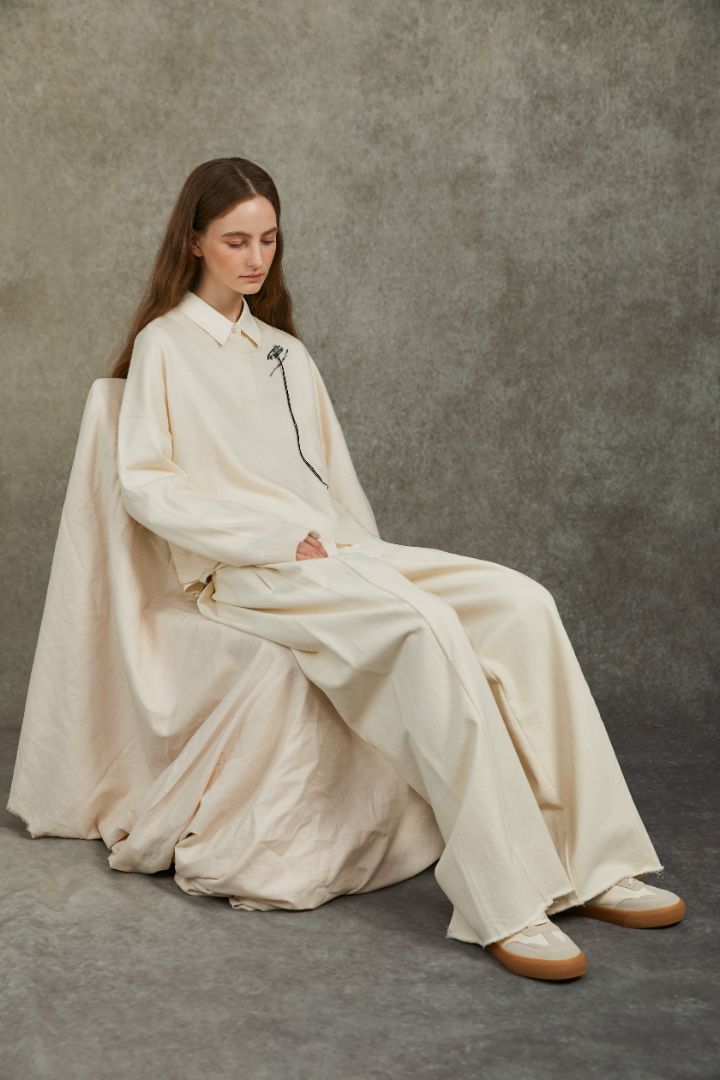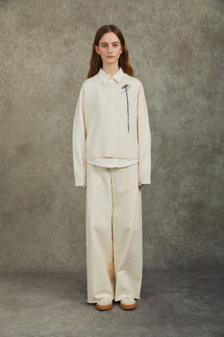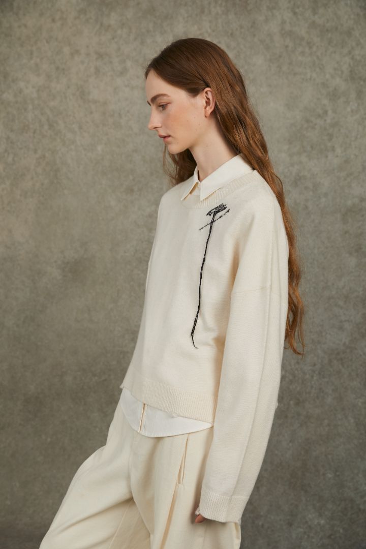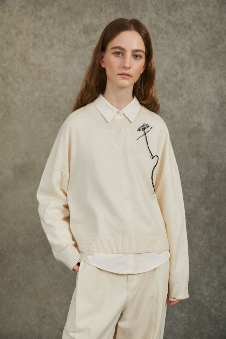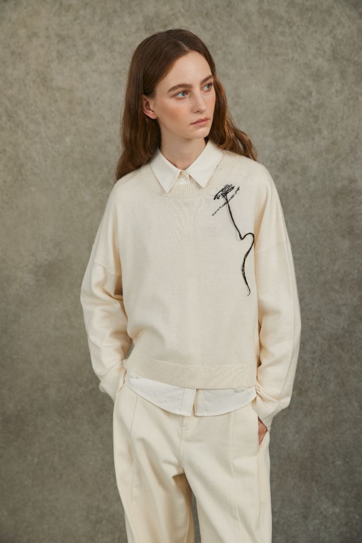Soft wool‑acrylic blend sweater with minimalist floral embroidery, ribbed hem, and cuffs. Relaxed fit combines comfort with casual chic.