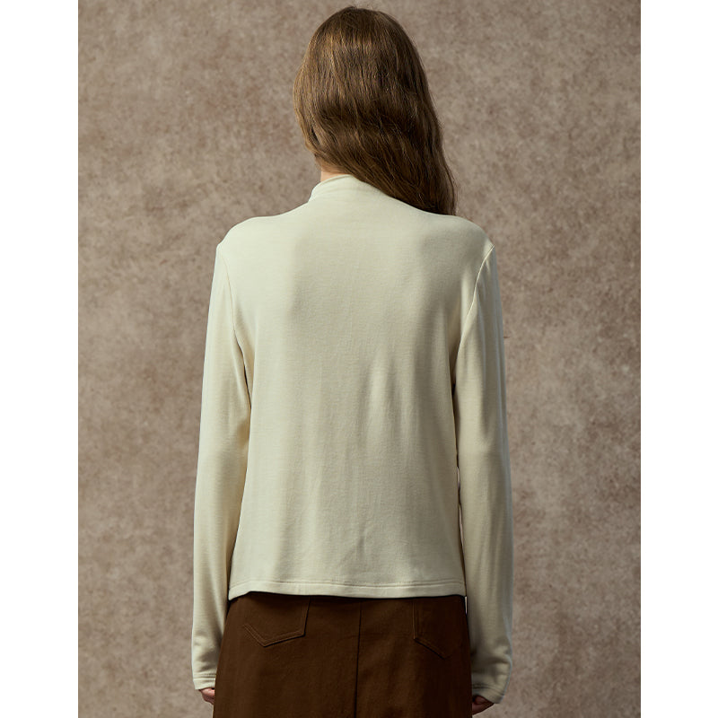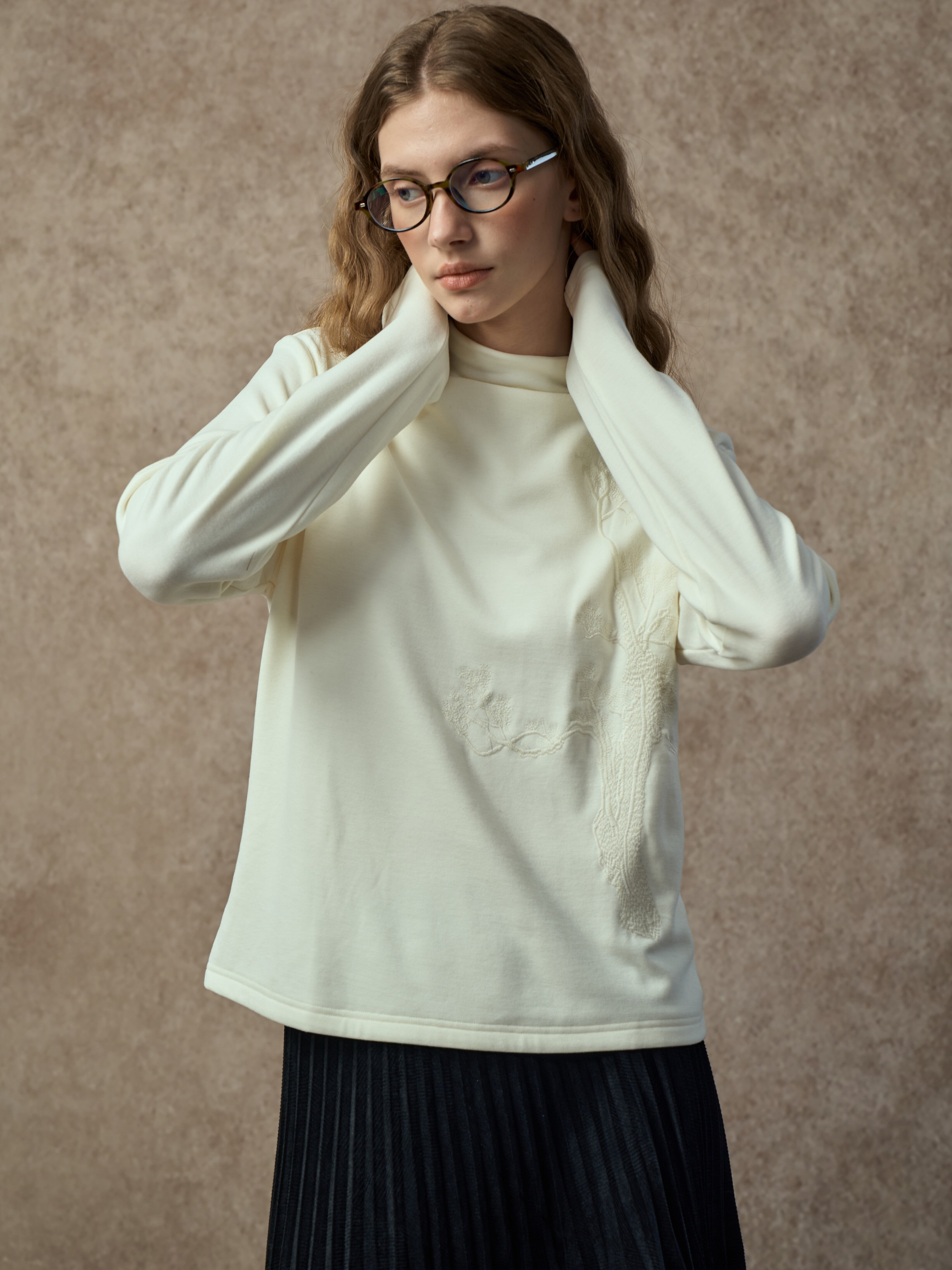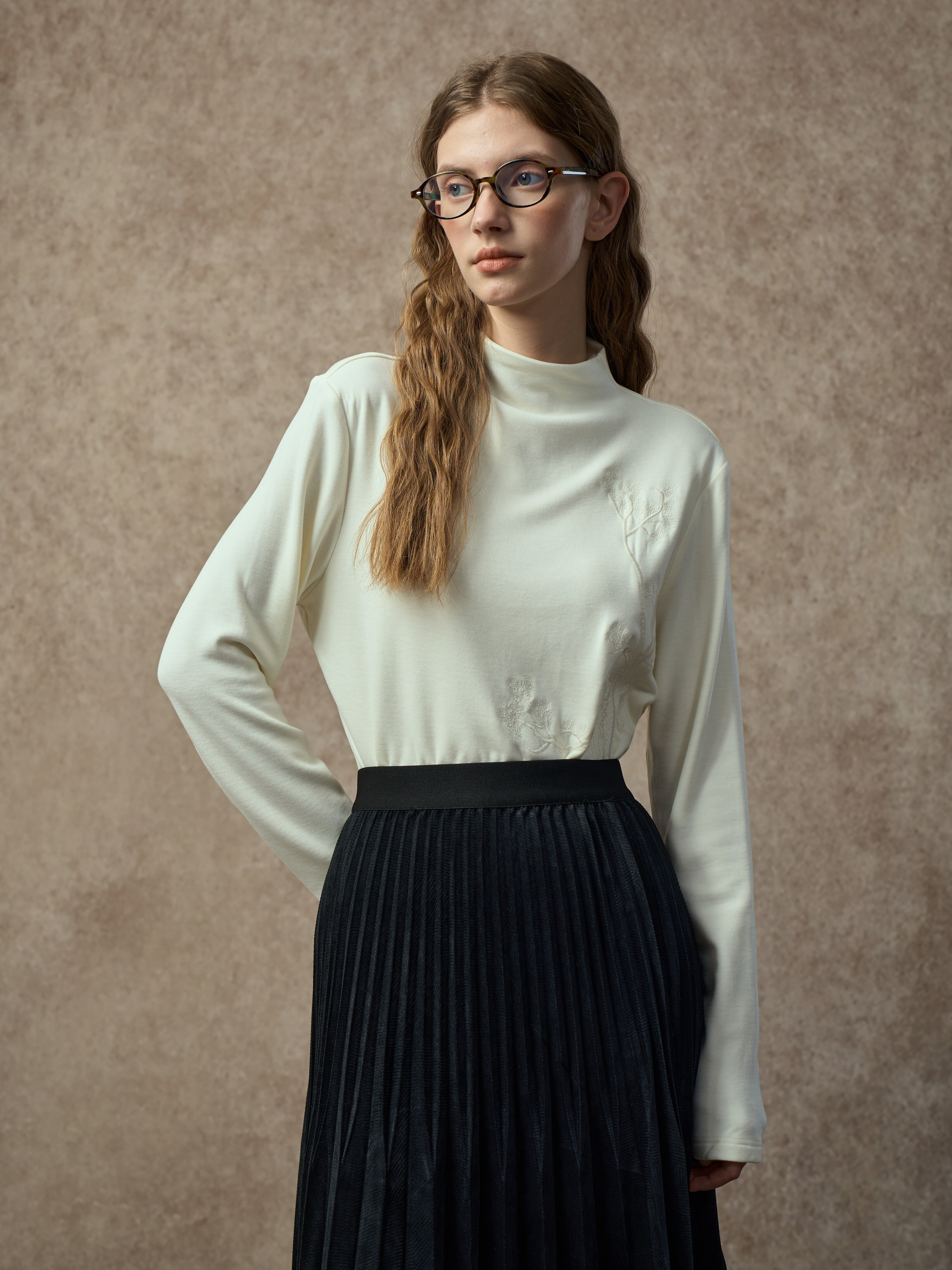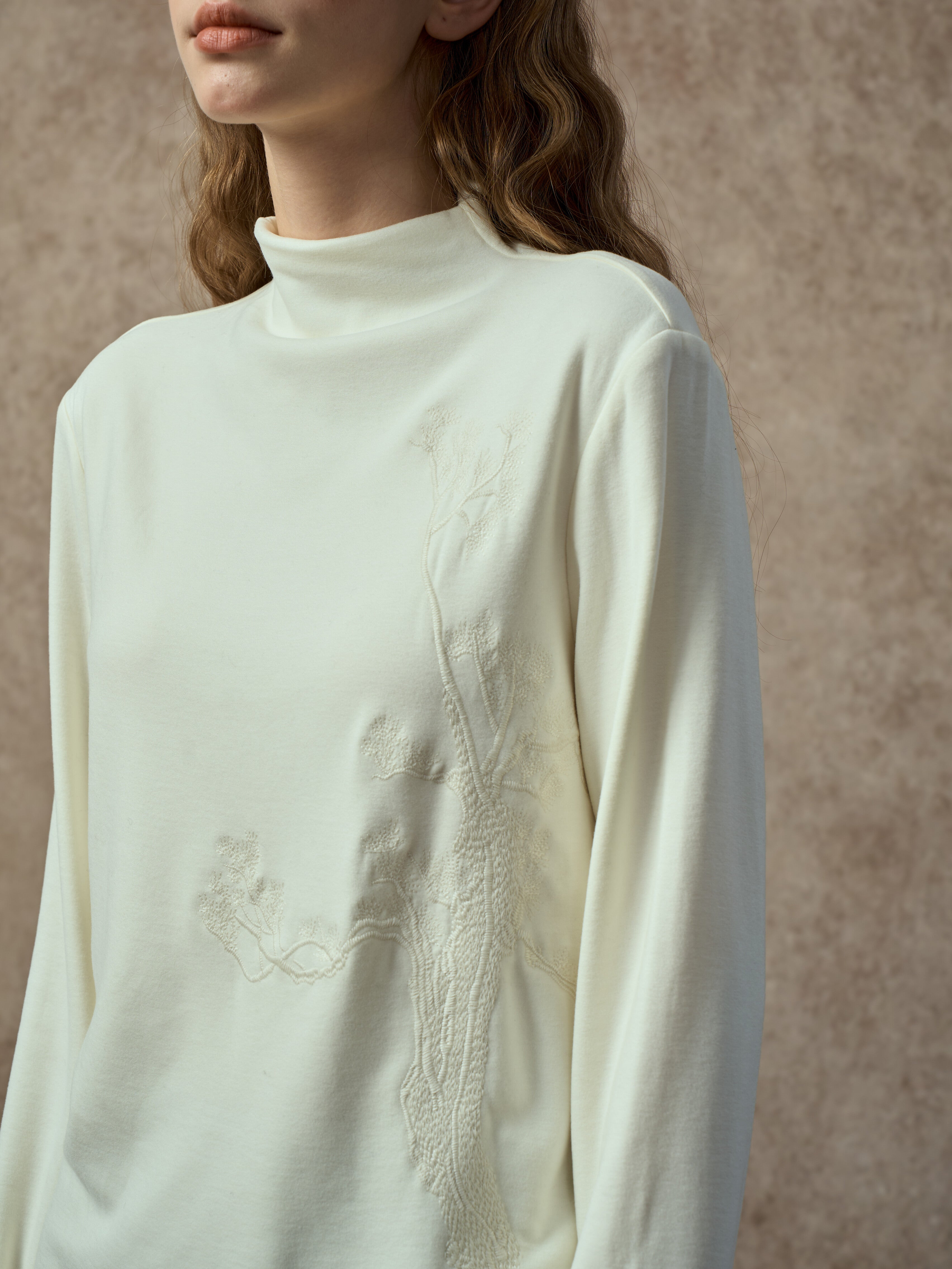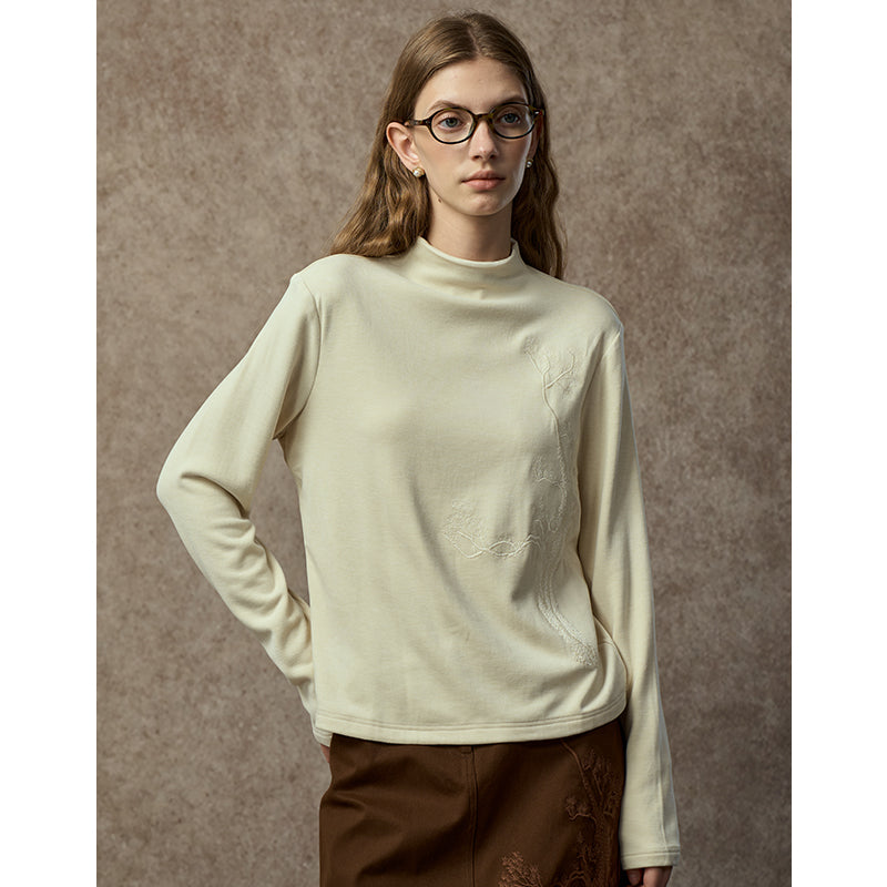 A slim‑fit long sleeve top with Song‑inspired pine embroidery. Made from plush stretch fabric, it’s soft, lightweight, and warm. The semi‑high mock neck and raised embroidery add refined detail, perfect for layering or wearing solo.