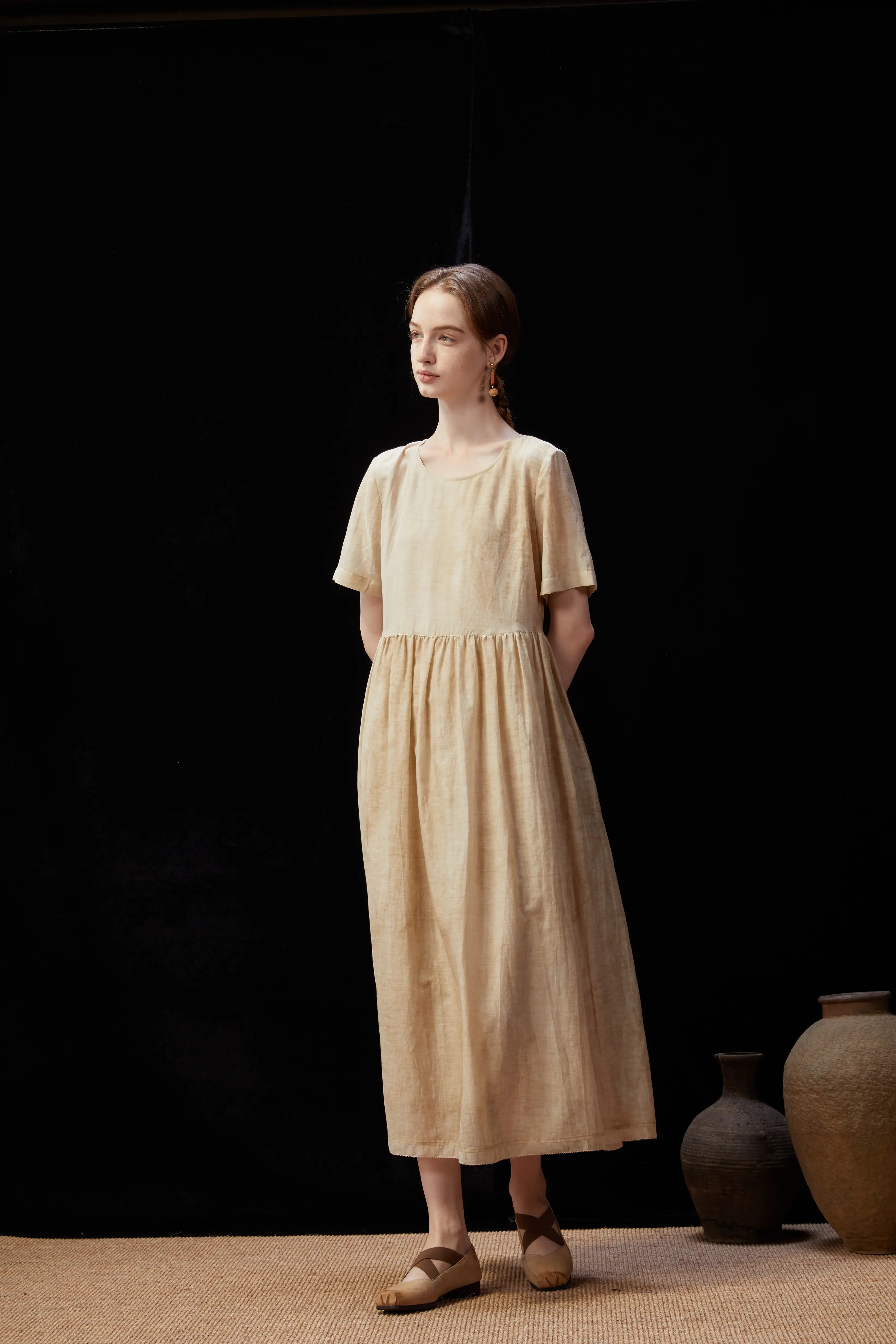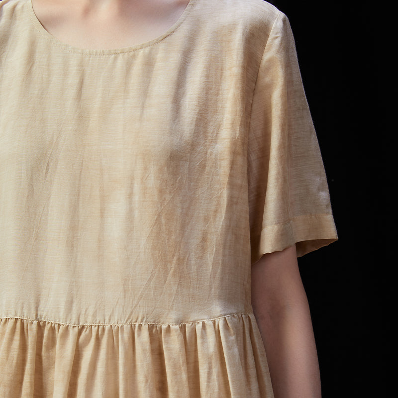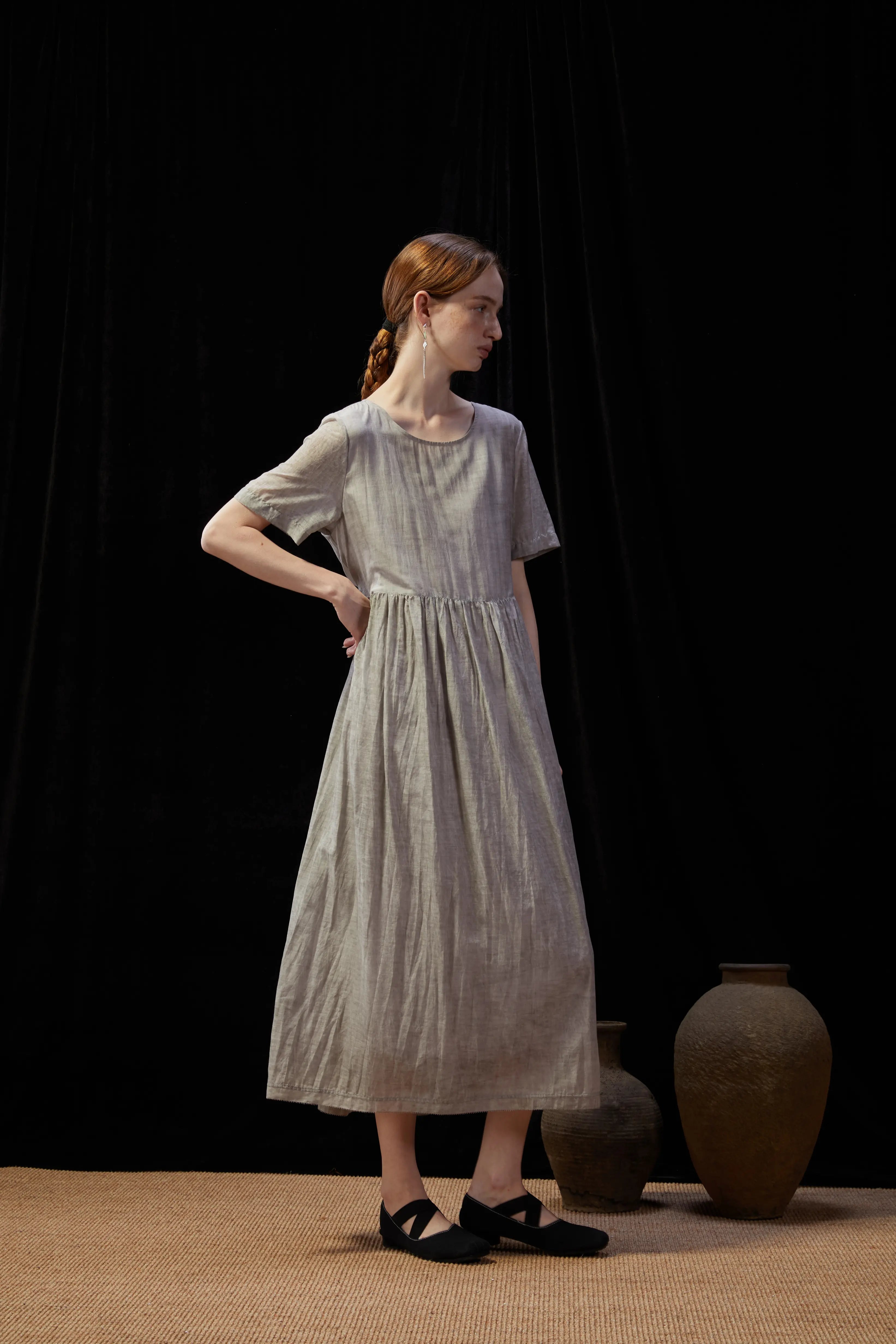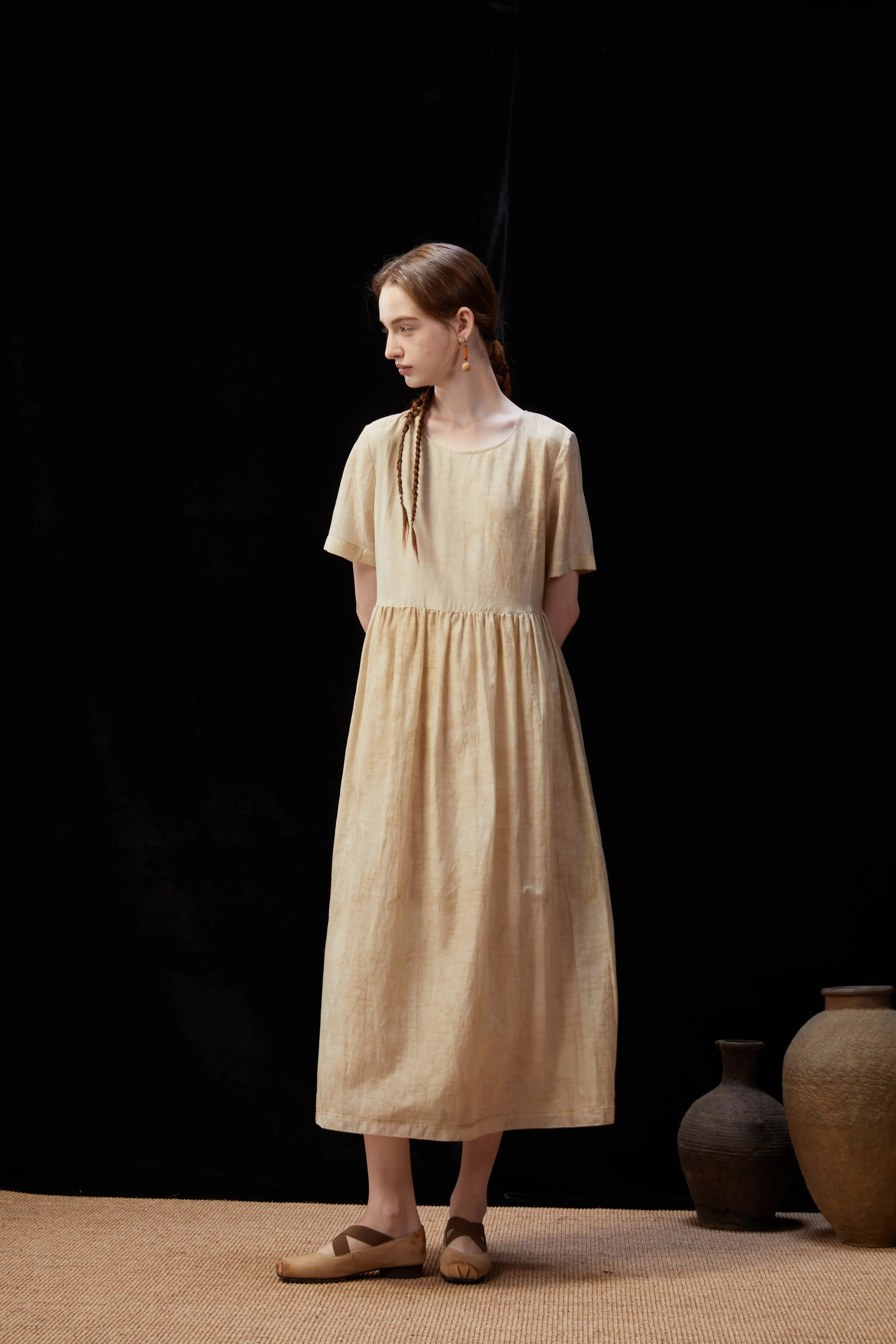 This vintage silk–cotton dress is soft, airy, and effortlessly elegant. With a round neck, relaxed fit, and gathered waist, it offers comfort and graceful movement.