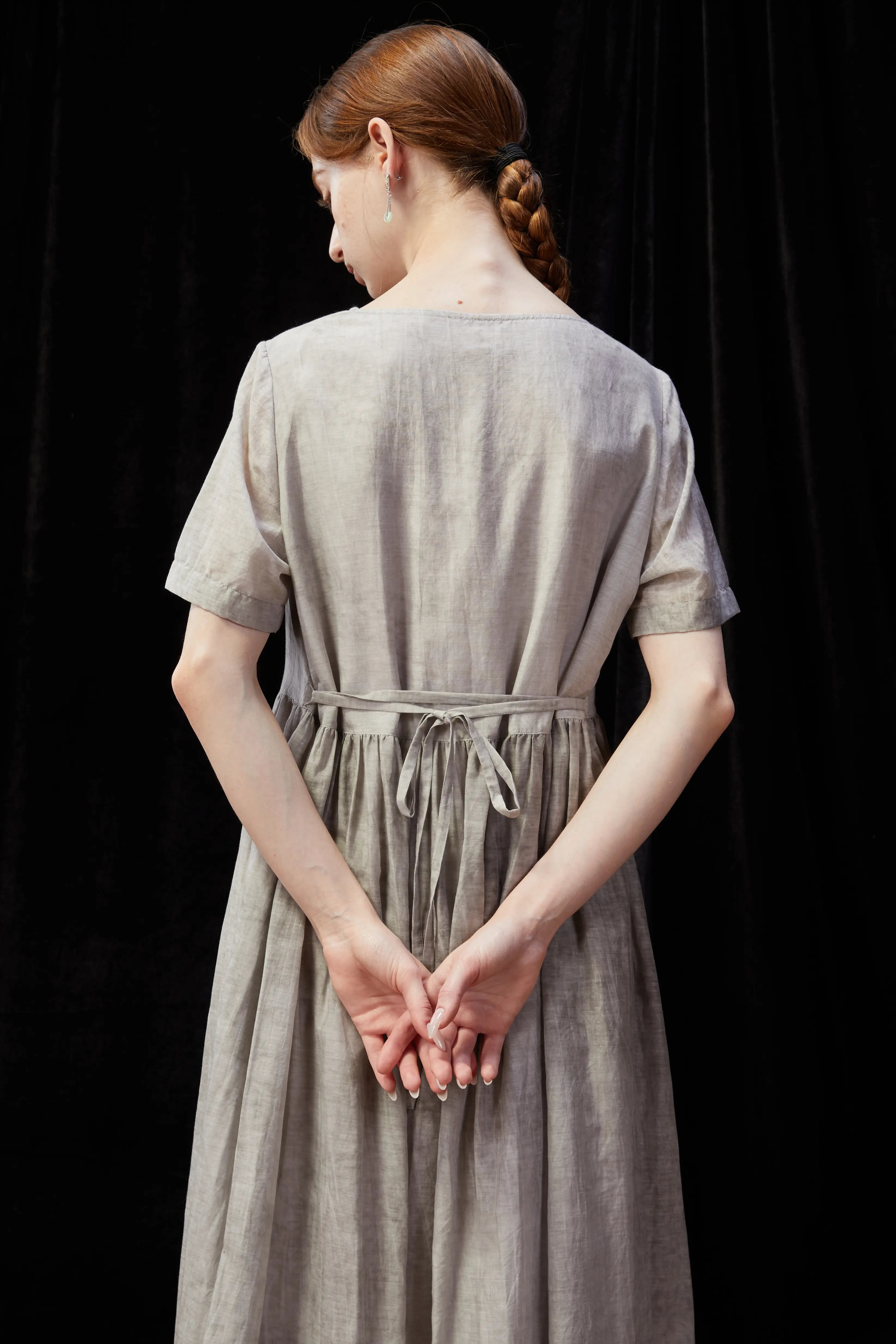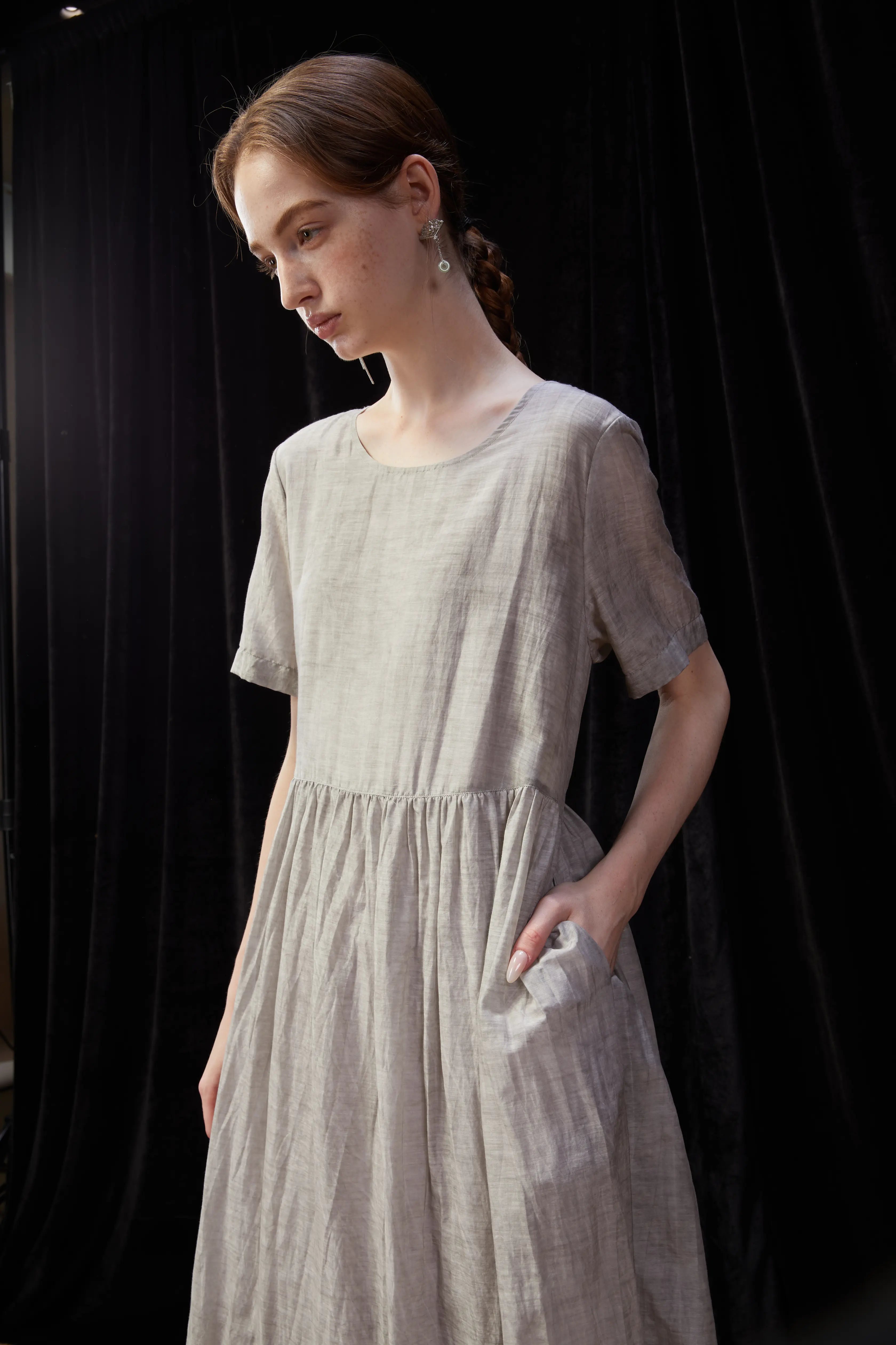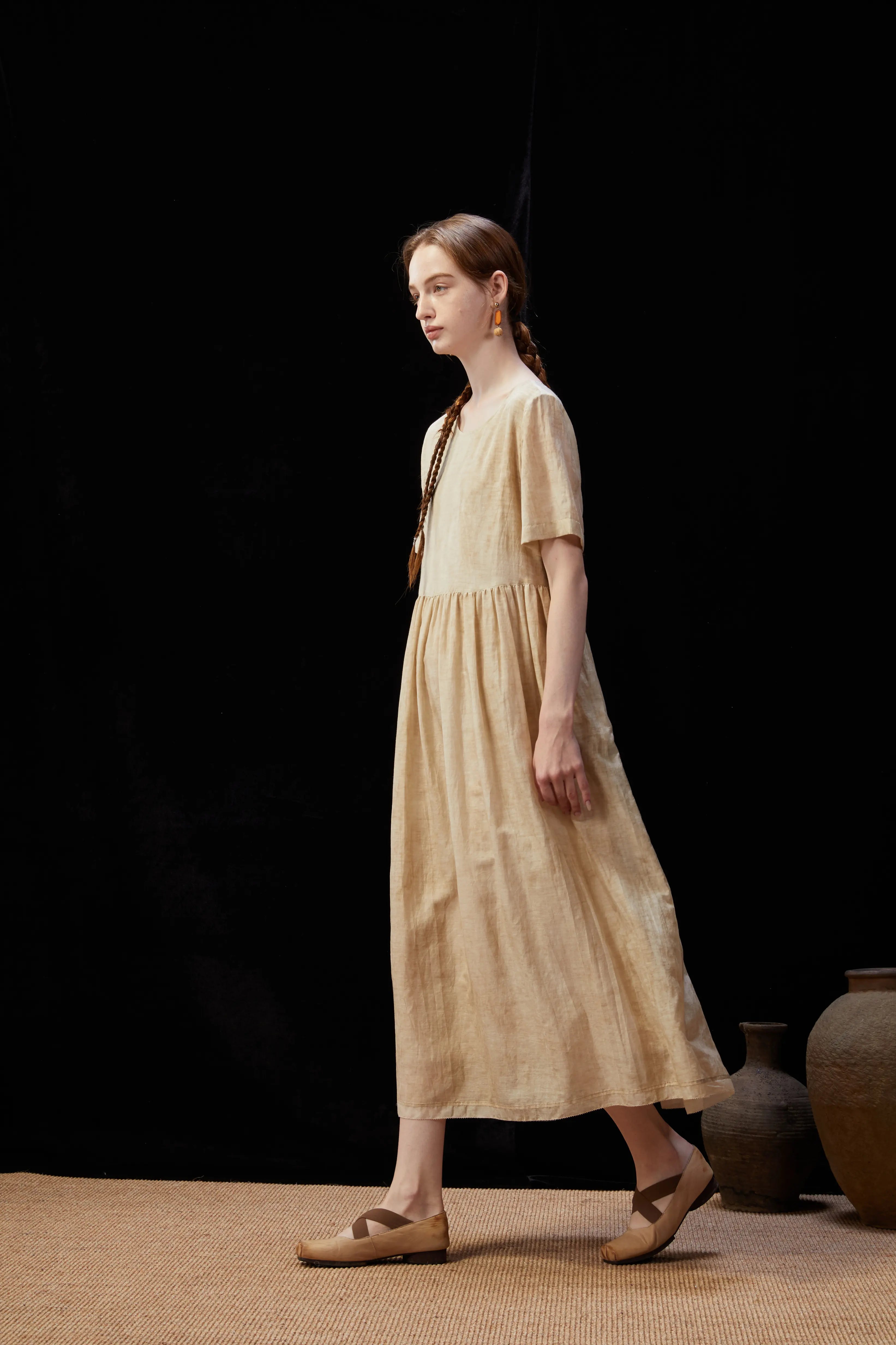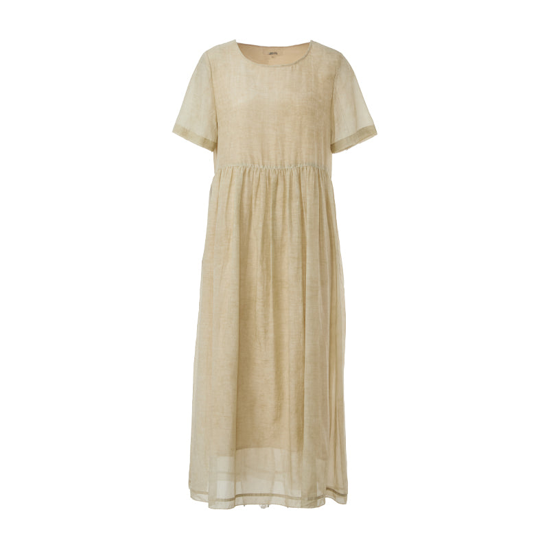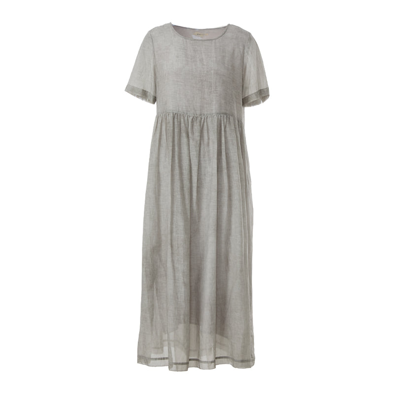 This vintage silk–cotton dress is soft, airy, and effortlessly elegant. With a round neck, relaxed fit, and gathered waist, it offers comfort and graceful movement.