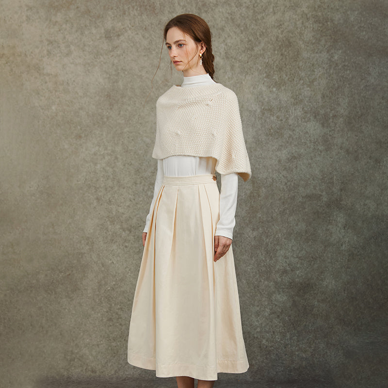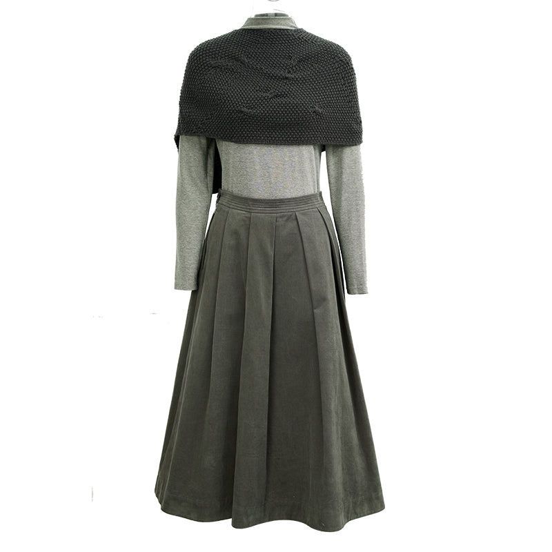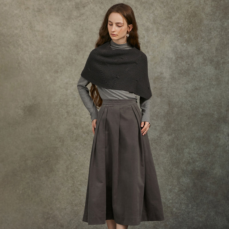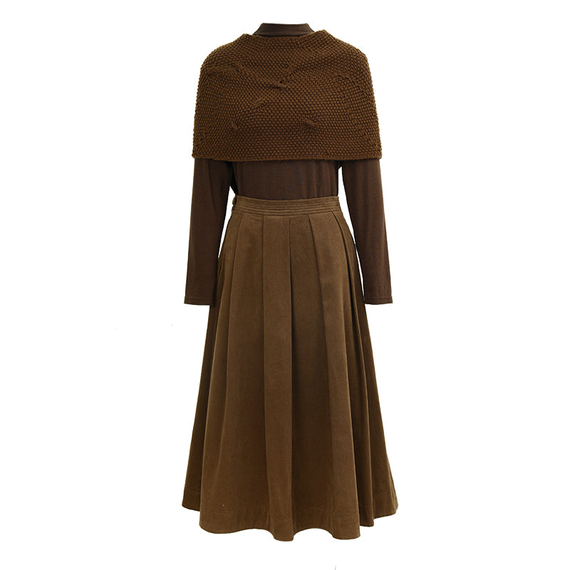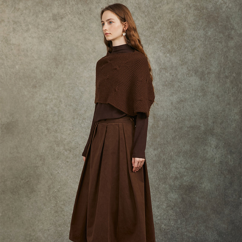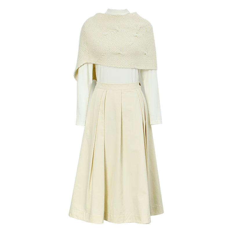 A two‑piece set featuring a textured knit pullover and a high‑waist pleated skirt. Warm, breathable, and versatile—ideal for casual days or semi‑formal occasions.